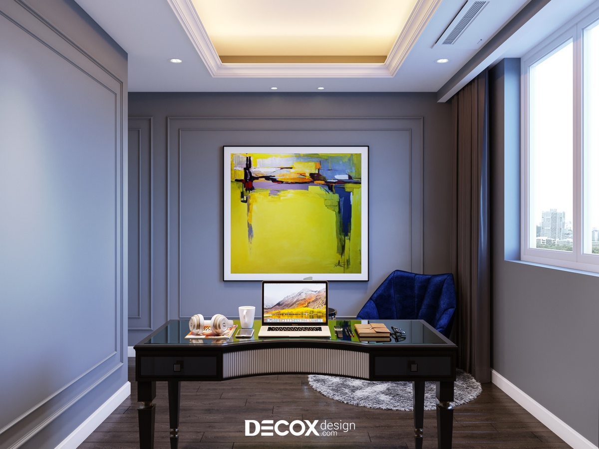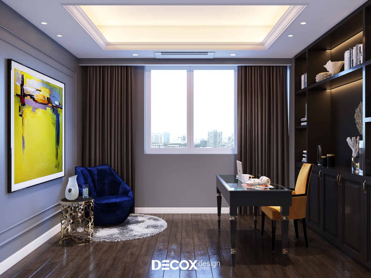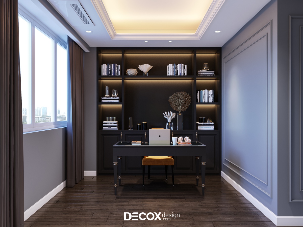 Phòng làm việc thiết kế dạng kín giúp gia chủ có thể tập trung tối đa vào công việc, không bị những sự việc xung quanh tác động, làm ồn. Bố cục nội thất trong phòng chỉ đơn giản gồm hệ tủ kệ sách âm tường, bàn làm việc cùng một ghế bành thư giãn cùng một bức tranh nghệ thuật làm điểm nhấn.