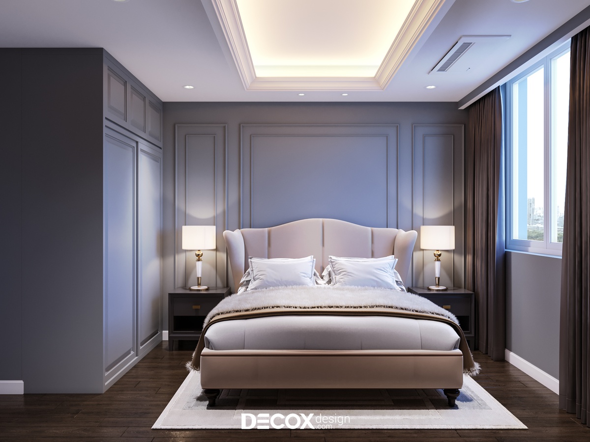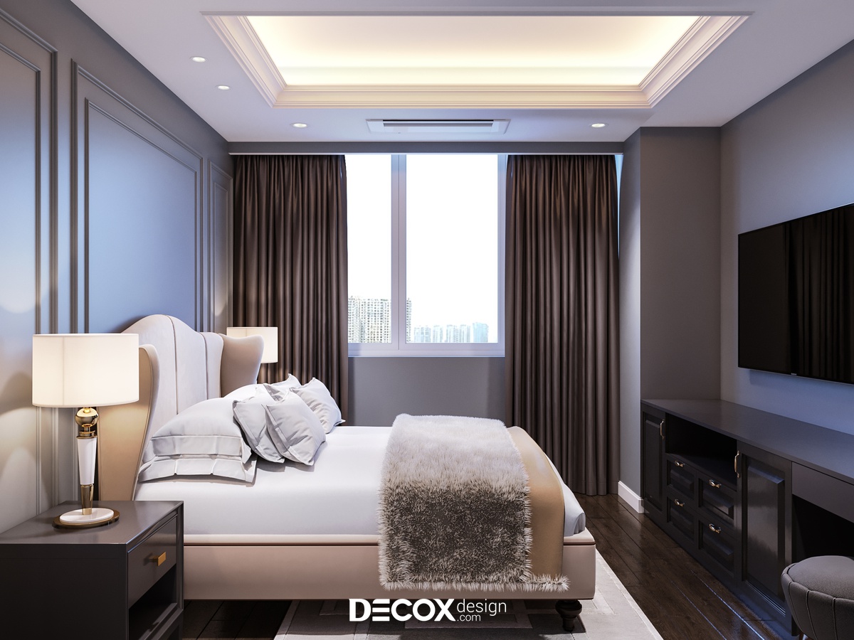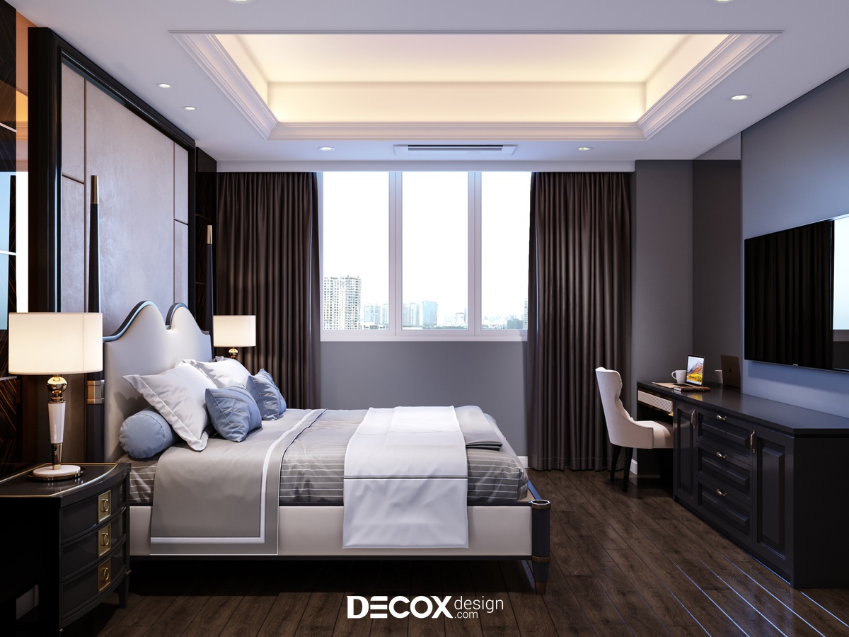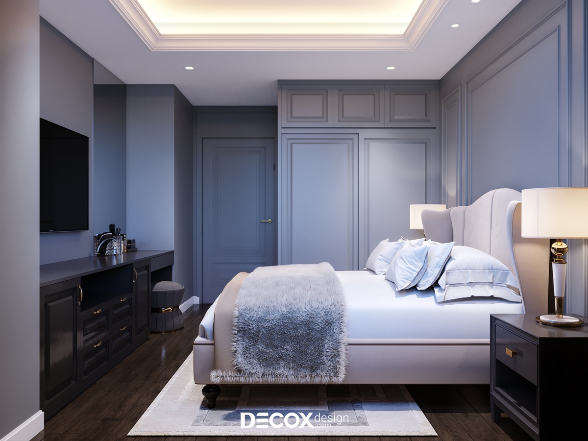 Phòng ngủ master của căn hộ được KTS áp dụng gam màu tối lạnh nhưng không vì thế mà thiếu đi tính ấm cúng bởi sự kết hợp khéo léo cùng hệ thống đèn LED vàng. Các vật dụng nội thất sử dụng trong phòng như giường, kiểu dáng tủ kệ và cả đèn ngủ đều mang phong cách cổ xưa tạo cảm giác gần gũi, thoải mái và thư giãn.