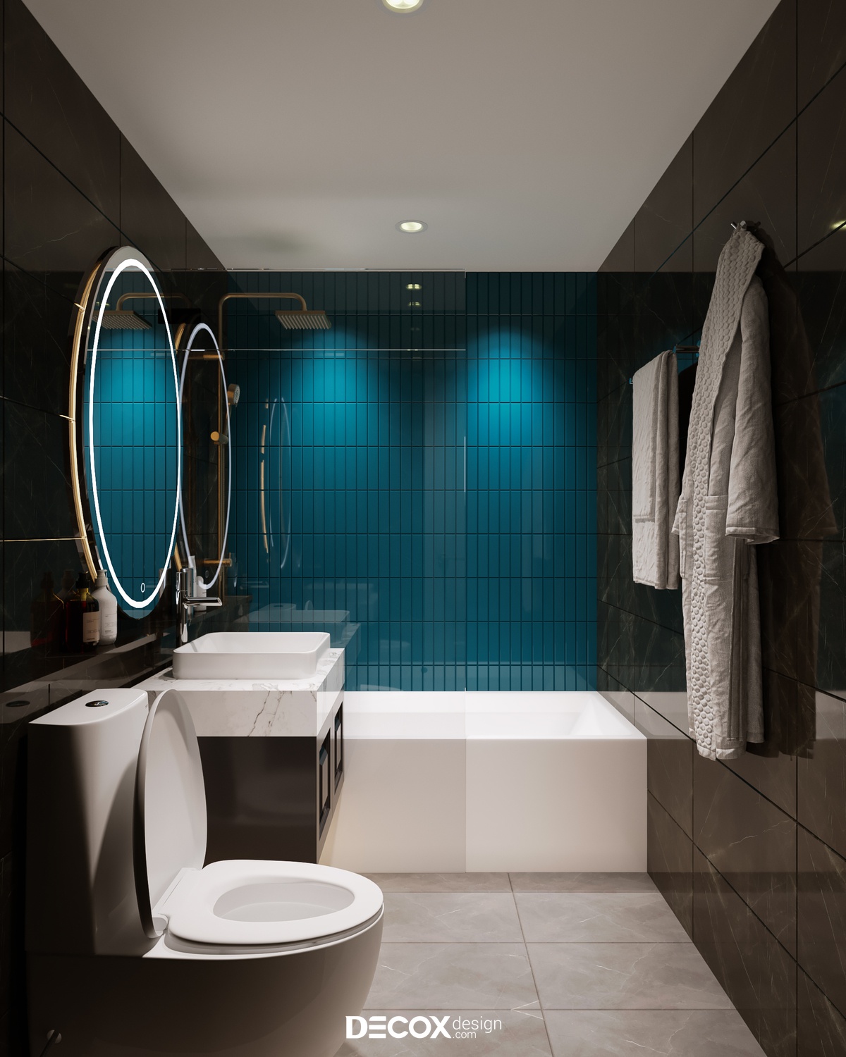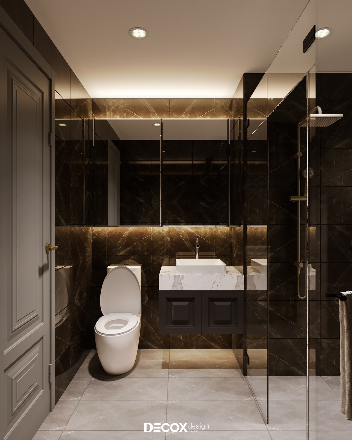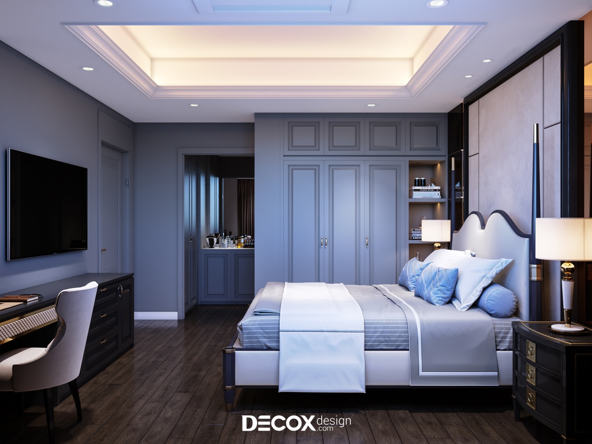Phòng ngủ master của căn hộ được KTS áp dụng gam màu tối lạnh nhưng không vì thế mà thiếu đi tính ấm cúng bởi sự kết hợp khéo léo cùng hệ thống đèn LED vàng. Các vật dụng nội thất sử dụng trong phòng như giường, kiểu dáng tủ kệ và cả đèn ngủ đều mang phong cách cổ xưa tạo cảm giác gần gũi, thoải mái và thư giãn.
