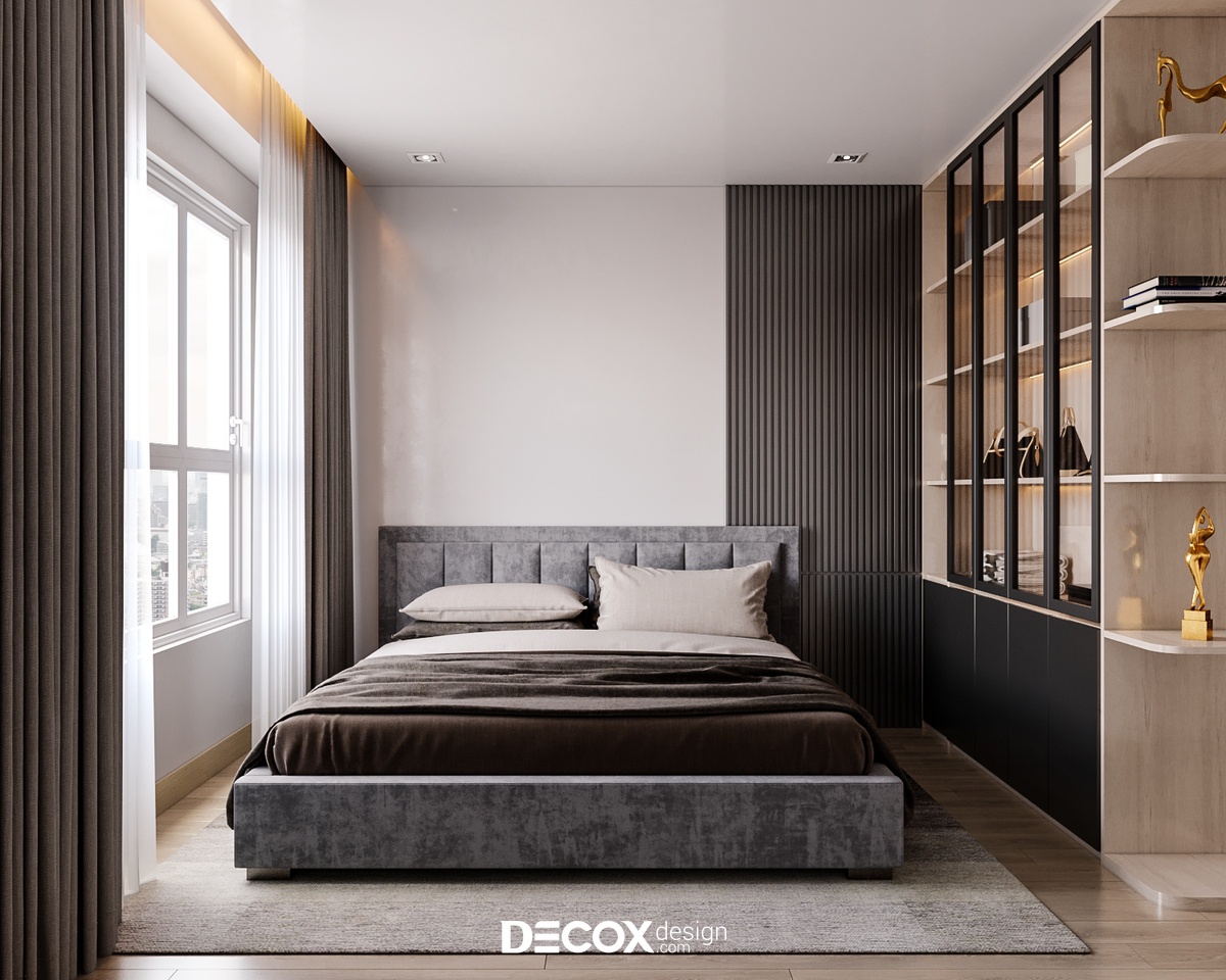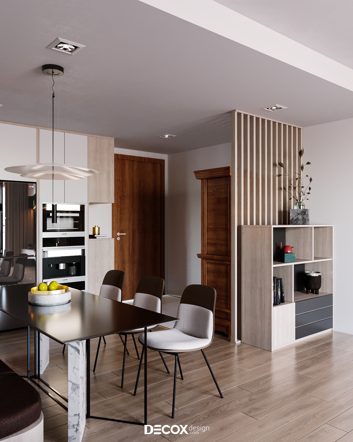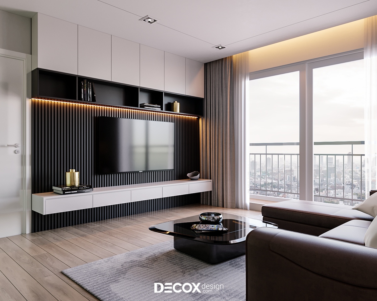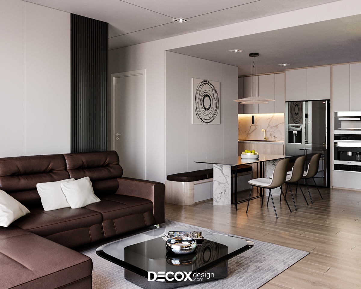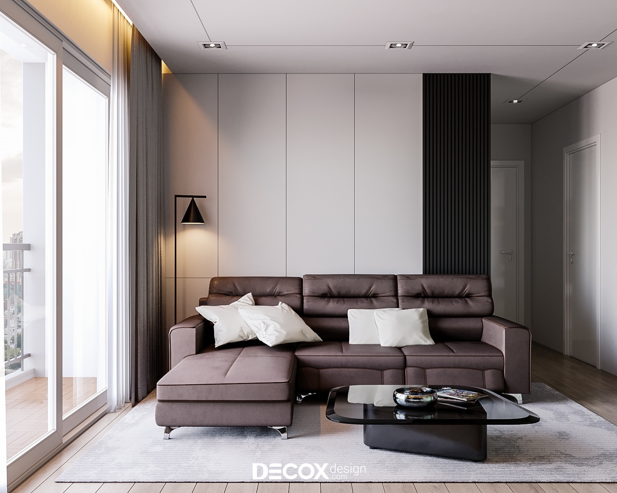 Căn hộ được chủ đầu tư thiết kế nội thất chung cư theo phong cách Hiện đại với gam màu trung tính làm chủ đạo kết hợp cùng những đường thẳng khỏe khoắn dứt khoát tạo nên không gian mạnh mẽ, trẻ trung. Ngoài ra KTS của Decox Design còn ứng dụng những vật liệu da, gỗ màu tối, đá tự nhiên,... cho tổng thể không gian khoát lên vẻ đẹp sang trọng và vững chãi.