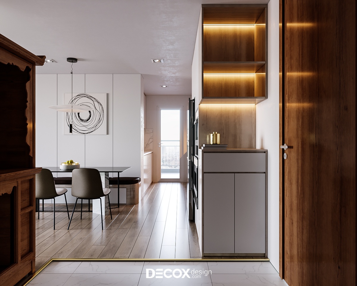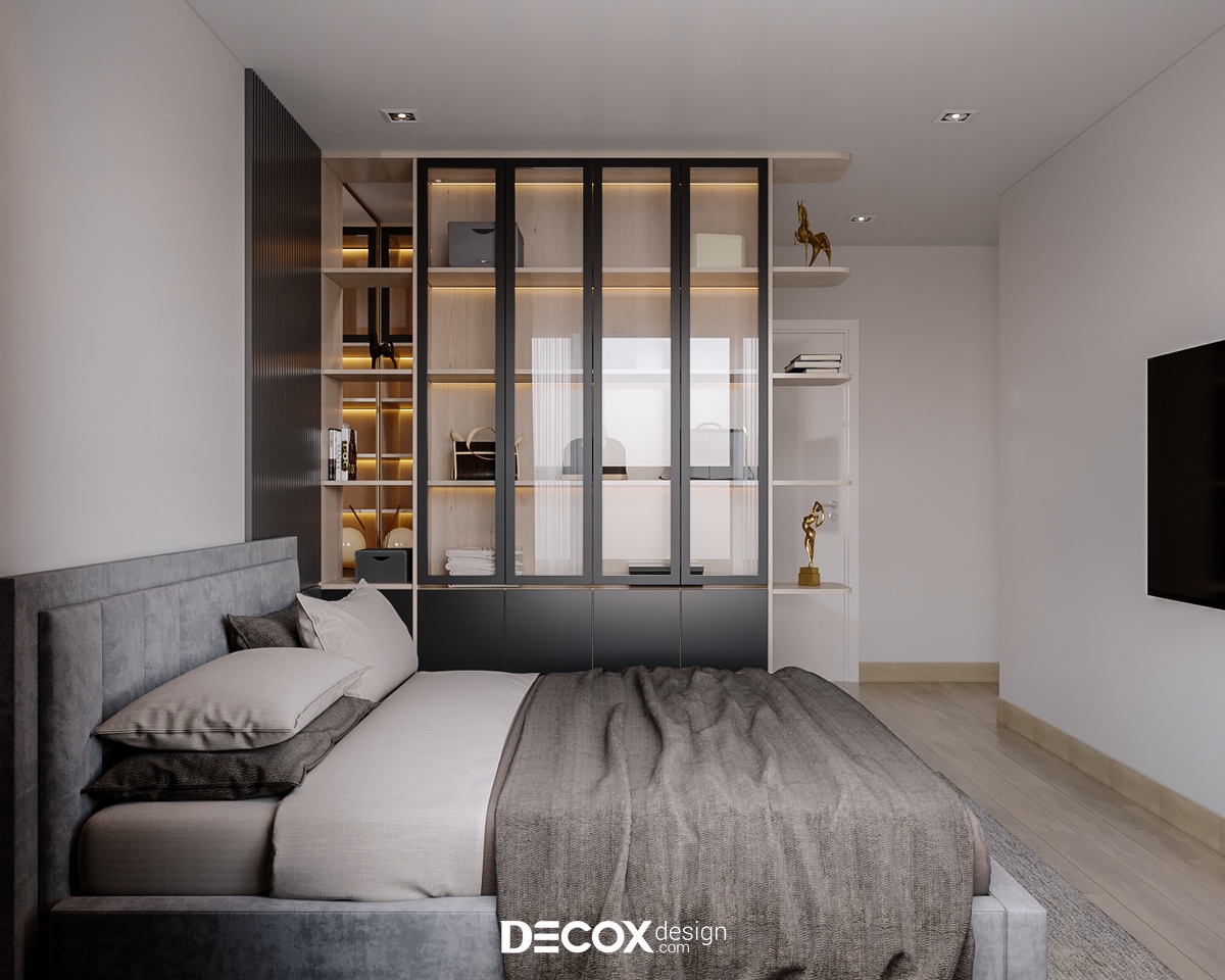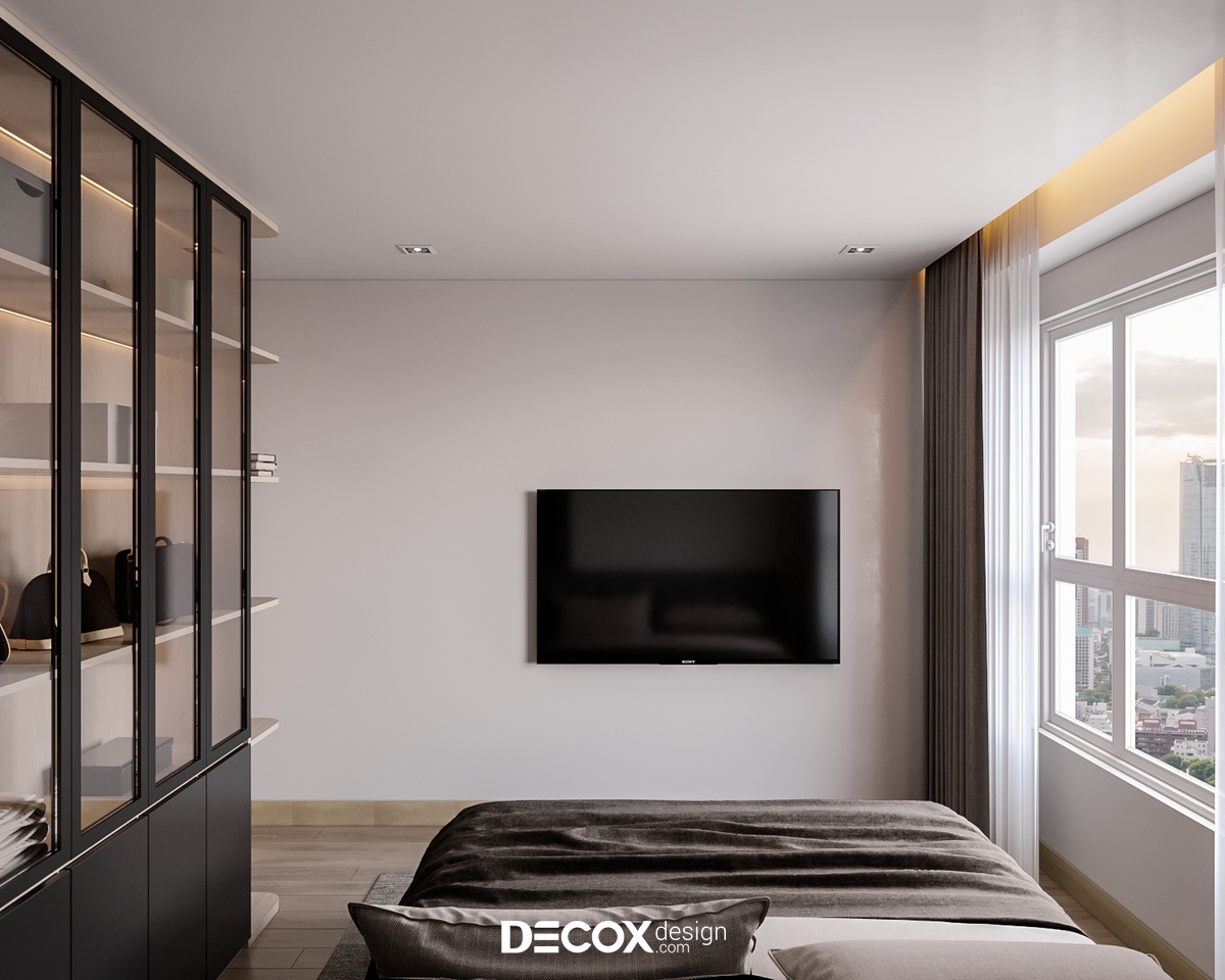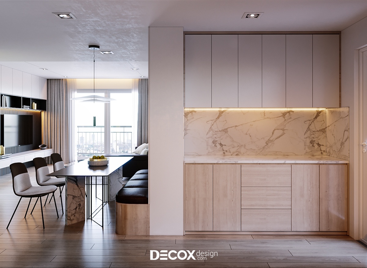 Căn hộ được chủ đầu tư thiết kế nội thất chung cư theo phong cách Hiện đại với gam màu trung tính làm chủ đạo kết hợp cùng những đường thẳng khỏe khoắn dứt khoát tạo nên không gian mạnh mẽ, trẻ trung. Ngoài ra KTS của Decox Design còn ứng dụng những vật liệu da, gỗ màu tối, đá tự nhiên,... cho tổng thể không gian khoát lên vẻ đẹp sang trọng và vững chãi.