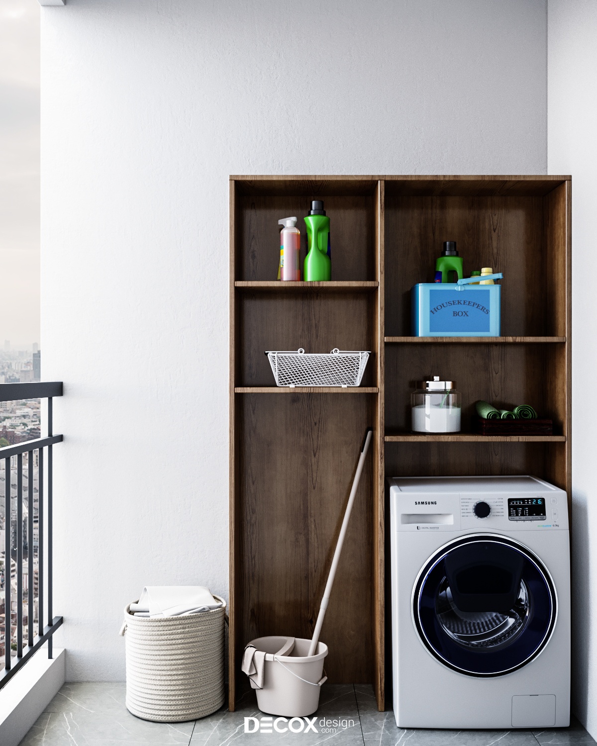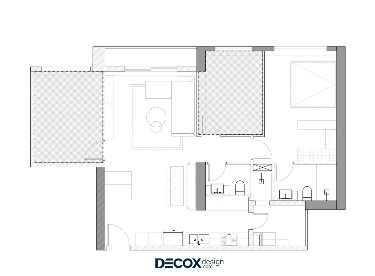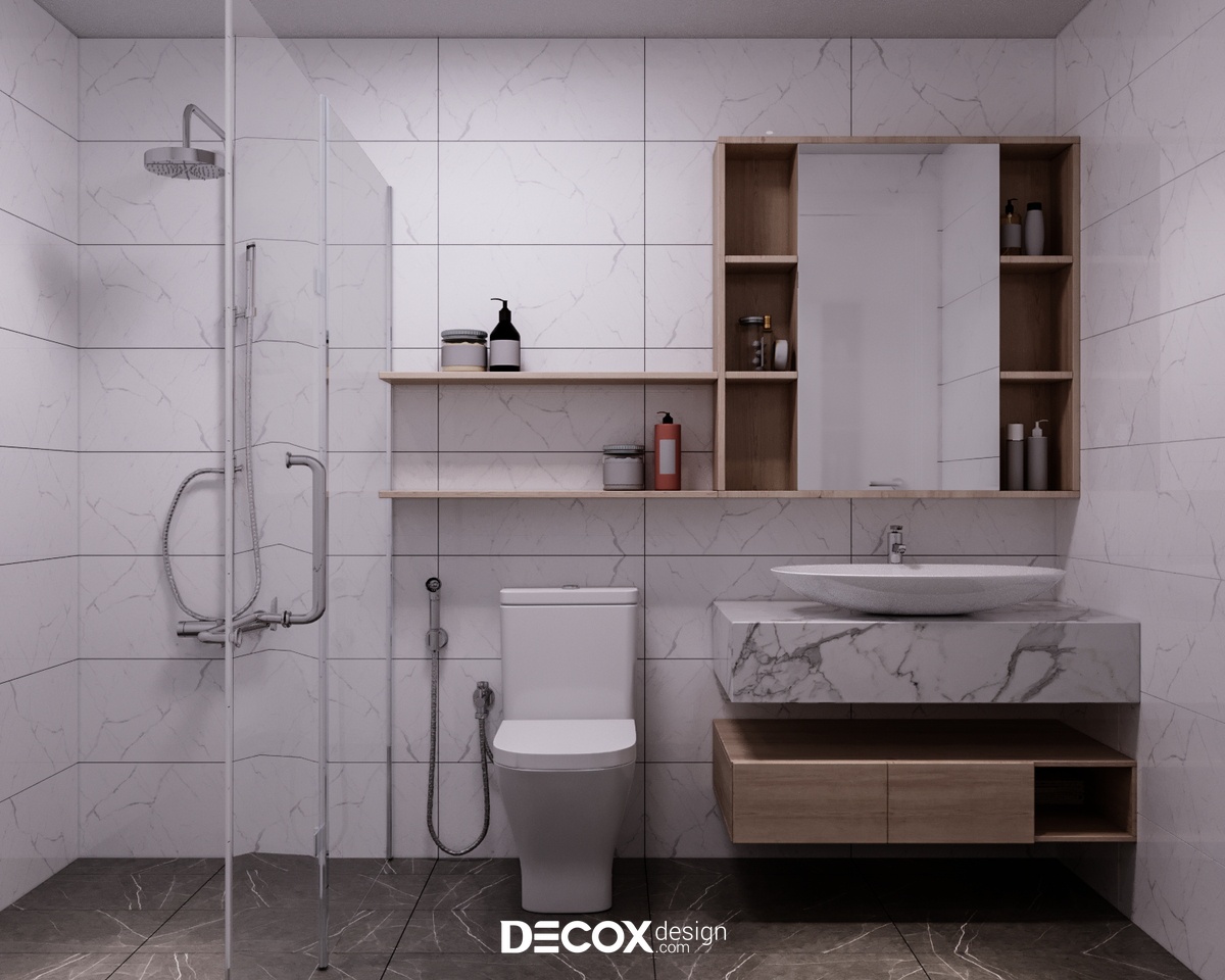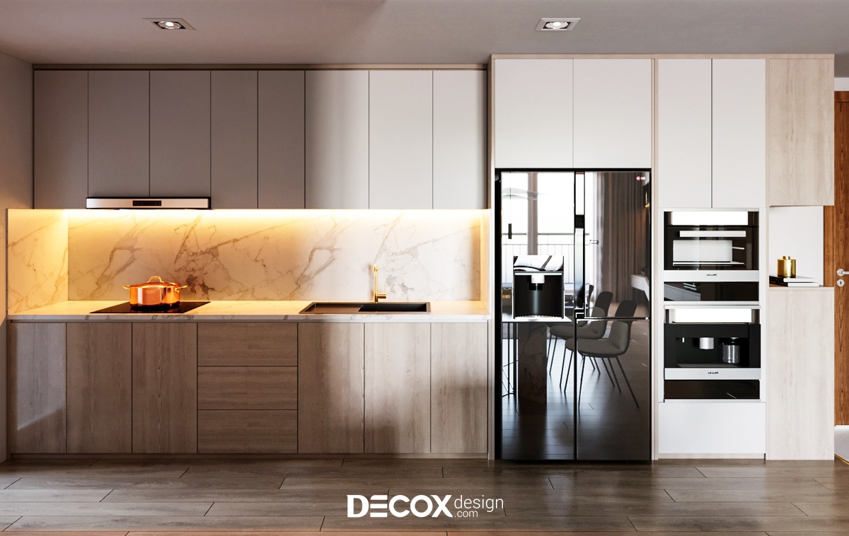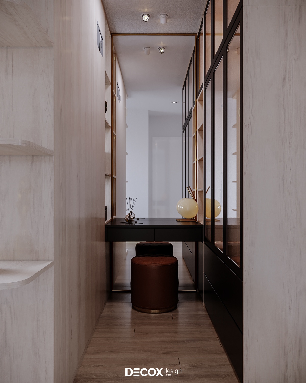 Căn hộ được chủ đầu tư thiết kế nội thất chung cư theo phong cách Hiện đại với gam màu trung tính làm chủ đạo kết hợp cùng những đường thẳng khỏe khoắn dứt khoát tạo nên không gian mạnh mẽ, trẻ trung. Ngoài ra KTS của Decox Design còn ứng dụng những vật liệu da, gỗ màu tối, đá tự nhiên,... cho tổng thể không gian khoát lên vẻ đẹp sang trọng và vững chãi.