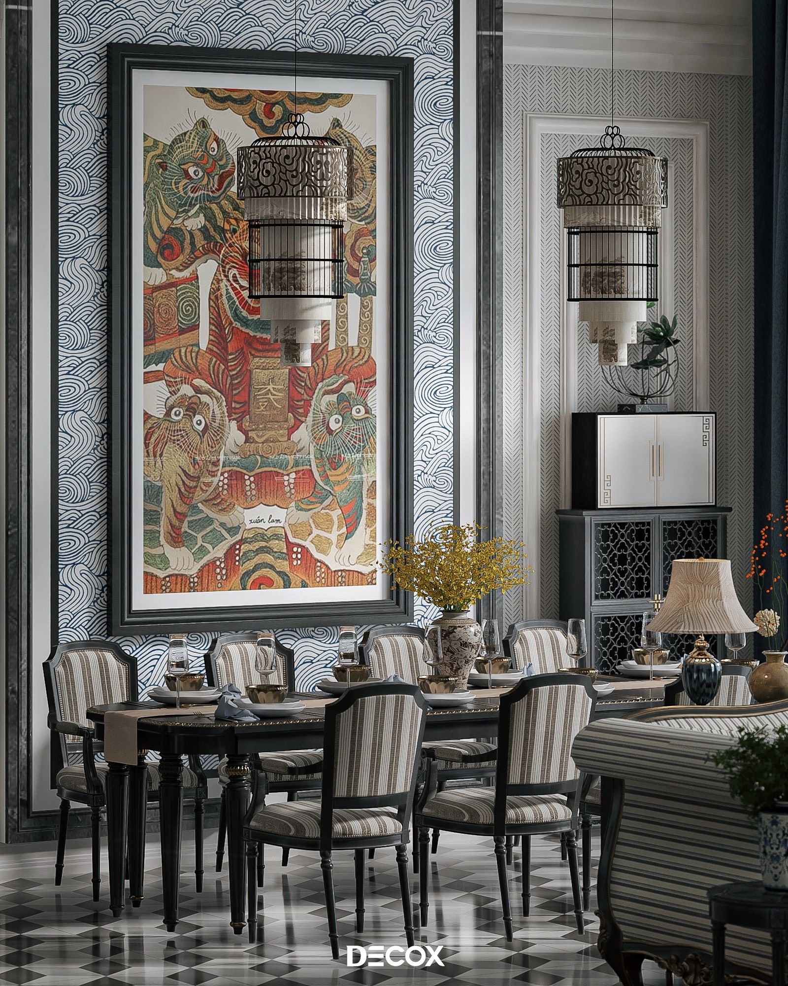 Với khu vực phòng ăn, chắc hẳn điểm nhấn ấn tượng nhất không phải bộ bàn ăn “hoành tráng” hay hệ đèn thả trần kiểu cách mà là bức tranh Đông Hồ mang đậm bản sắc văn hóa dân gian. Không chỉ đơn thuần là điểm nhấn trang trí, thu hút ánh nhìn mà mỗi chi tiết đều có ngụ ý và câu chuyện bên trong. Đó là biểu tượng mây - nguồn gốc rồng tiên, đó là hình tượng rồng, hổ mang ngụ ý quyền uy, giàu sang, phú quý. Nhìn chung, tất cả các yếu tố từ chất liệu, màu sắc và nội thất sử dụng trong không gian phòng ăn đã mang đến một tổng thể hài hòa giữa cảm xúc Á Đông, kỹ thuật Tây Phương và sắc màu của nghệ thuật phương Đông.