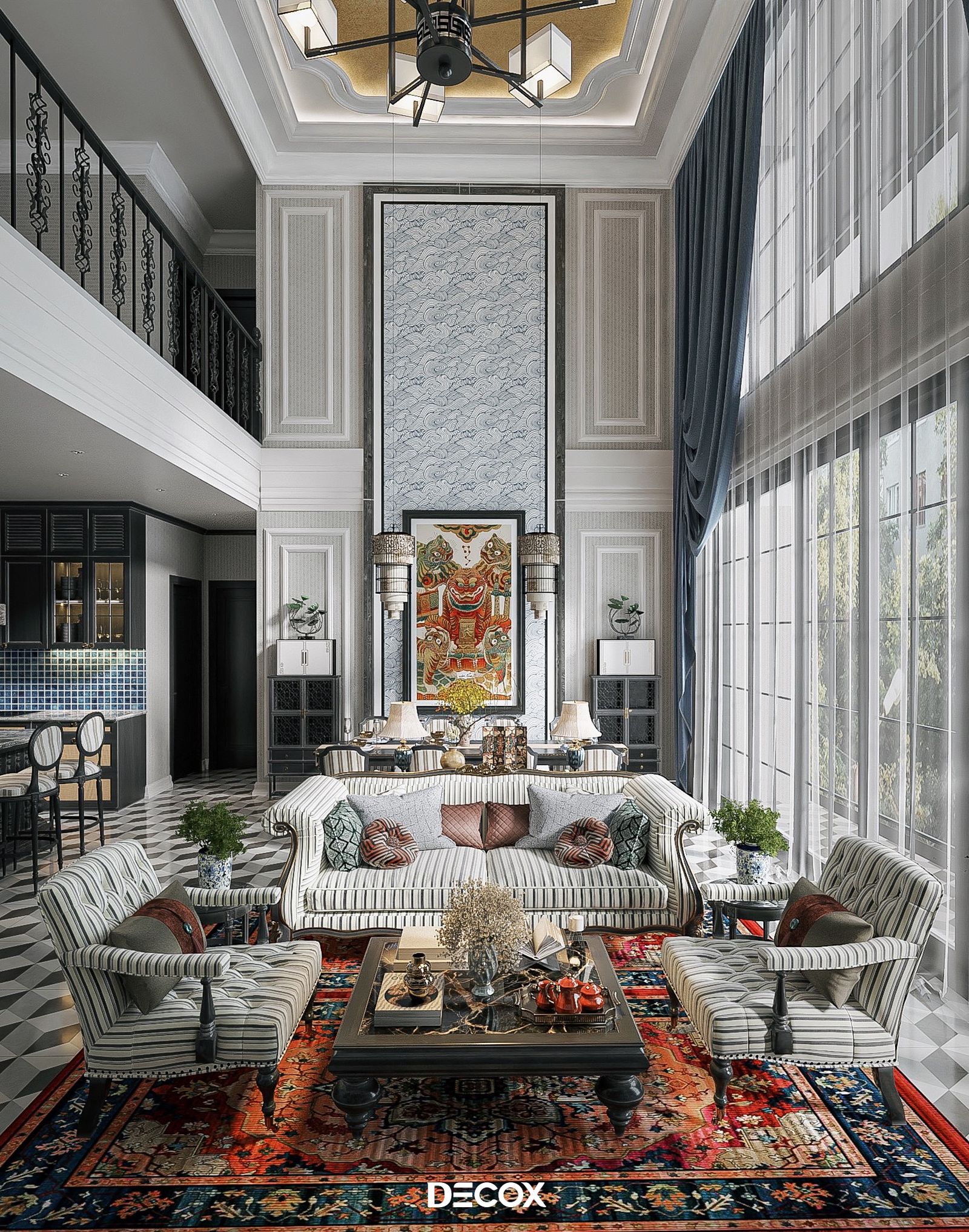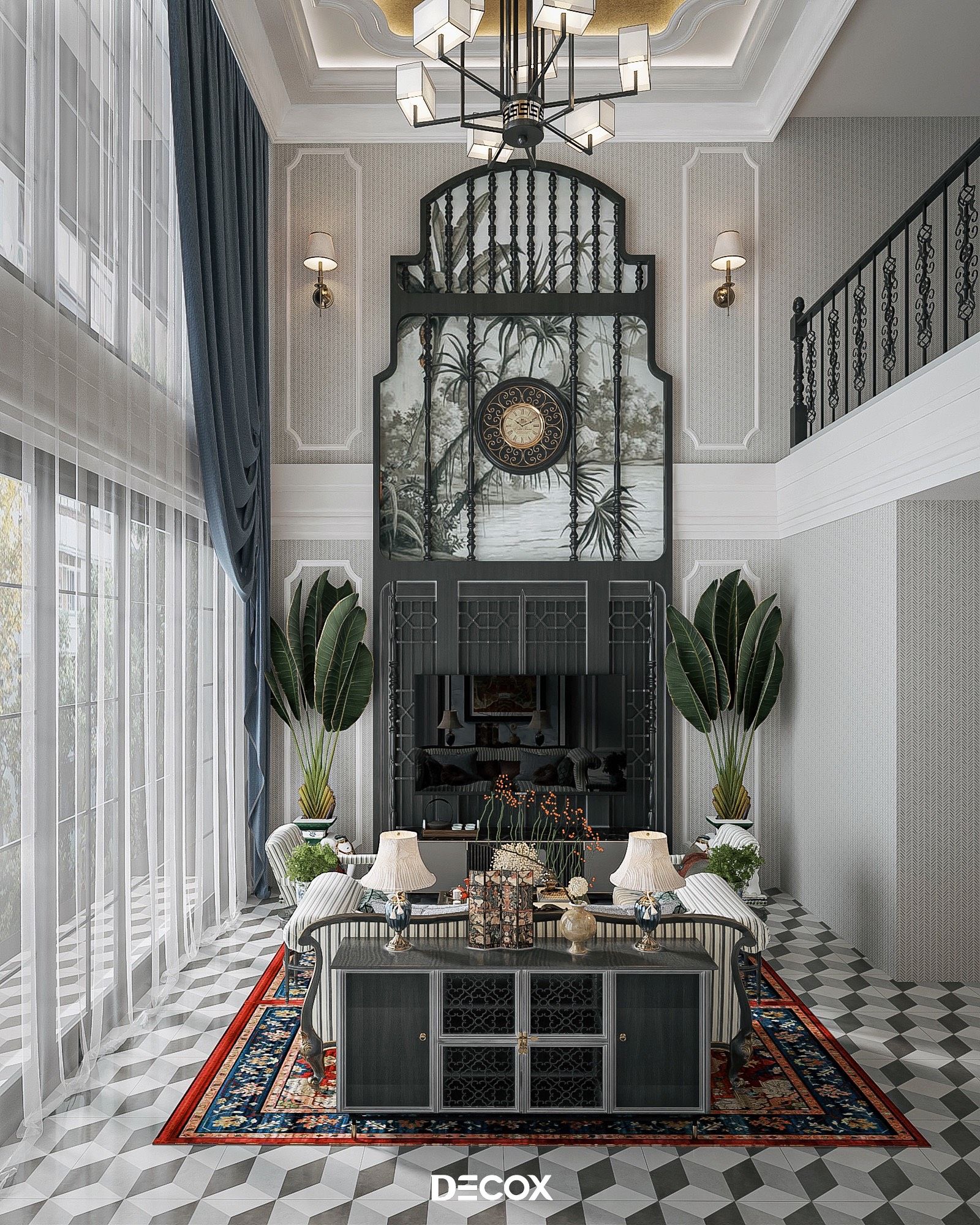 Nét đẹp văn hóa Đông - Tây được thể hiện rõ nét qua không gian phòng khách Duplex. Sự kết hợp “vừa đủ” giữa âm hưởng hoài cổ - hiện đại, thẩm mỹ - công năng sẽ là tiền đề cho một không gian sống thời thượng nhưng không làm mất đi vẻ đẹp nguyên bản của phong cách Indochine. Tổng thể phòng khách là một bản giao hưởng đầy màu sắc, rực rỡ và sống động với sự góp mặt đan xen của các gam màu nóng - lạnh trên nền trung tính chủ đạo. Trọn vẹn công năng khu vực phòng khách như được gói gọn bên trong chiếc thảm trải sàn màu sắc rực rỡ với họa tiết thổ cẩm được đan dệt thủ công đậm chất Việt. Bên cạnh những yếu tố đã quá đỗi quen thuộc, đặc trưng của thiết kế Indochine như con tiện, họa tiết kỷ hàm gạch bông, chất liệu gốm sứ, cây vùng nhiệt đới… thì chất hiện đại Tây phương cũng được áp dụng triệt để nhằm cân bằng giữa nét mới - cũ, đem lại diện mạo hoàn toàn mới cho không gian trên nền phong cách nguyên bản.