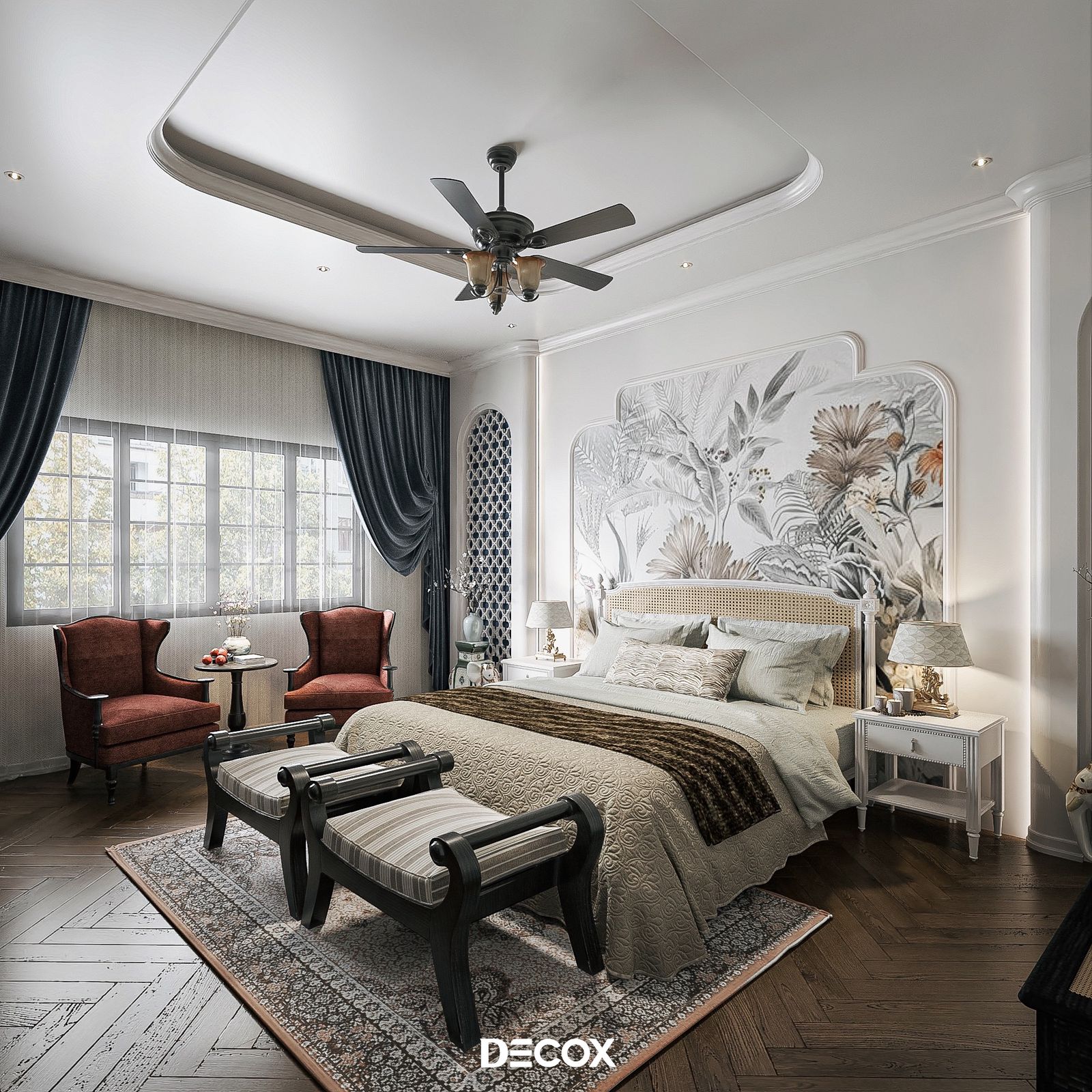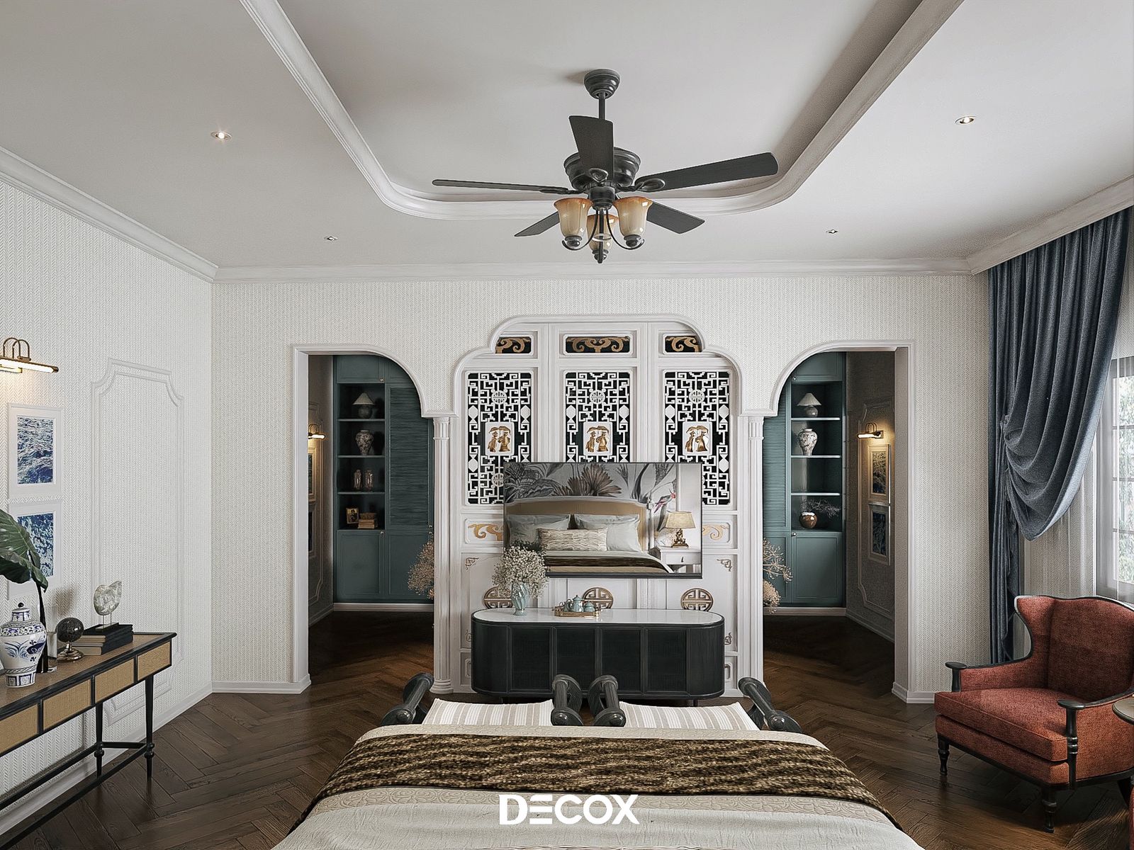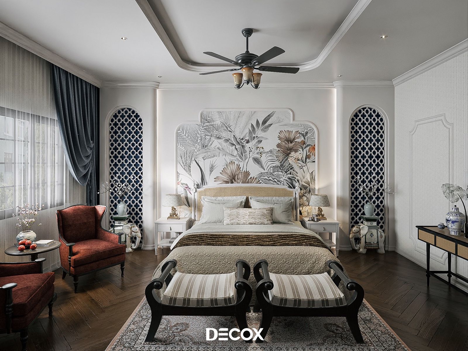 Không trầm buồn với chất gỗ chủ đạo hay không quá nổi bật với những gam màu đặc trưng của vùng nhiệt đới, không gian phòng ngủ master mang đến phong vị sang trọng, tinh tế với sắc trắng nhẹ nhàng đóng vai trò chủ đạo. Không chỉ mang trong mình sức hút sang trọng, đậm chất Tây phương, gam trắng còn là phông nền hoàn hảo để làm bật lên cái hồn phong cách Indochine. Đó là bức tranh nhiệt đới nơi đầu giường, quạt trần, hoạ tiết kỷ hà, mắc lưới đặc trưng chỉ có trong thiết kế Indochine.