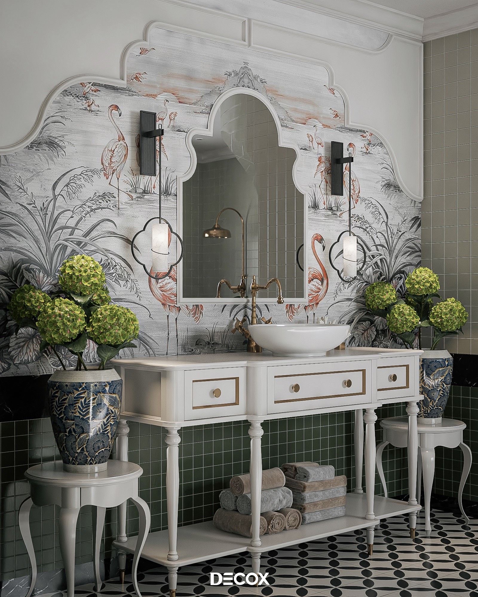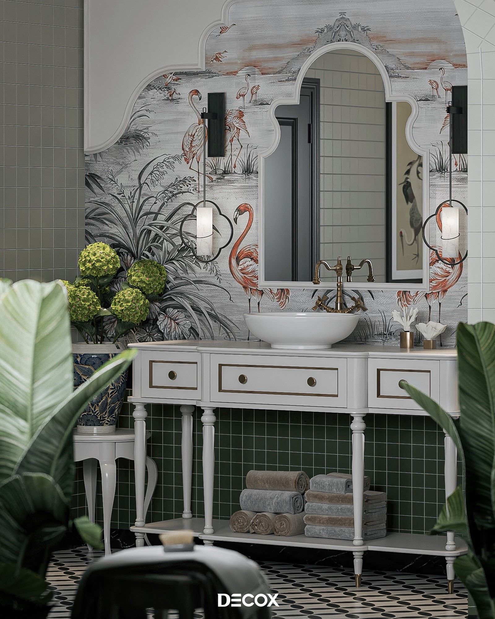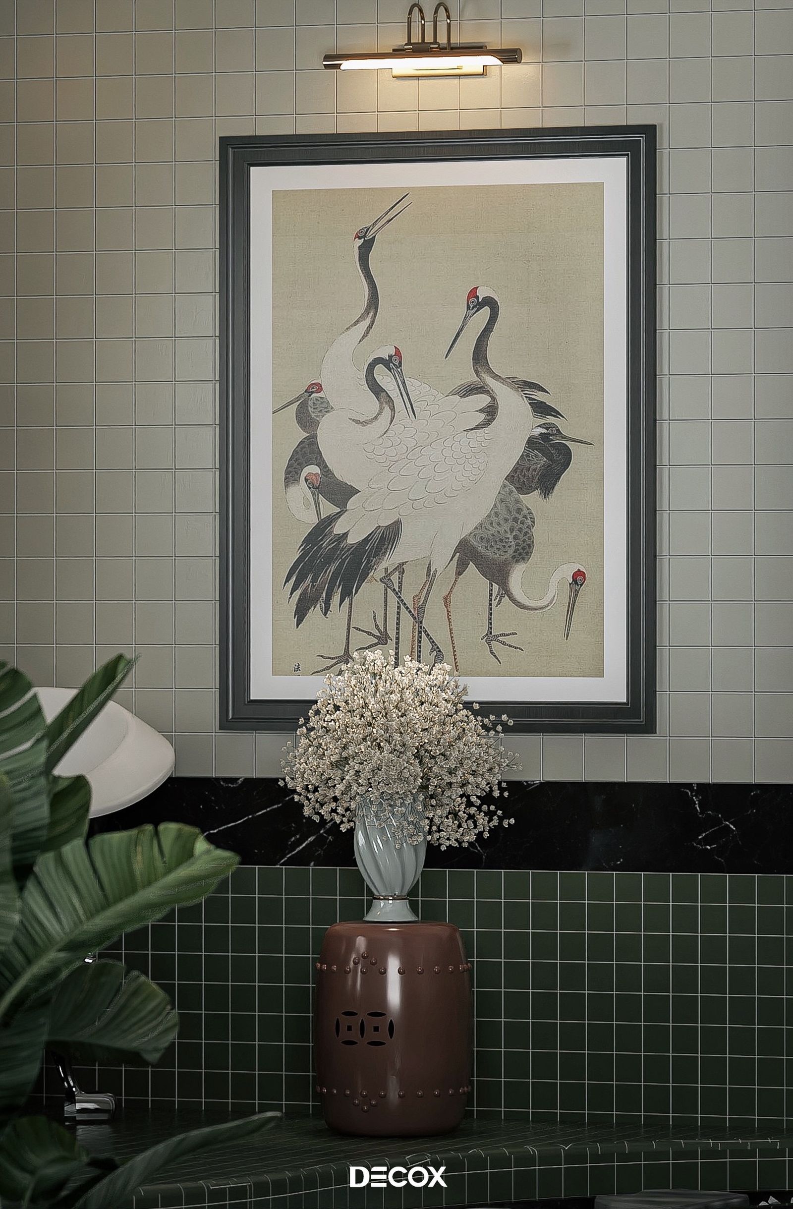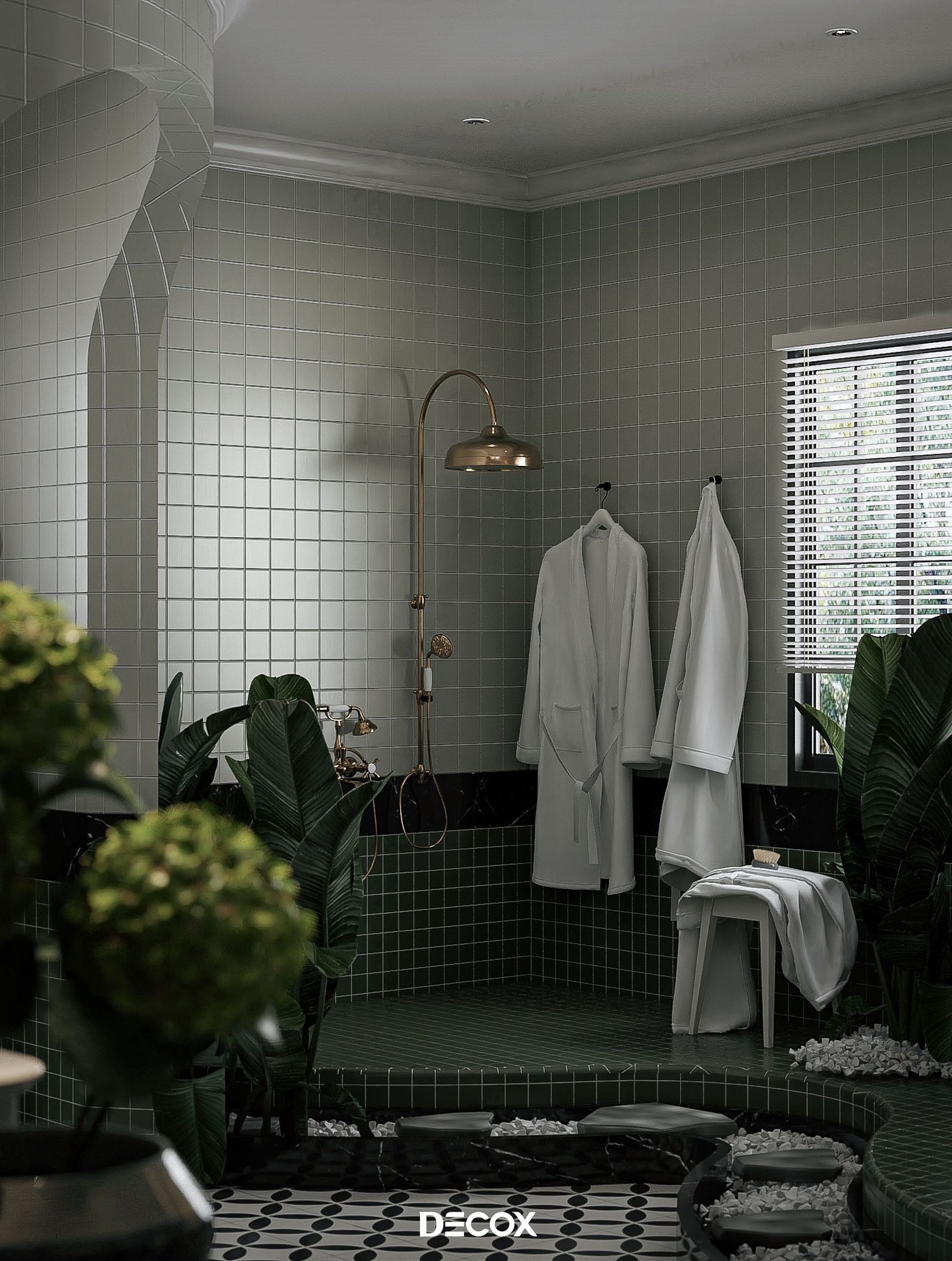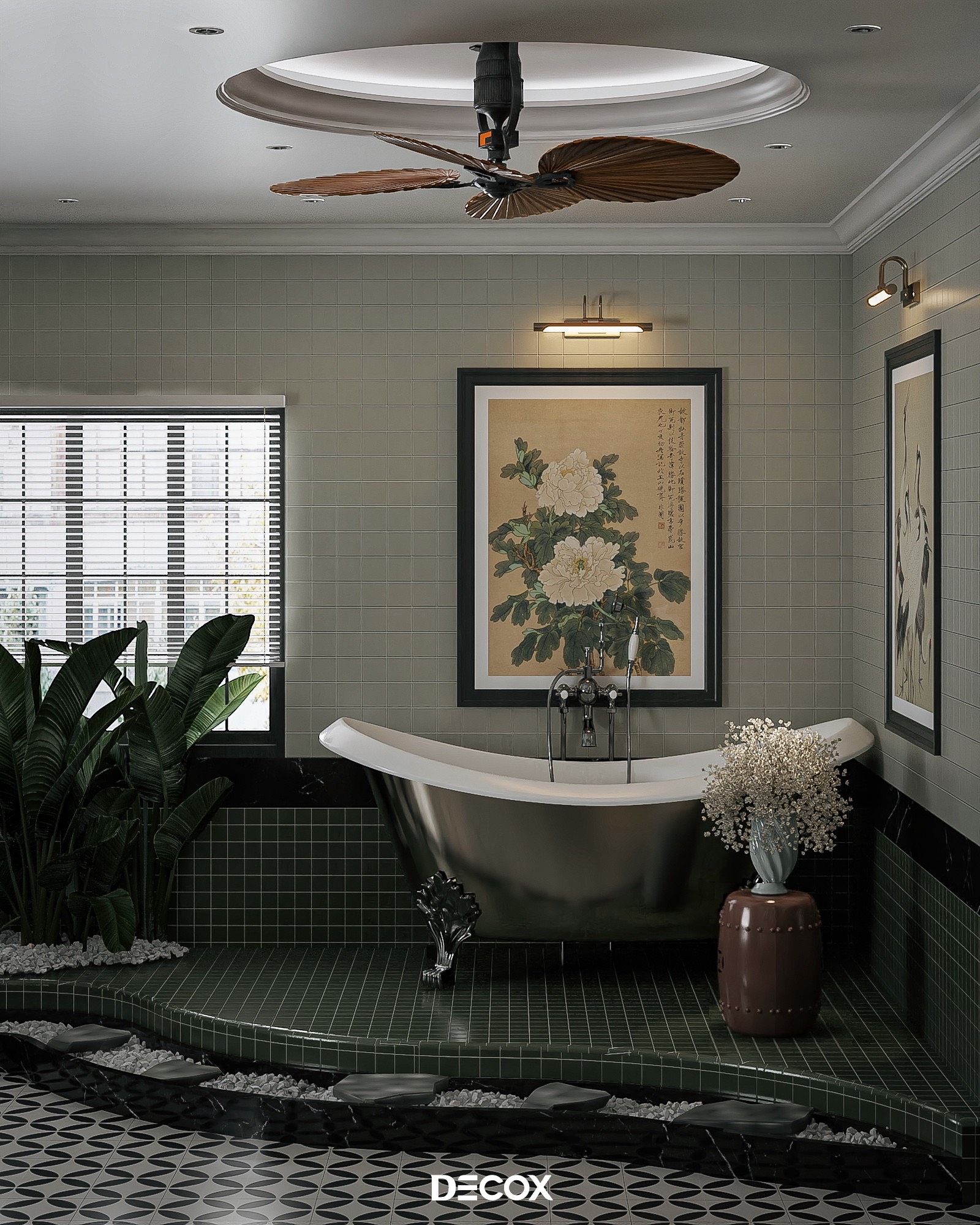 Lấy cảm hứng từ hình ảnh hoa sen và chim cò hòa điệu cùng một chút Tropical xanh mát của vùng nhiệt đới không gian phòng tắm phòng ngủ master mang đến cảm giác nhẹ nhàng, êm dịu và sống động như một bức tranh thiên nhiên đủ màu đủ sắc. Màu sắc được biến chuyển linh hoạt theo nhiều tông độ đem lại sự uyển chuyển và thanh thoát cho không gian.