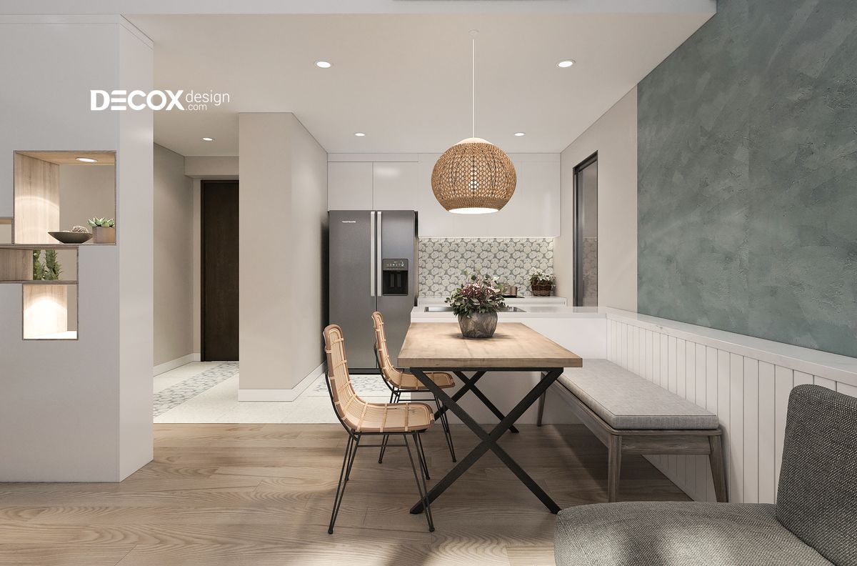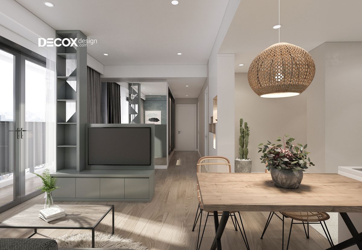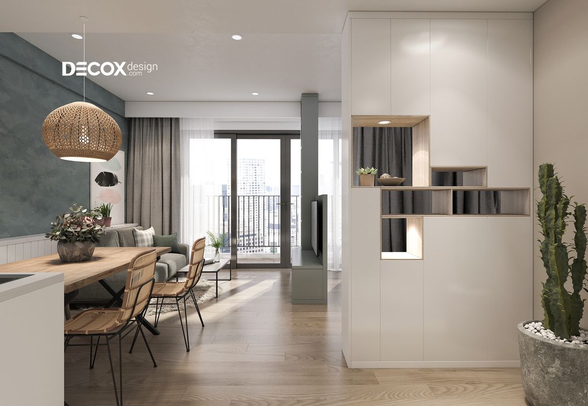 Tông màu trắng nhẹ nhàng, trang nhã hòa cùng sự sang trọng của tông màu xám và màu xanh thanh khiết của lá cây đã tạo nên những đường nét thiết kế thật thanh thoát. Mỗi một khu vực đều phát huy tối ưu công năng sử dụng. Bên cạnh đó, việc sử dụng khéo léo các tiện ích xanh đã giúp cho thiết kế nội thất chung cư trở nên gần gũi với thiên nhiên.