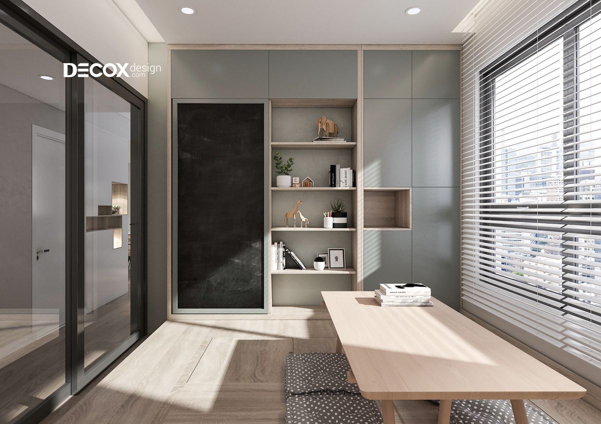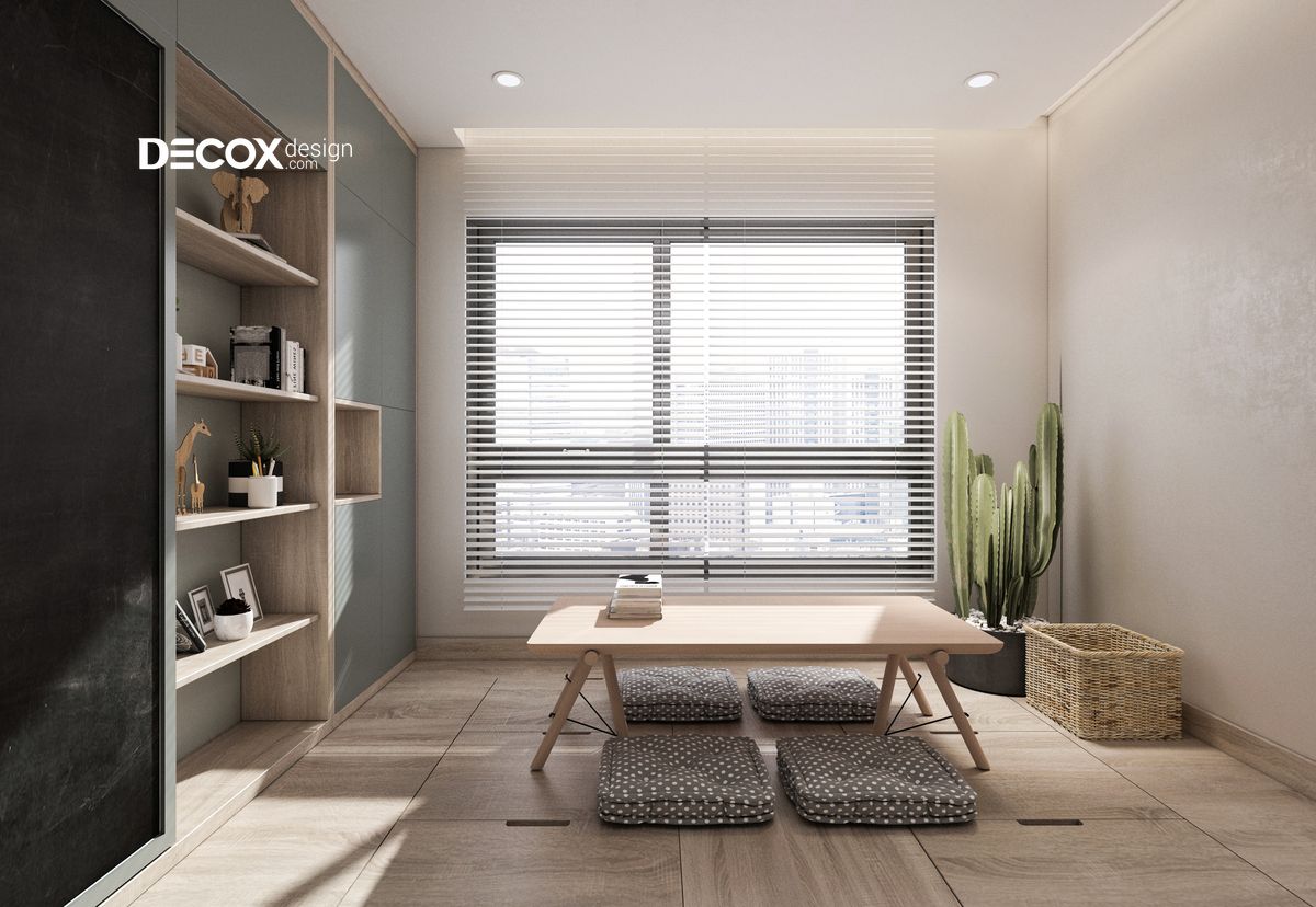 Phòng sách thư thái và trang nhã. Bàn đọc sách được đặt tại vị trí trung tâm, kết hợp cùng nệm ngồi mềm mại sẽ mang đến cảm giác dễ chịu cho chủ nhân. Một chậu xương rồng đặt tại góc tường sẽ giúp cho không gian phòng thêm tràn đầy sức sống.