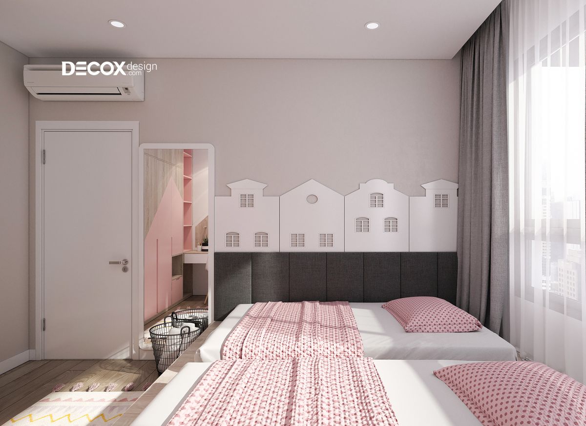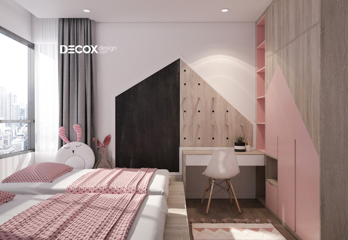 Việc thiết kế cửa sổ rộng sẽ làm cho không gian phòng luôn ngập tràn ánh sáng. Mảng tường khu vực bàn học được phối trộn màu sắc điệu nghệ tạo nên những đường nét dứt khoát, đầy cá tính. Ga nệm, chăn, gối với những tông màu nhẹ nhàng sẽ giúp cho con yêu của bạn có được cảm giác thư thái trong từng giấc ngủ.