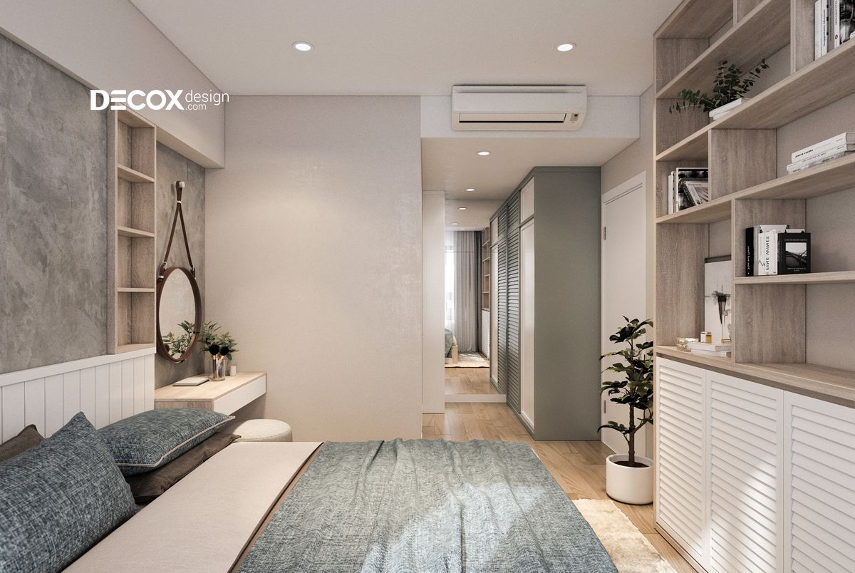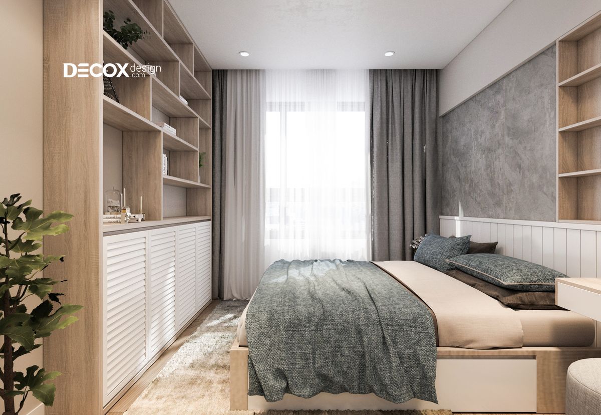Màu sắc tự nhiên của gỗ kết hợp cùng các sắc màu trắng, xám đã tạo nên một phòng ngủ sang trọng và mang tính thẩm mỹ cao. Nổi bật nhất trong thiết kế nội thất phòng ngủ đó là một tủ sách lớn nằm đối diện giường ngủ. Bên cạnh đó, với giường ngủ bằng gỗ và có ngăn kéo sẽ giúp chủ nhân có nhiều lựa chọn trong lưu trữ.