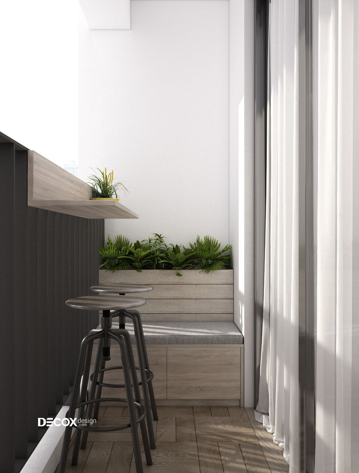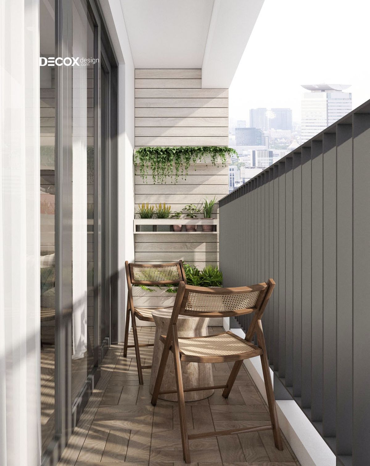 Khu vực ban công được Decox Design thiết kế gần gũi với thiên nhiên. Sự góp mặt của các tiện ích xanh sẽ giúp cho không khí trở nên trong lành, thoáng mát. Ngoài ra, với tầm quan sát rộng ban công sẽ là nơi tuyệt vời để gia chủ chiêm ngưỡng vẻ đẹp của thành phố.
