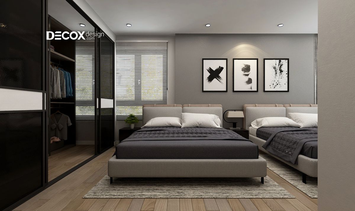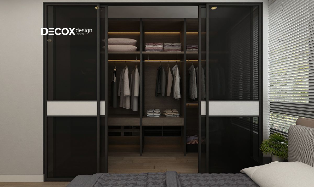 Thiết kế nội thất phòng ngủ độc đáo với khu vực tủ quần áo bằng cửa lùa, tạo được nét đẹp hiện đại, ấn tượng và cá tính bởi màu đen ấn tượng.