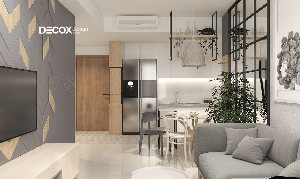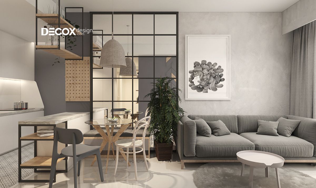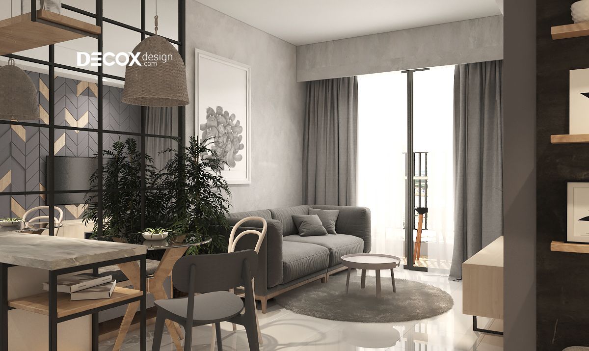 Tông màu xám trắng được lấy làm chủ đạo phối hợp hài cùng sắc màu tự nhiên của gỗ gợi lên nét tinh tế cho không gian phòng khách. Ghế sofa chữ I kết hợp cùng chiếc bàn tròn màu trắng kem được lót bên dưới tấm thảm màu xám khiến không tiếp khách thêm phần trang nhã. Các tiện ích xanh được thêm vào càng làm cho không gian thêm phần tươi mới.
