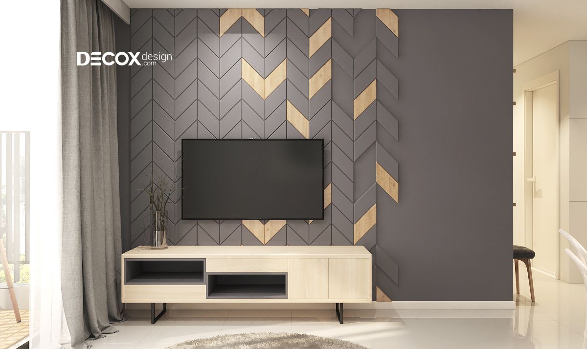 Mảng tường tivi được thiết kế với những đường nét độc đáo xóa đi sự nhàm chán của một mảng tường trống. Phía bên dưới được bố trí một chiếc tủ áp phê với màu sắc tương phản là một món đồ không thể thiếu trong thiết kế nội thất phòng khách này.