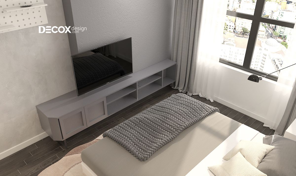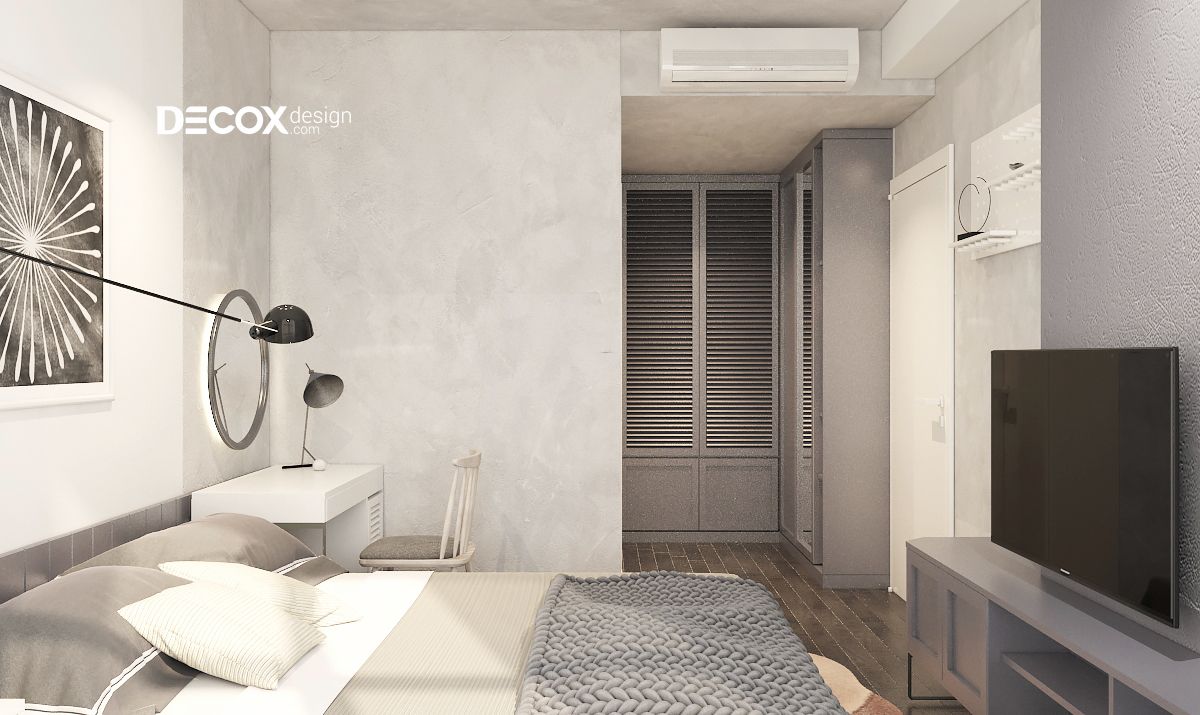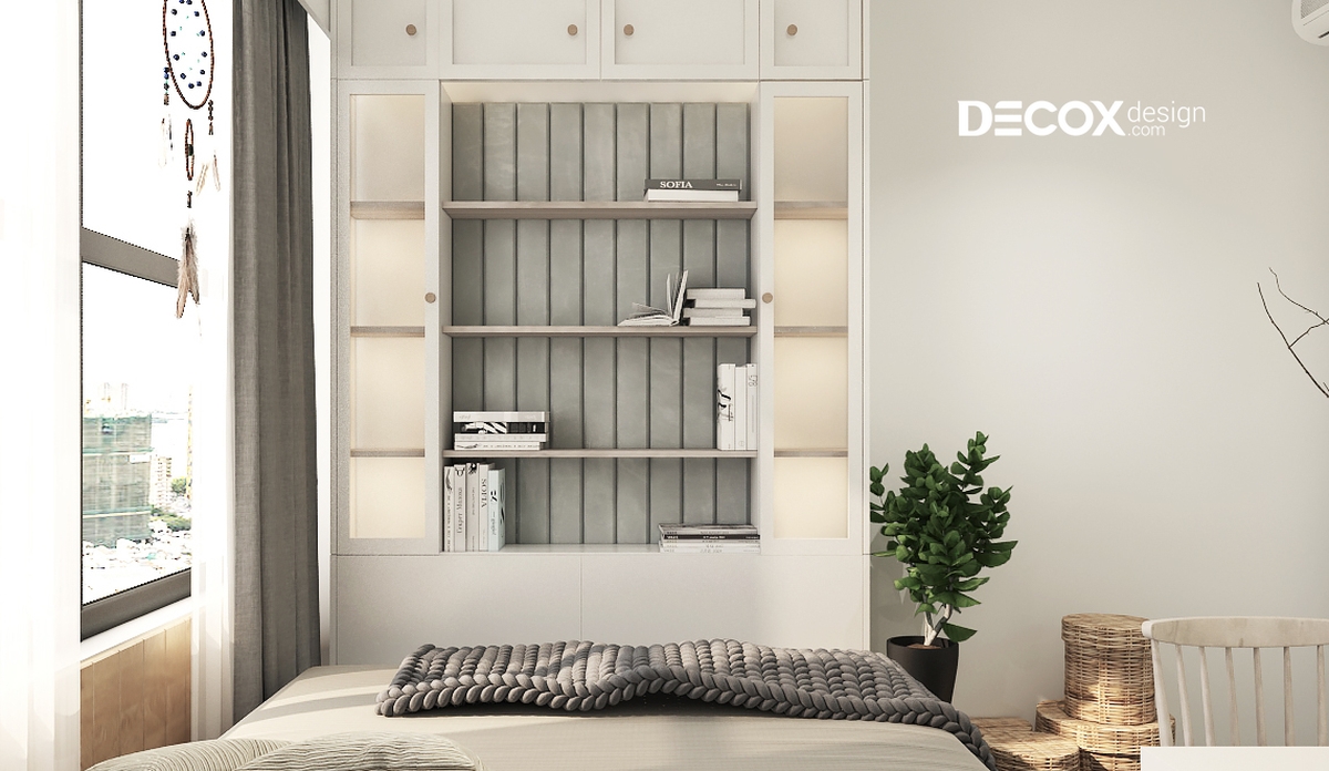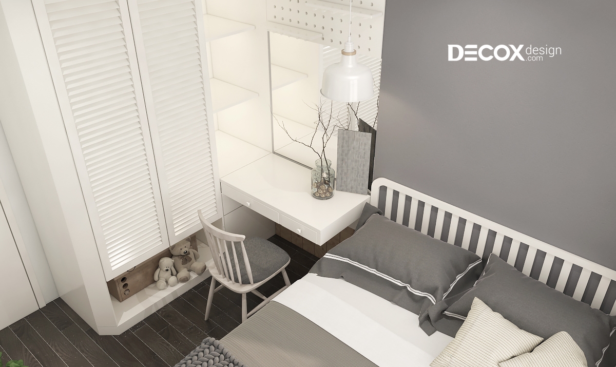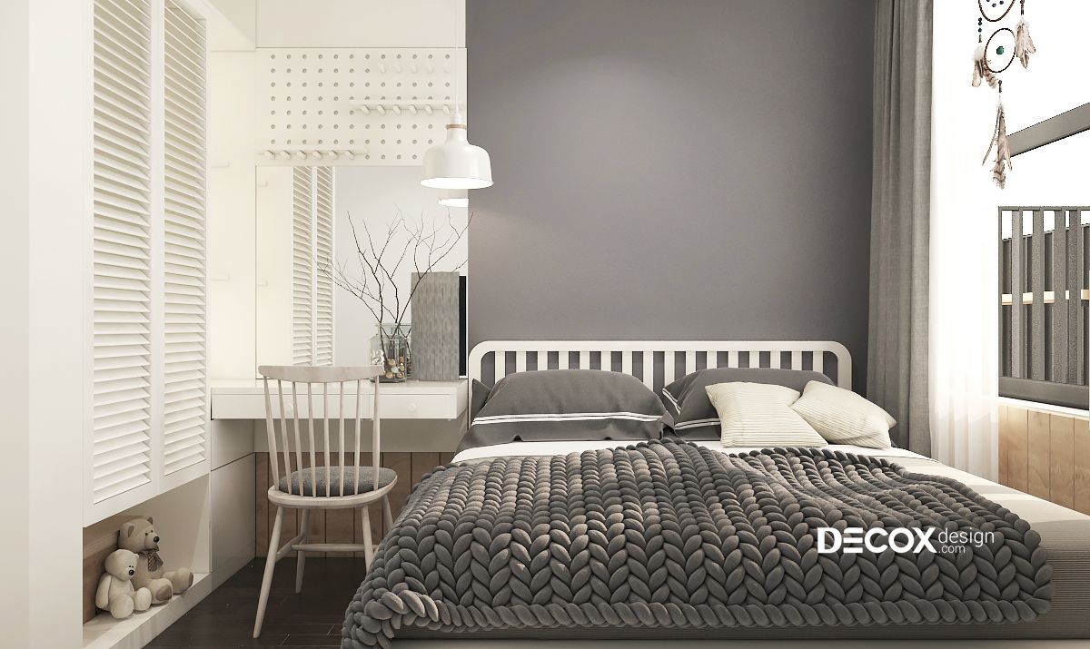 Thiết kế nội thất phòng ngủ nhỏ có phần xinh xắn với những thú bông và các vật dụng trang trí đáng yêu. Tuy là phòng ngủ nhỏ nhưng nội thất vẫn được bố trí đầy đủ từ từ giường ngủ, tủ quần áo, kệ sách và cả bàn trang điểm. Sắc xanh tự nhiên của cây lá được hòa quyện cùng màu xám sang trọng mang đến một không gian tràn ngập sức sống.