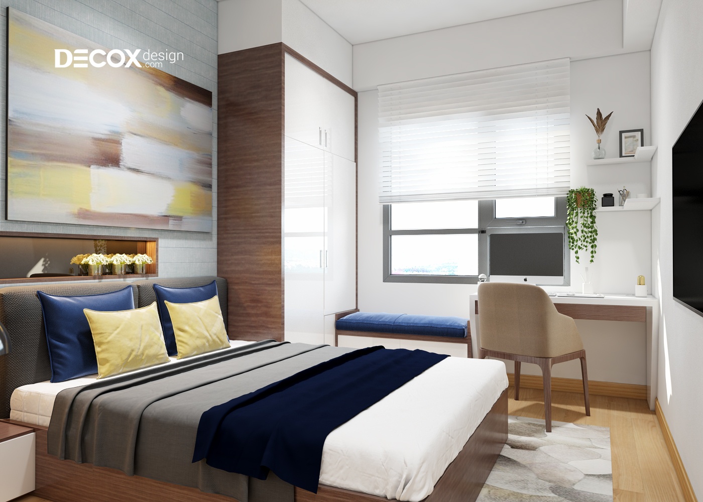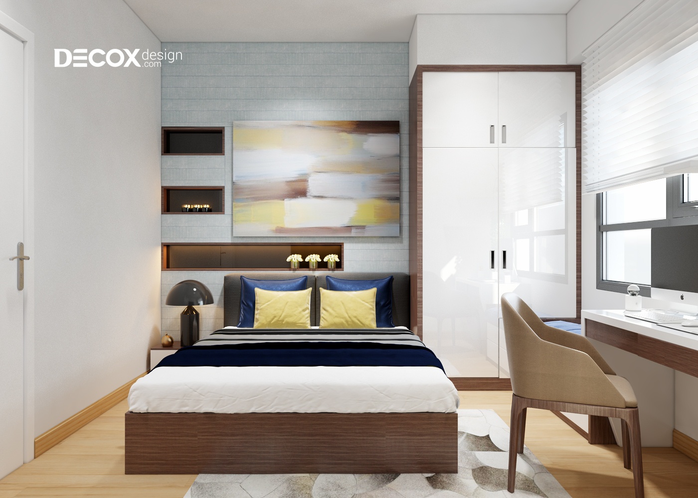 Decox Design lựa chọn những chi tiết nhỏ giúp có thể thay đổi hoàn toàn không gian của căn phòng, điều đó càng đúng hơn với những phòng ngủ diện tích bé này. Với sự kết hợp thông minh giữa những món đồ trang trí tông màu nổi bật trên nền trắng, căn phòng trở nên thông thoáng và hiện đại bất ngờ.
