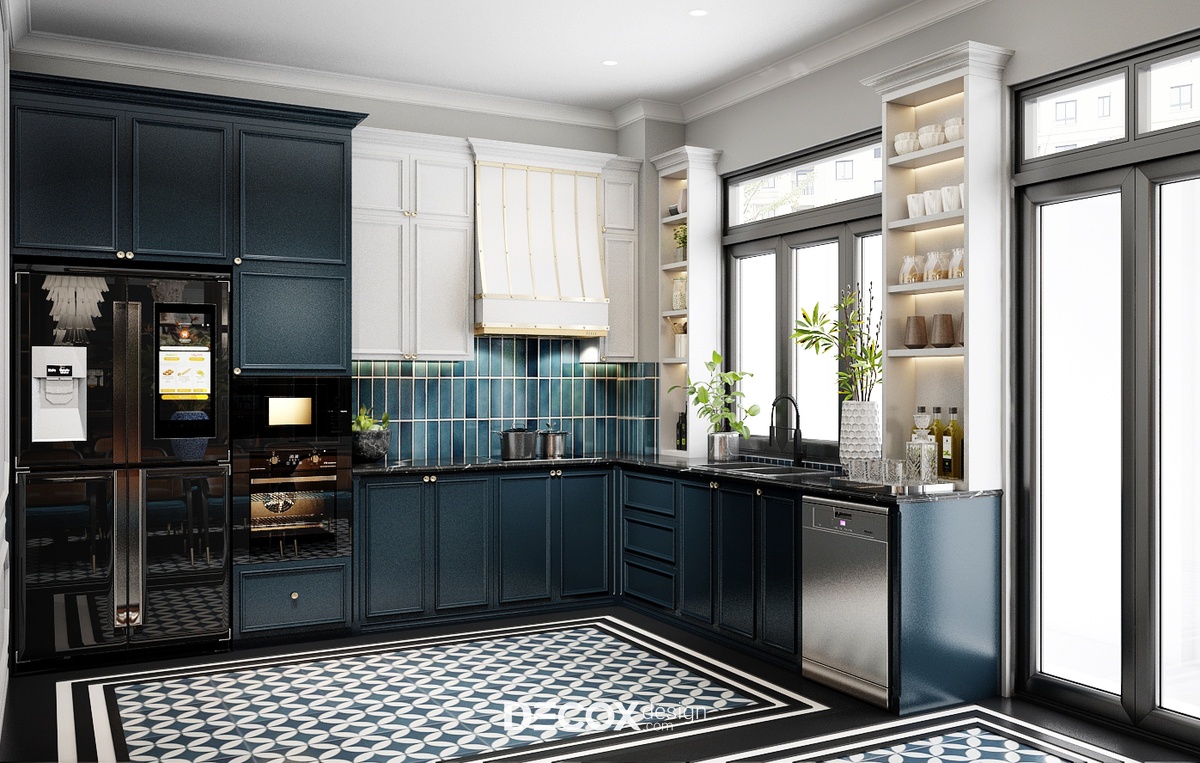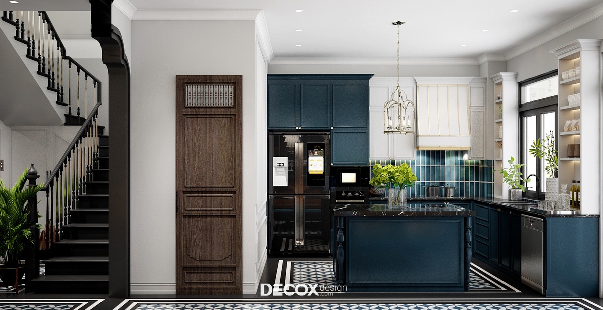 Khu vực bếp và phòng ăn được thiết kế tách biệt với những không gian còn lại tiện lợi cho việc di chuyển cũng như đảm bảo được tính riêng tư. Hệ tủ bếp được đo đạc dựa theo kích thước thực tế nhằm lắp đầy những khoảng trống trên tường đem đến hiệu quả thẩm mỹ cao. Nếu quan sát kỹ bạn có thể thấy được gạch bông lát sàn được thiết kế theo dạng thảm và chia thành 2 khối riêng biệt, đây như một sự ngầm khẳng định công năng riêng của 2 khu vực. Ngoài ra, điểm đáng chú ý trong không gian này còn phải kể đến cách phối màu tinh tế tạo được mạch liên kết cho không gian nhờ sự lặp lại màu sắc xanh - nâu nổi bật trên nền tường xám chủ đạo.