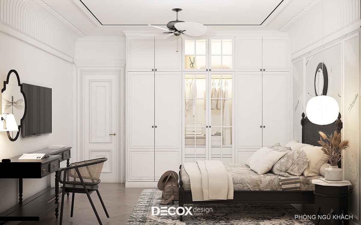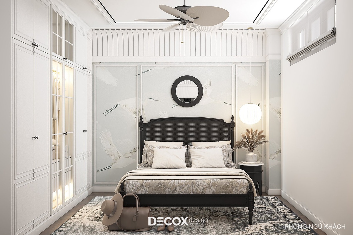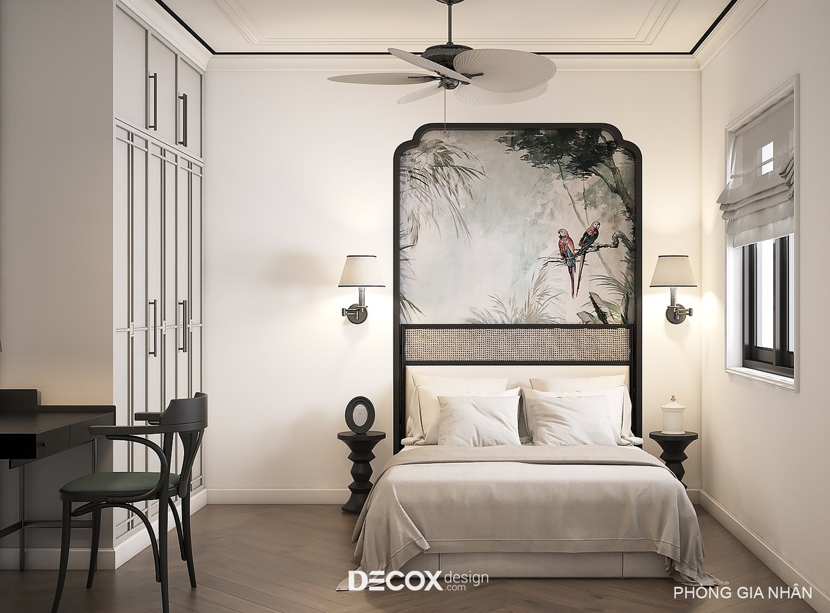 Phòng ngủ tinh tế, nhẹ nhàng với tone trắng chủ đạo được thiết kế dành riêng cho những vị khách quý hay họ hàng đến thăm nhà có thể nghỉ ngơi qua đêm. Do diện tích phòng không quá vượt trội nên các nội thất không cần thiết đã được lược bỏ nhằm mang đến một không gian thông thoáng cho người sử dụng. Điểm nhấn của căn phòng chính là sự kết hợp vô cùng ăn ý giữa họa tiết hạc bay trên tường và cọ trên chăn ga, đây đều là những biểu tượng mang nhiều tầng ý nghĩa được sử dụng rất nhiều trong phong cách indochine.