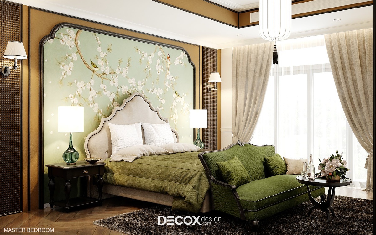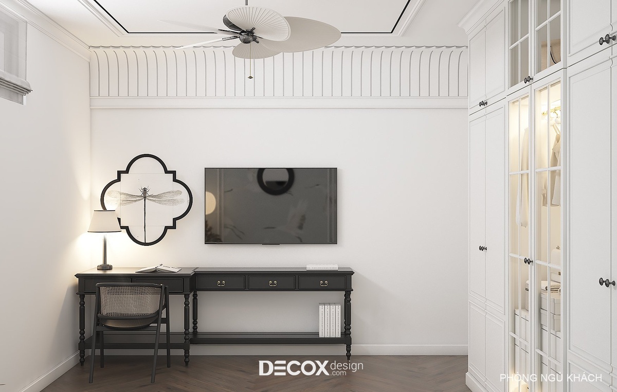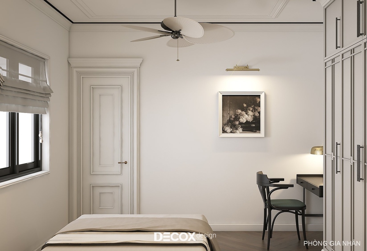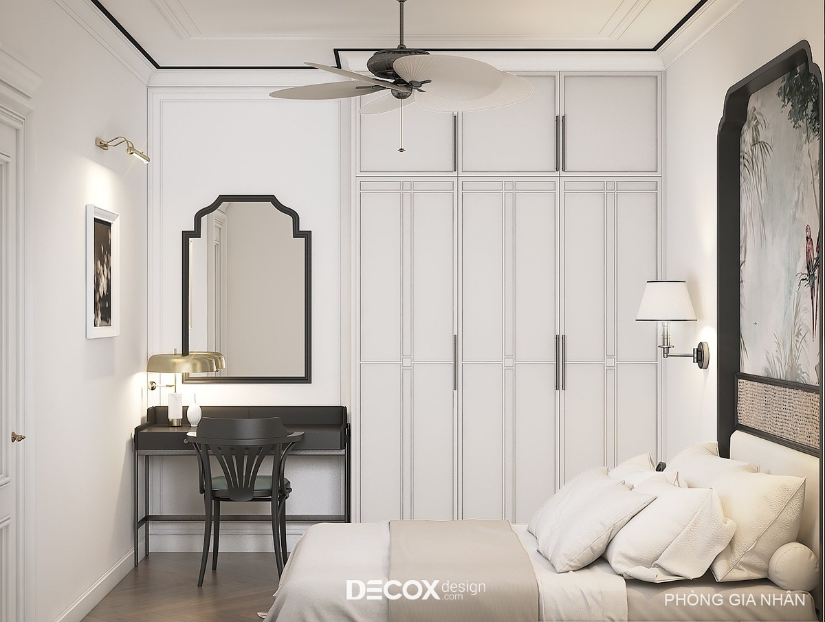 Phòng ngủ tinh tế, nhẹ nhàng với tone trắng chủ đạo được thiết kế dành riêng cho những vị khách quý hay họ hàng đến thăm nhà có thể nghỉ ngơi qua đêm. Do diện tích phòng không quá vượt trội nên các nội thất không cần thiết đã được lược bỏ nhằm mang đến một không gian thông thoáng cho người sử dụng. Điểm nhấn của căn phòng chính là sự kết hợp vô cùng ăn ý giữa họa tiết hạc bay trên tường và cọ trên chăn ga, đây đều là những biểu tượng mang nhiều tầng ý nghĩa được sử dụng rất nhiều trong phong cách indochine.