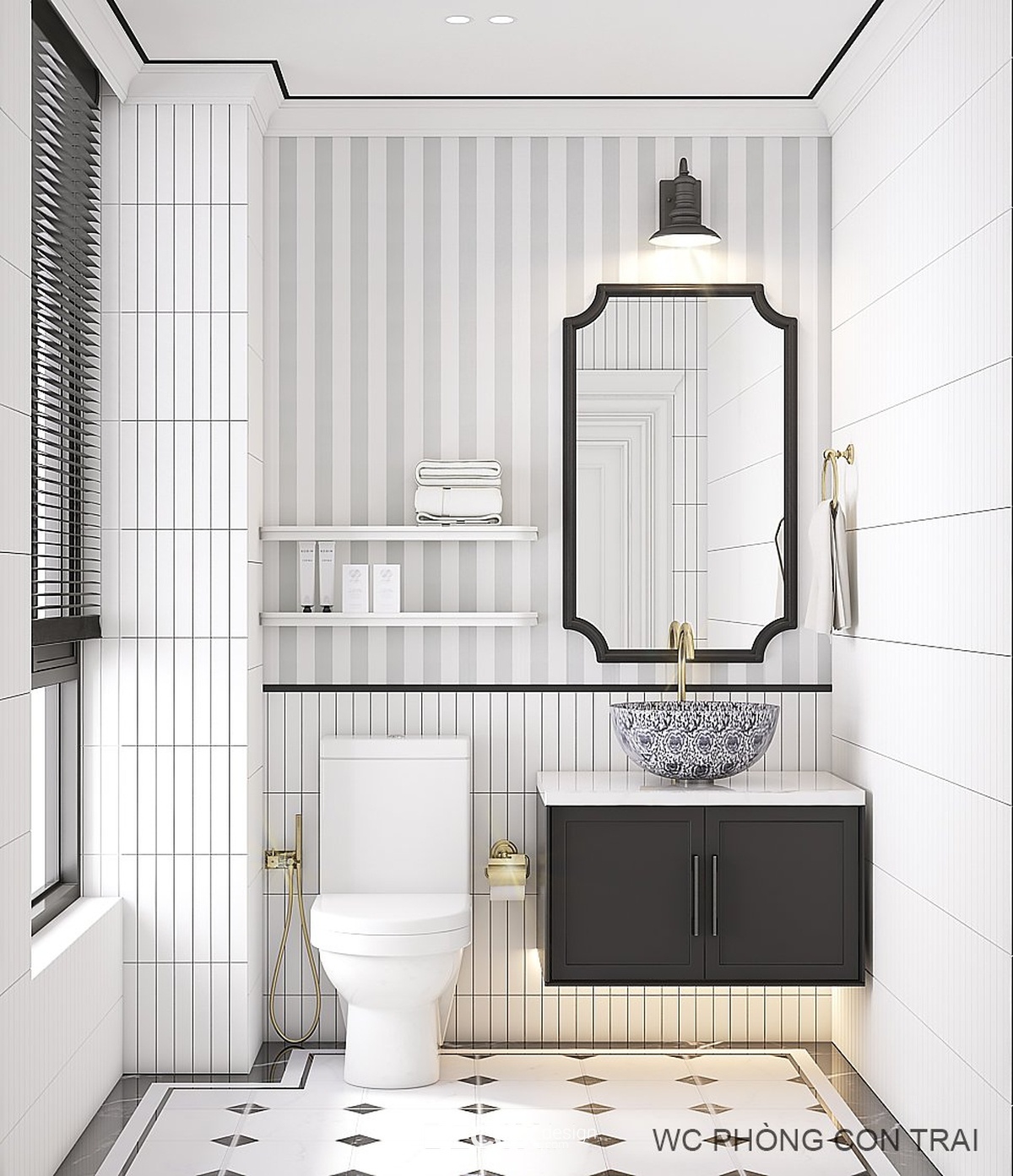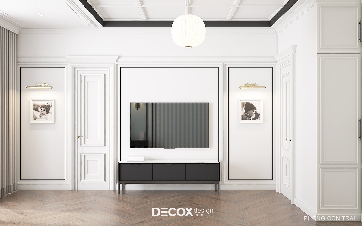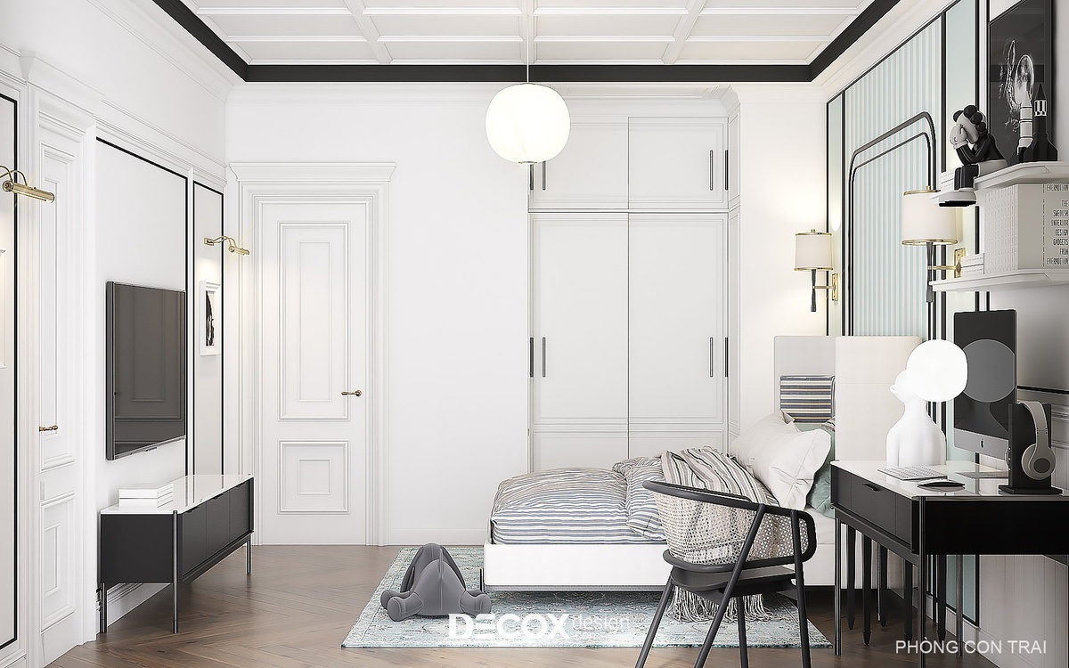 Màu sắc trong thiết kế phòng ngủ bé trai đã được tối giản hóa khi chỉ sử dụng tone trắng chủ đạo kết hợp tone đen kẻ viền nổi bật trên tường và trần. Ngoài ra, KTS cũng bổ sung thêm một chút sắc xanh pastel trên giấy dán tường đầu giường và thảm lót sàn để tạo thêm sự sinh động cho phòng ngủ của bé.