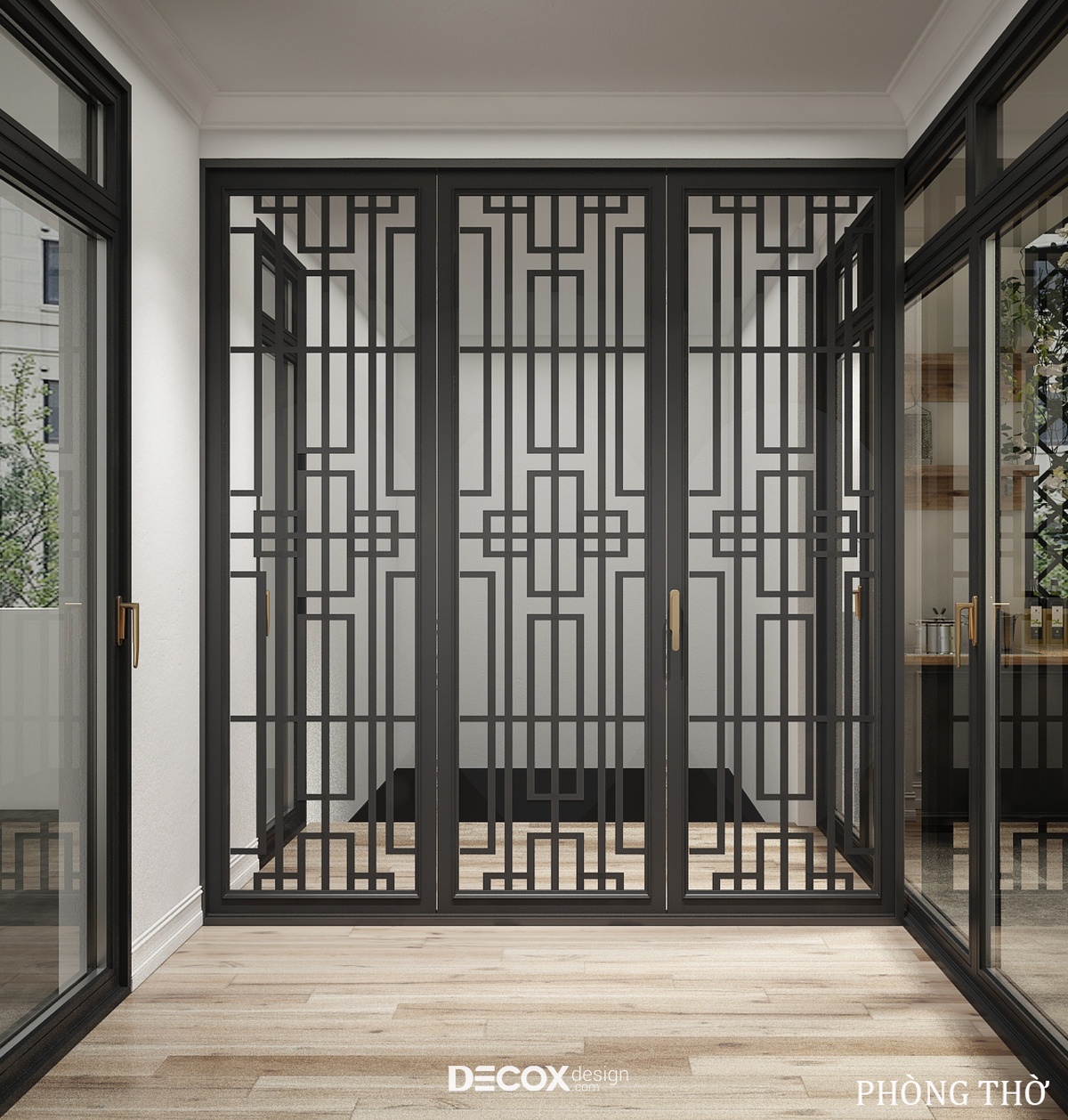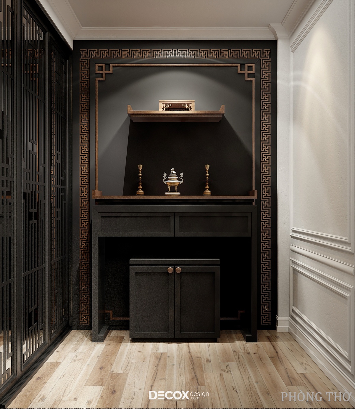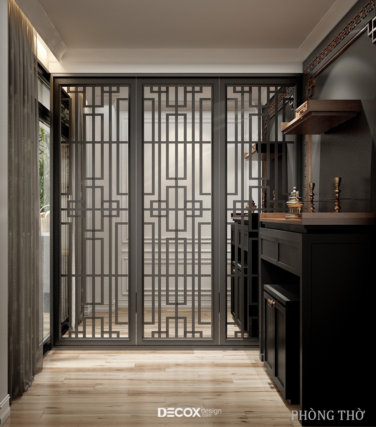 Phòng thờ được thiết kế theo dạng không gian kín, tách biệt với những khu vực khác trong nhà. Cách bố trí này vừa mang đến sự riêng tư cần thiết vừa làm tôn lên sự tôn nghiêm, trang trọng của nơi mang ý nghĩa tâm linh này.