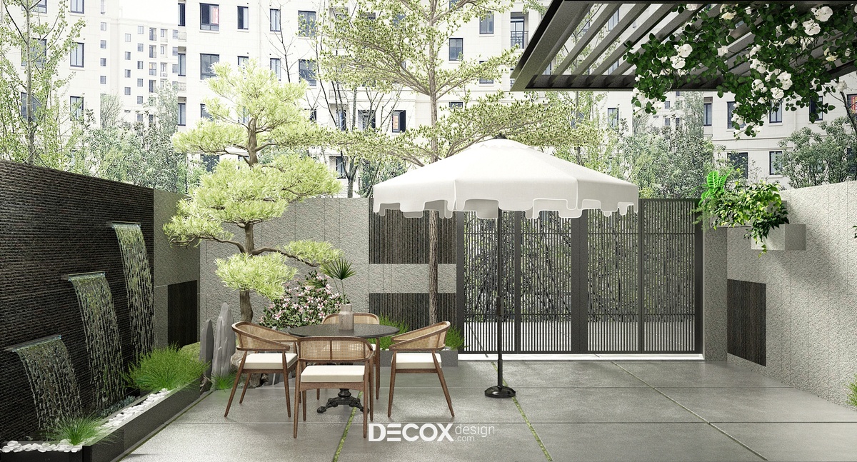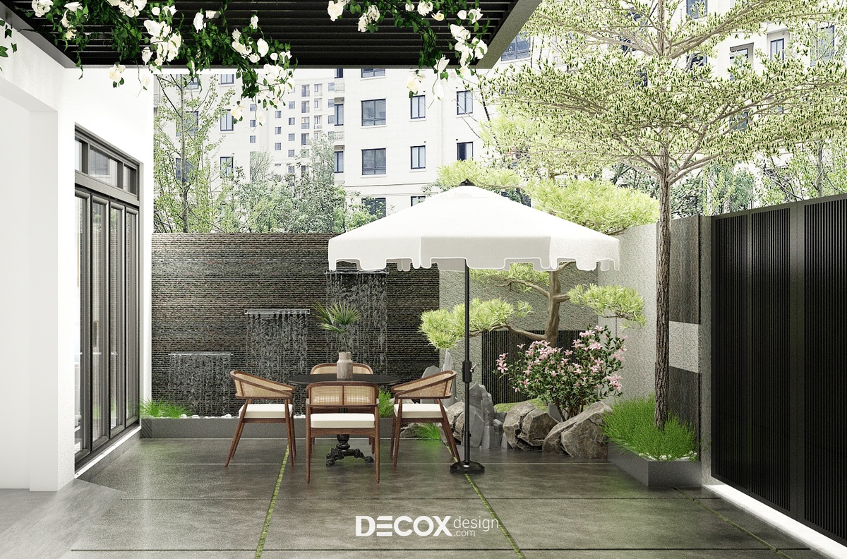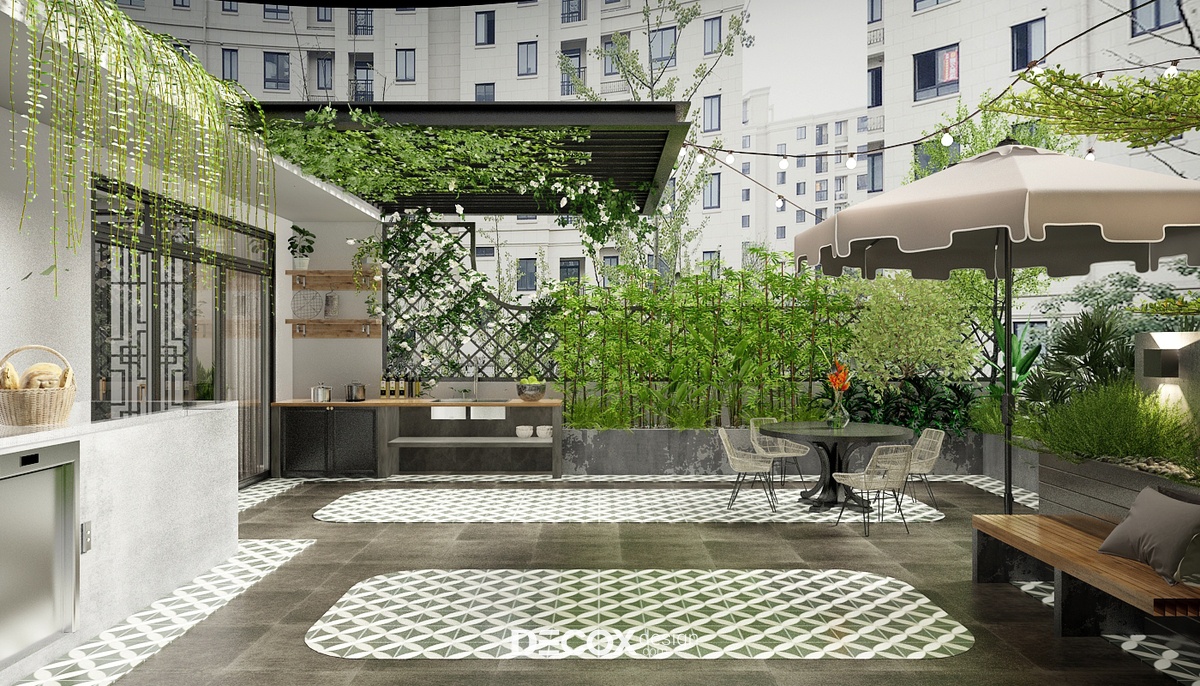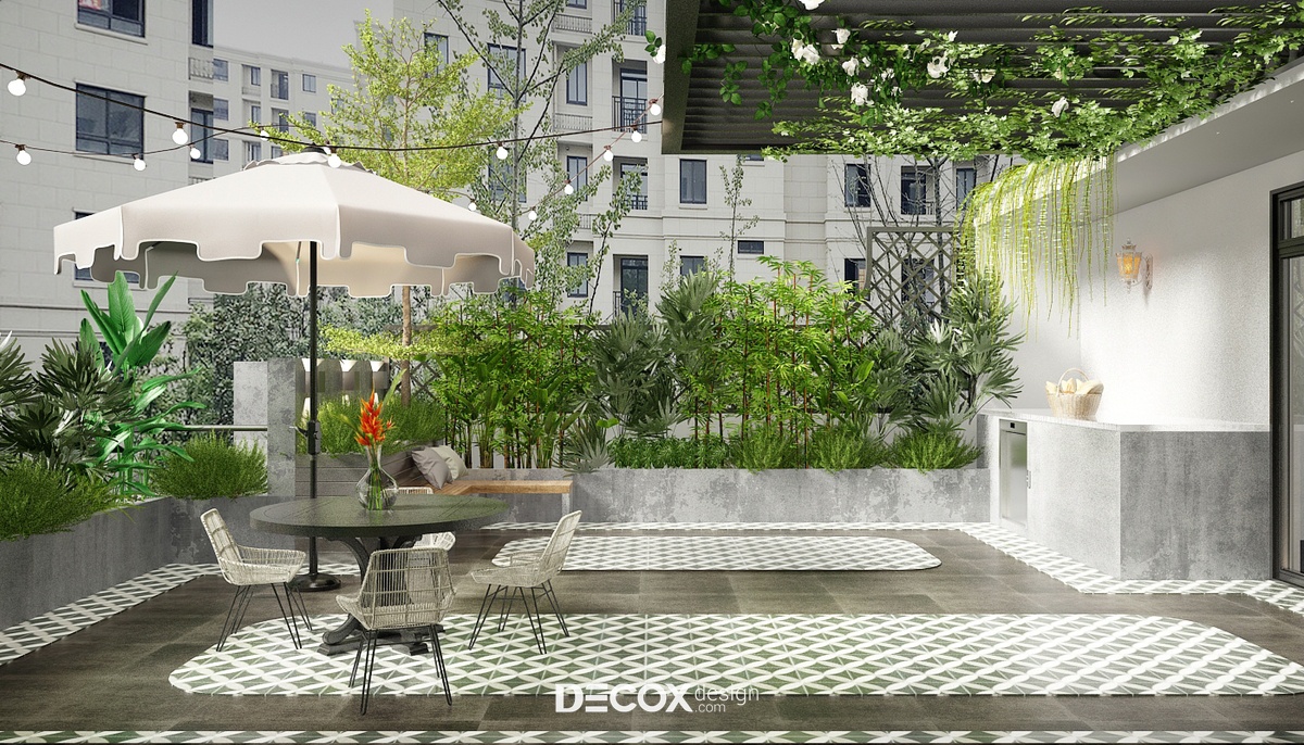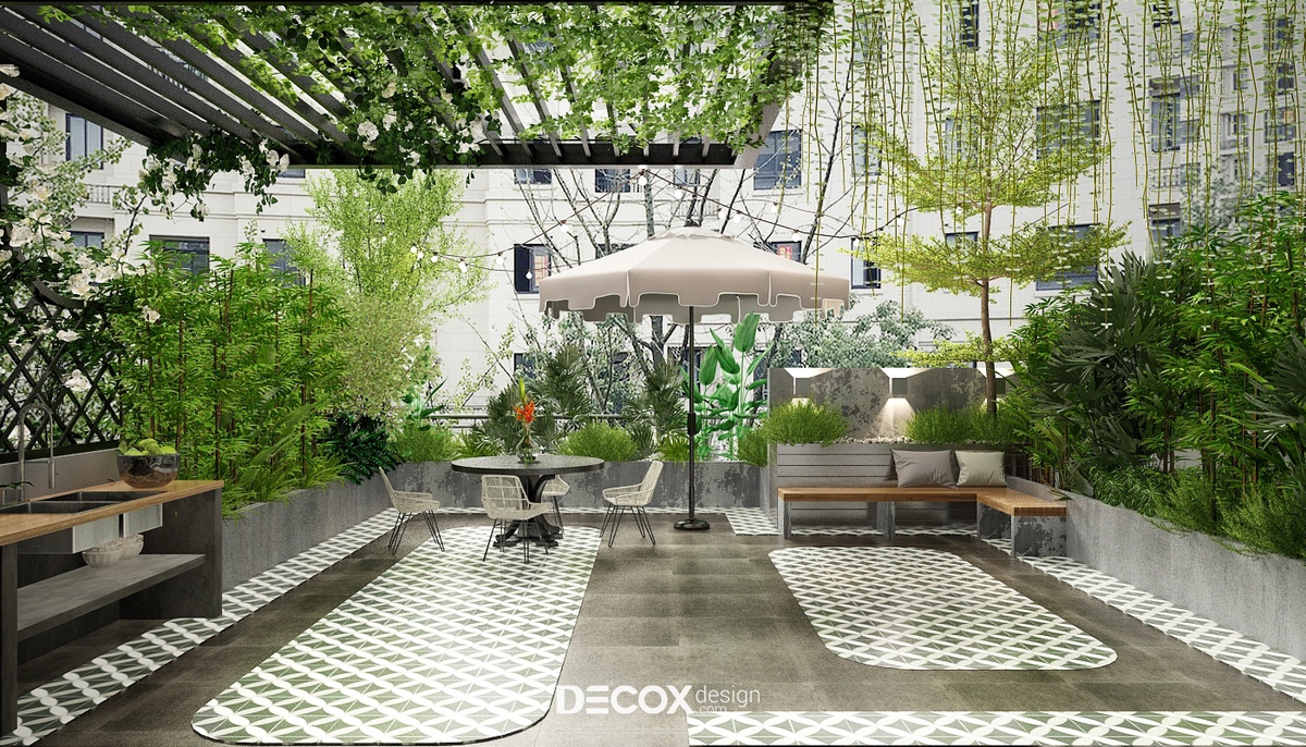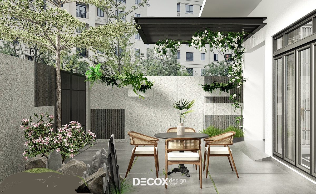 Nhằm mang hơi thở thiên nhiên vào trong thiết kế nội thất nhà phố do đó Decox Design đã tận dụng khá nhiều diện tích để có thể đem đến không gian xanh cho từng tầng của căn nhà từ khu vực sân trước, sân sau cho đến sân thượng. Tùy theo công năng mong muốn ở từng khu vực mà KTS đã bố trí thêm nội thất cần thiết để phục vụ tốt nhất cho việc sinh hoạt của gia chủ cùng các thành viên trong gia đình.