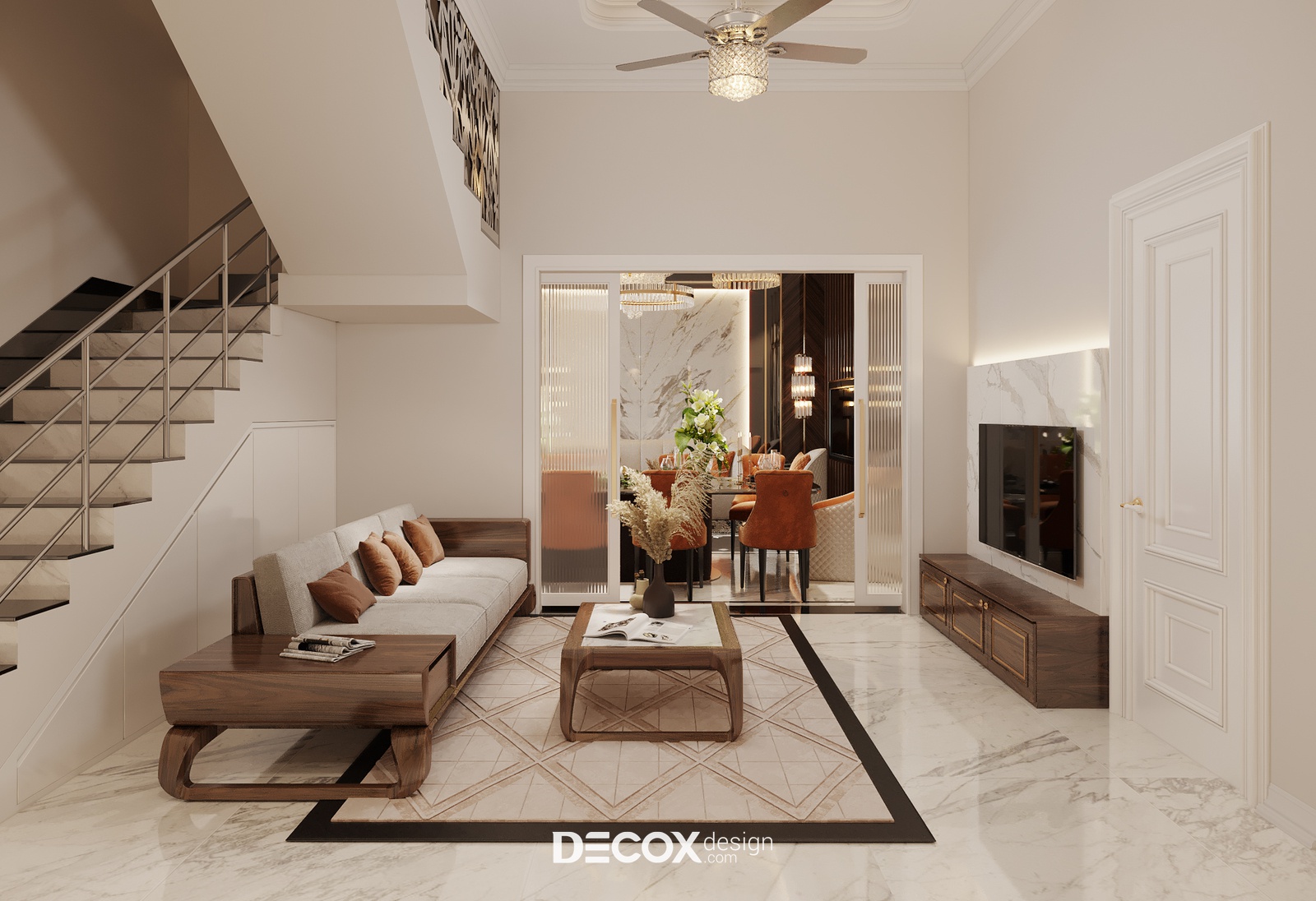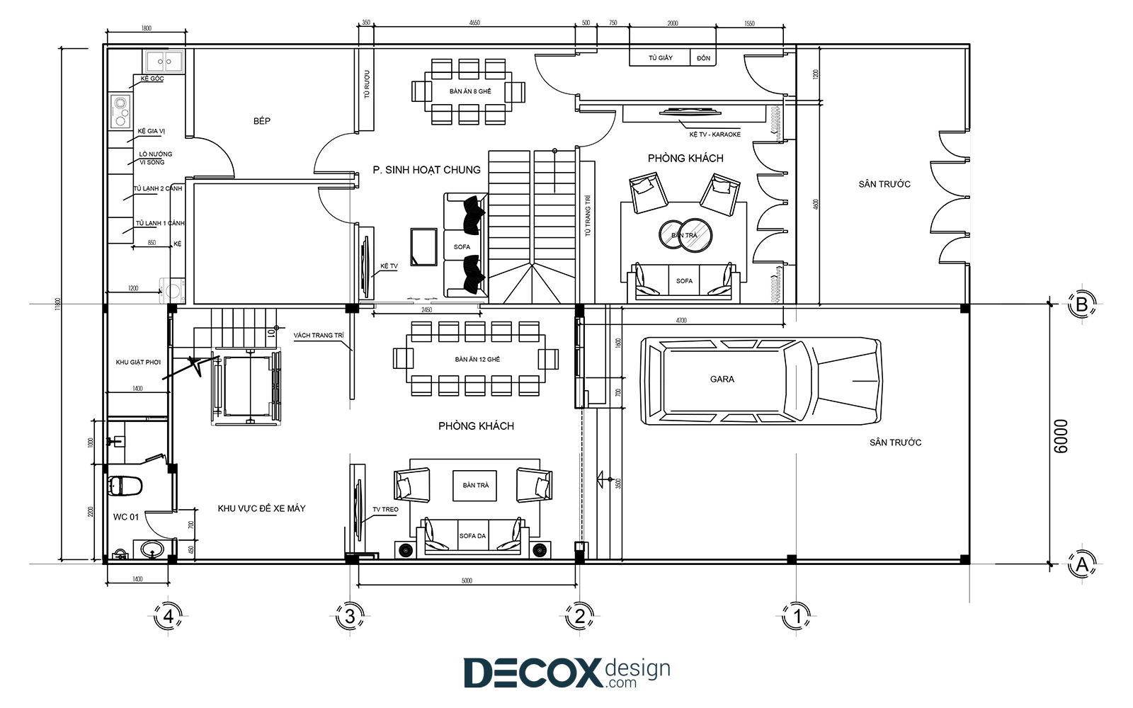 Do được ghép nối từ 2 căn nhà liền cạnh nhau, thay vì phá vỡ bức tường chung ở tầng trệt để tạo một tổng thể thống nhất, thể theo yêu cầu của gia chủ, Decox Design đã quyết định giữ nguyên hiện trạng và bố trí thêm cửa kéo để kết nối hai không gian. Dựa vào mặt bằng hiện trạng, có thể thấy được tầng trệt bao gồm các khu vực chức năng: sảnh vào nhà, 2 phòng khách, 2 phòng ăn, phòng bếp, khu vực sinh hoạt chung và WC. Mục đích của cách thiết kế này chính là linh hoạt trong công năng sử dụng, dù vào nhà ở lối cửa chính hay từ cửa gara thì bạn đều sẽ đến ngay với khu vực phòng khách sang trọng.