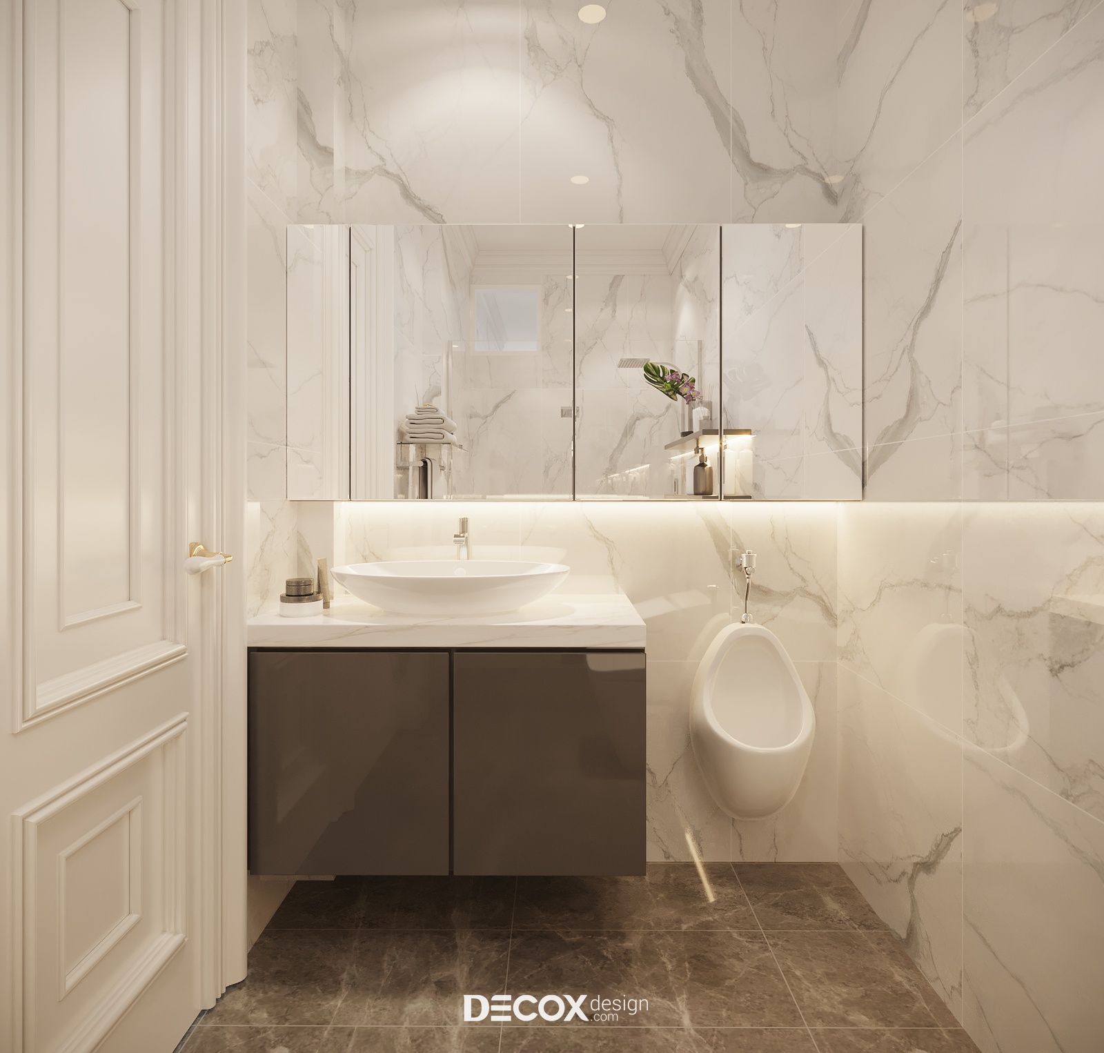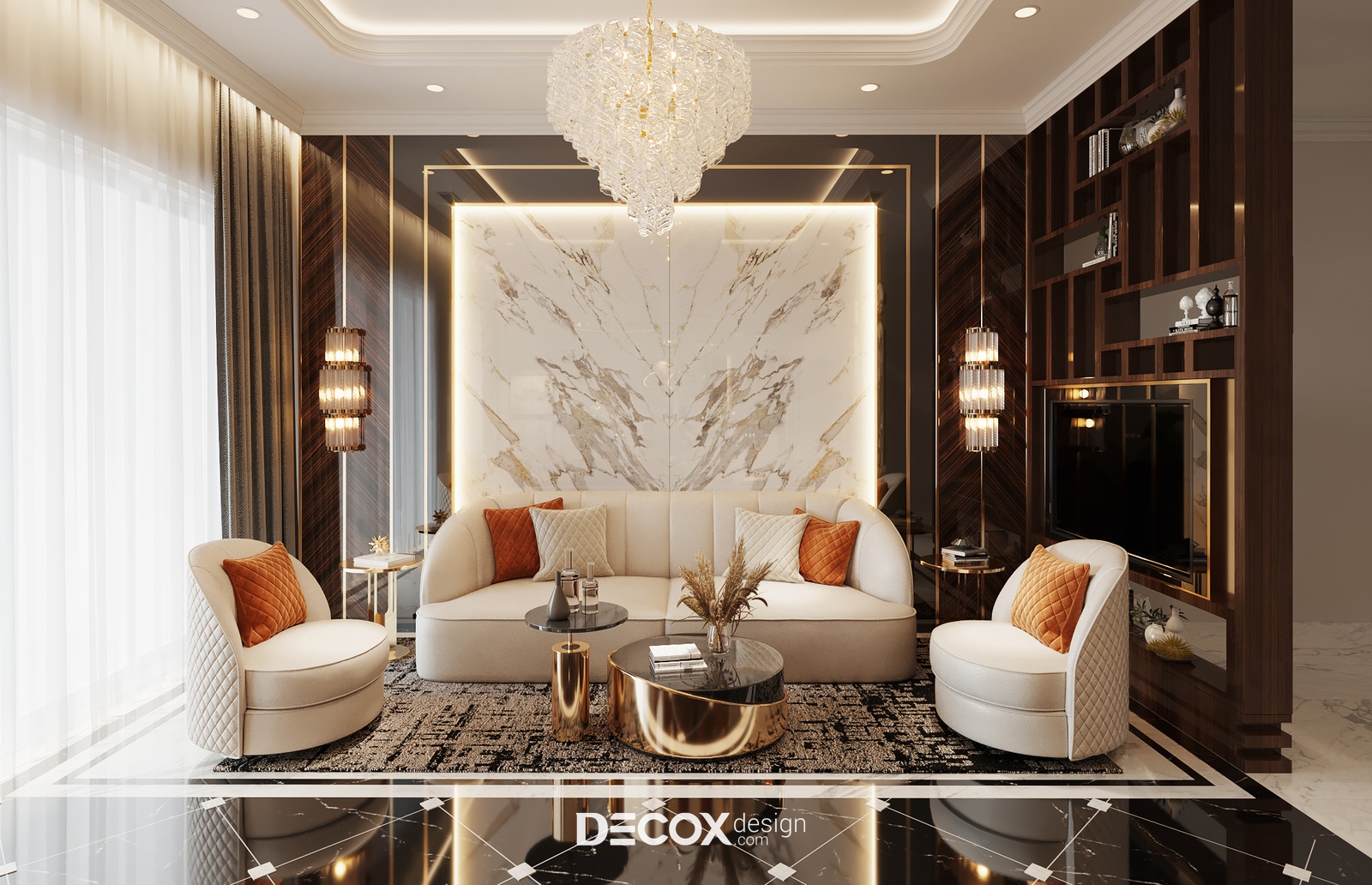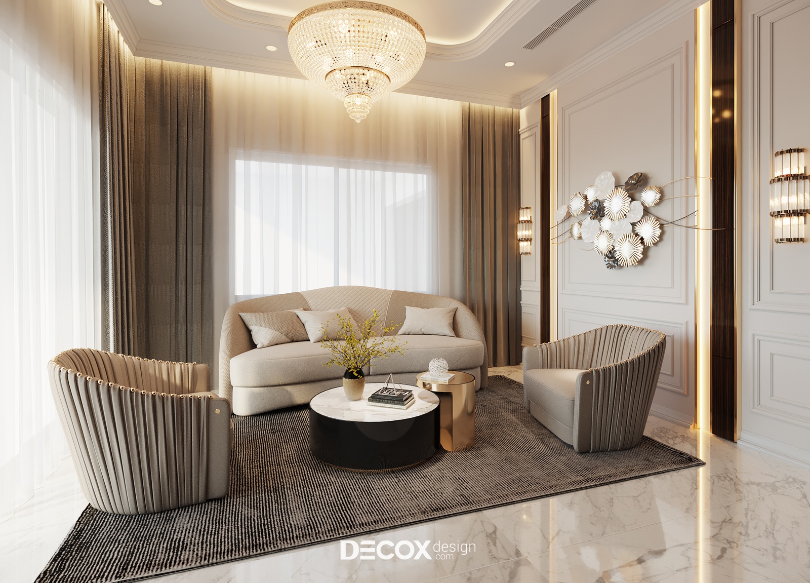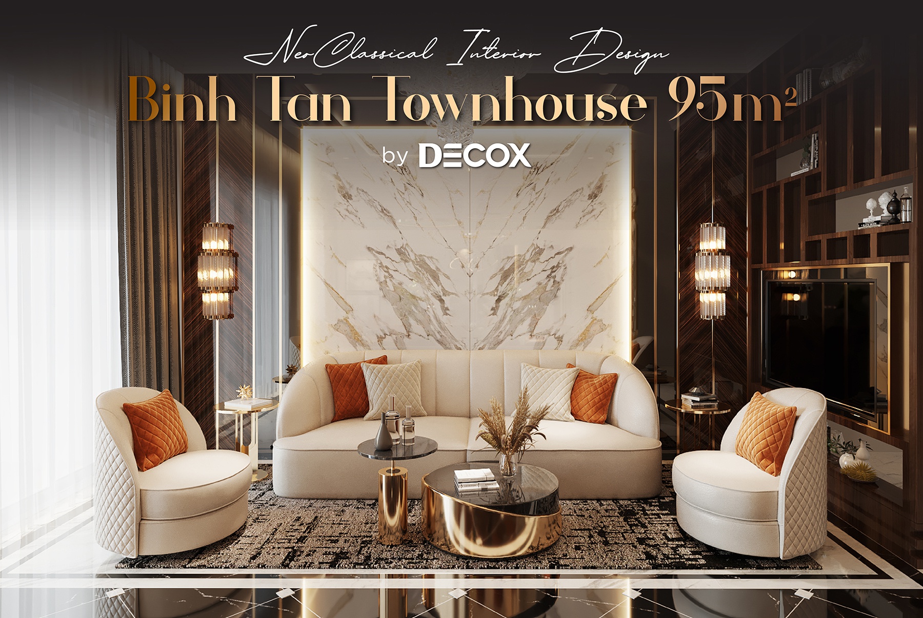 Về phong cách, thiết kế nội thất của dự án được thiết kế dựa theo chuẩn mực phong cách Bán cổ điển lãng mạn và pha nhấn thêm nghệ thuật Luxury đầy vương giả trên từng centimet không gian. Nếu các gam màu nhã nhặn như be, nâu trầm, đồng ánh kim bộc lộ sự trầm tĩnh và tôn quý tinh thần Neo-classic, thì các chất liệu bắt mắt và xa xỉ như gỗ tự nhiên, kim loại mạ, thủy tinh, pha lê, chất liệu da hay đá tự nhiên sẽ là những yếu tố then chốt để “phô diễn” những giá trị cao cấp, sang trọng của Luxury.