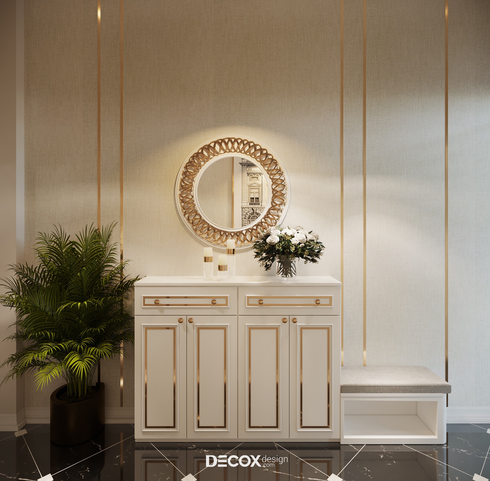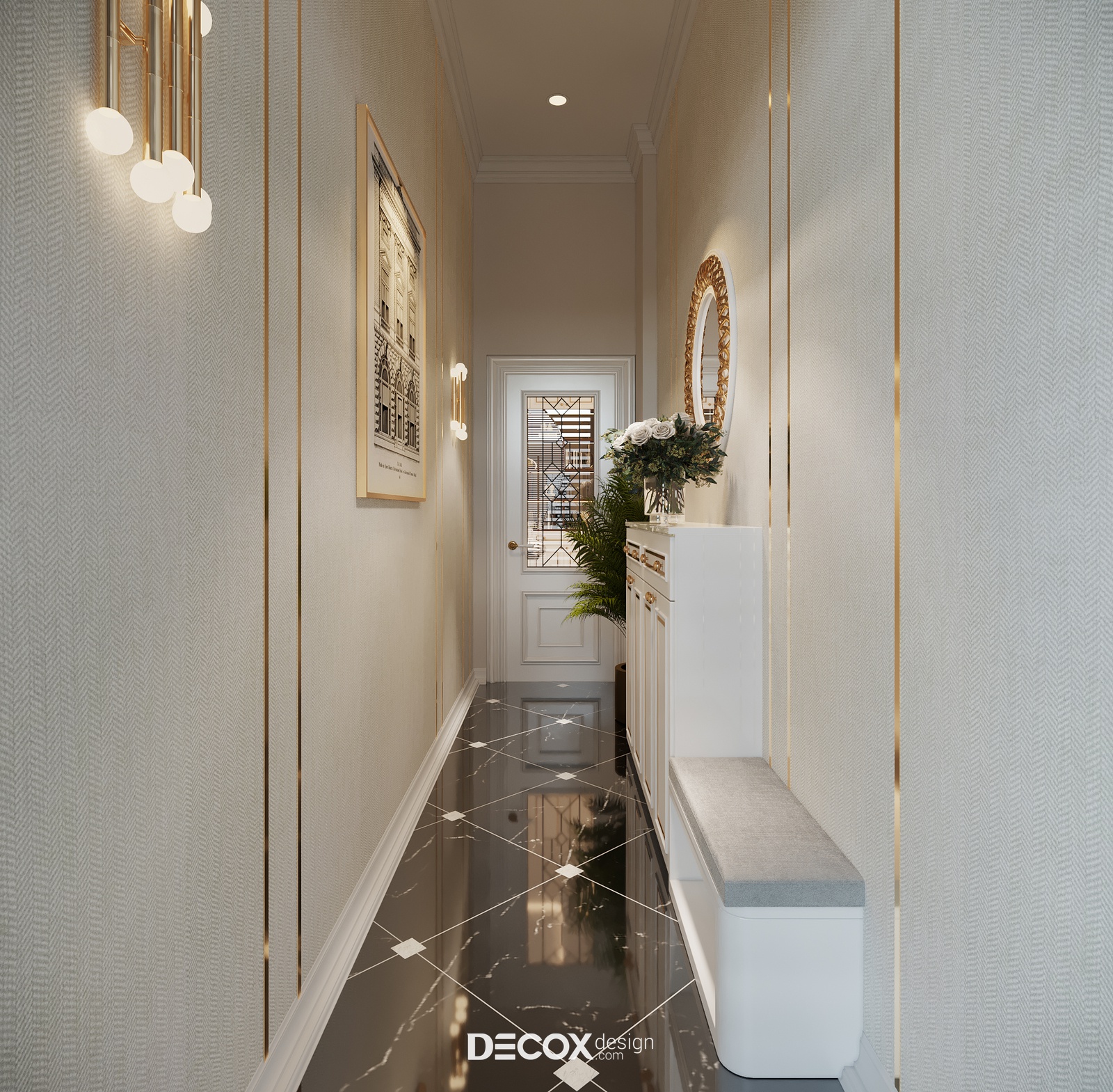 Để đảm bảo tính riêng tư cho những khu vực chính trong nhà, trước khi đến với không gian phòng khách bạn sẽ phải đi qua hành lang hẹp được decor tinh tế. Ngoài sử dụng giấy dán tường tone màu trang nhã kết hợp kẻ viền mạ vàng KTS cũng bố trí thêm tủ đựng giày, ghế đôn nhỏ cùng một chiếc gương tròn được ốp viền sang trọng để gia chủ có thể điều chỉnh trang phục, đầu tóc một cách tinh tươm, chỉnh tề nhất trước khi ra khỏi nhà.