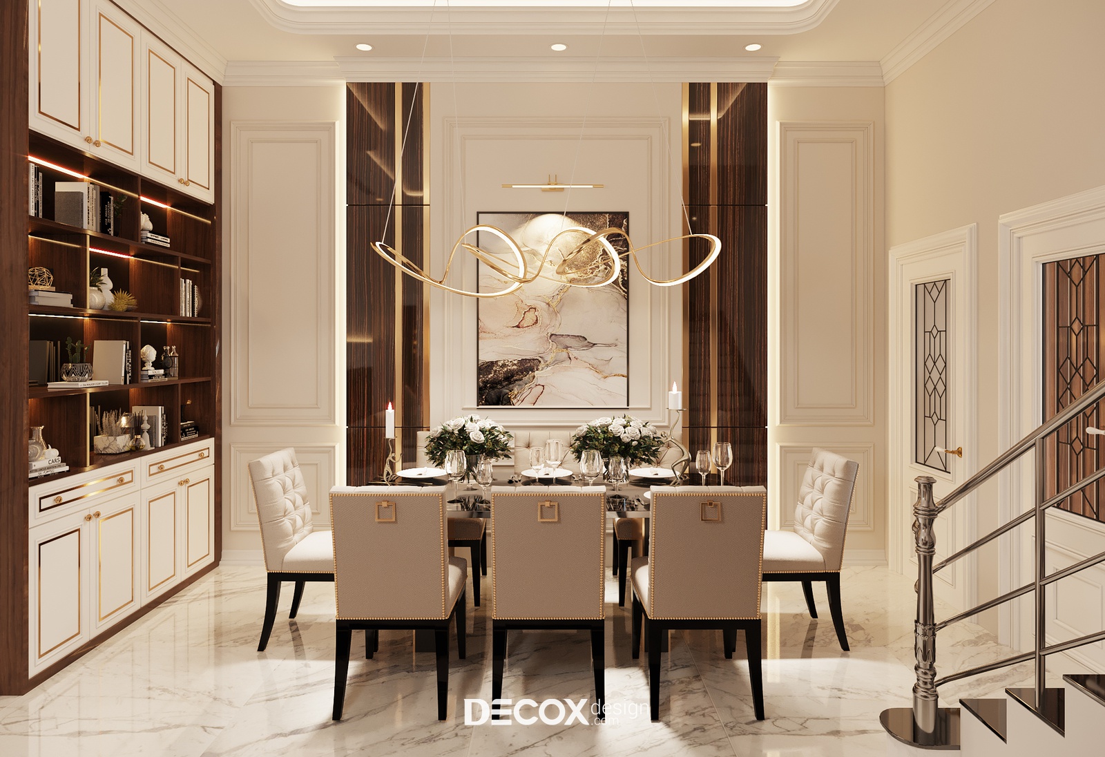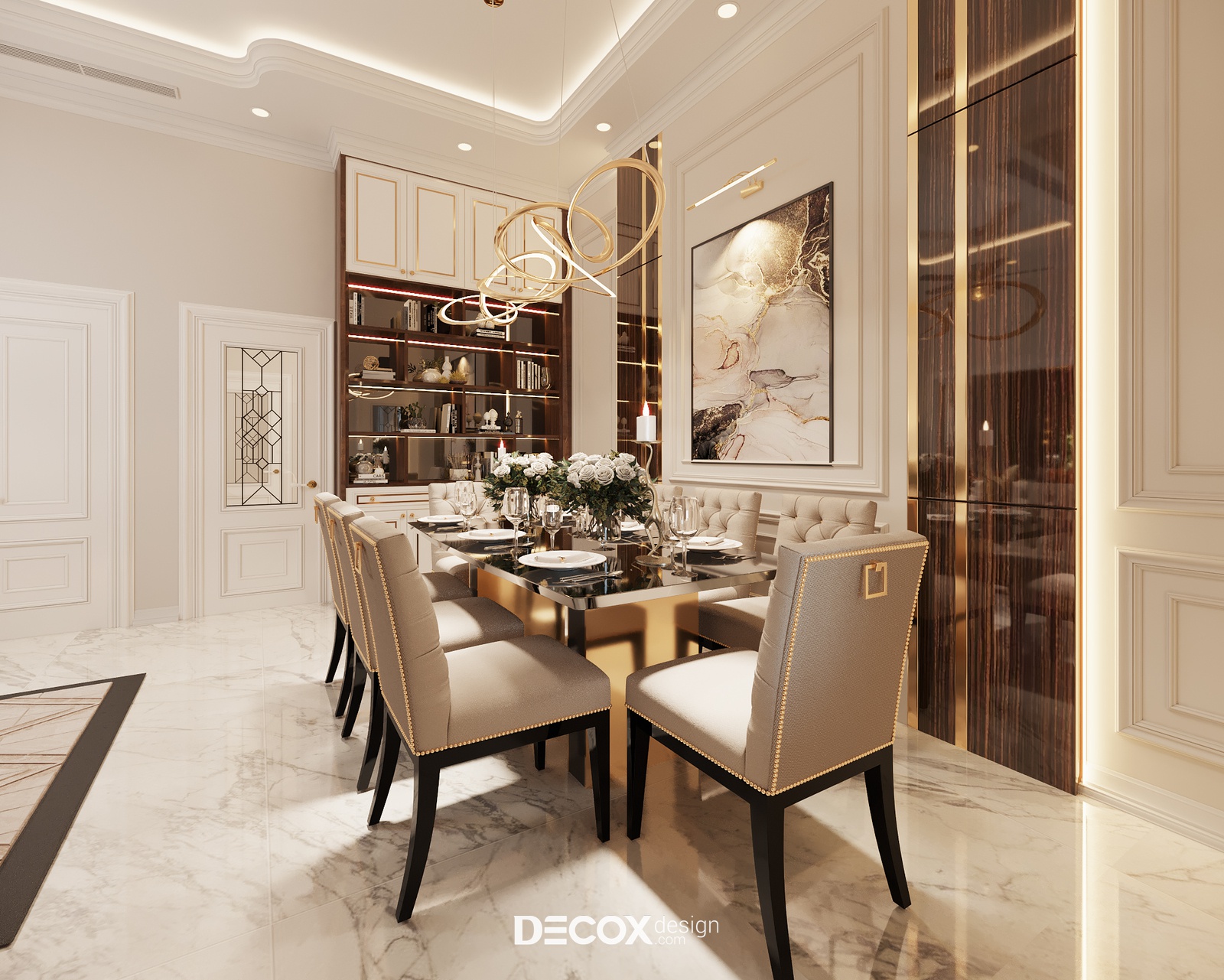 Về tổng thể, không gian sinh hoạt chung mang lại cảm giác trầm lắng nhưng gợi cảm và thanh nhã. Bàn ăn mang đường nét dứt khoát và đậm chất cổ điển với họa tiết dập múi nệm và viền phào. Xung quanh là các chi tiết đồng điệu như phần tường và kệ tủ kẻ phào chỉ đặc trưng kết hợp cùng giải pháp chiếu sáng khoa học.