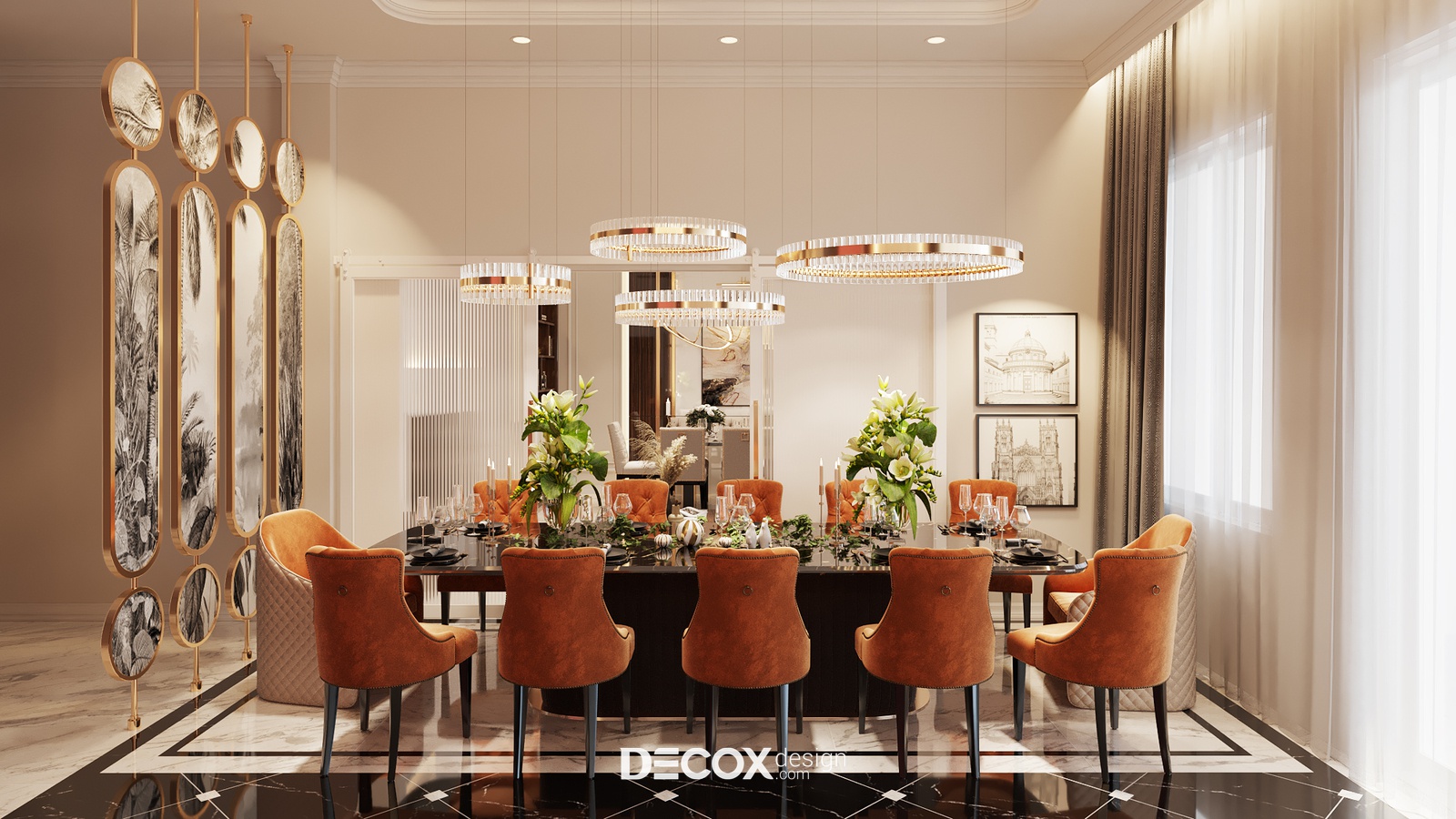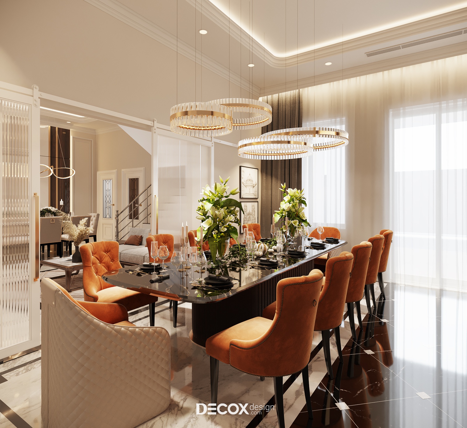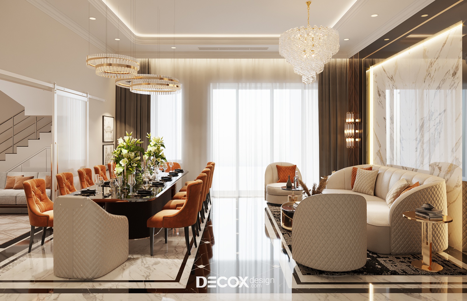 Cạnh bên phòng khách lớn là phòng ăn sang trọng sở hữu lối thiết kế đồng điệu khiến người nhìn khó mà rời mắt. Cách chọn dùng bàn ăn hình chữ nhật bố trí 12 ghế và bổ sung thêm bộ sofa thời thượng giúp tăng thêm cảm giác gắn kết và cởi mở cho không gian chung này. Có thể thấy, khi thiết kế phòng ăn thì yếu tố “ấm cúng” sẽ luôn được đề cao và theo đuổi. Phòng ăn tại dự án này cũng không ngoại lệ, để tạo nên bầu không khí thân mật tự nhiên nhất thì KTS đã chọn gam màu cam đất kết hợp cùng hệ thống đèn trang trí ấn tượng để không gian thêm trọn vẹn hơn.