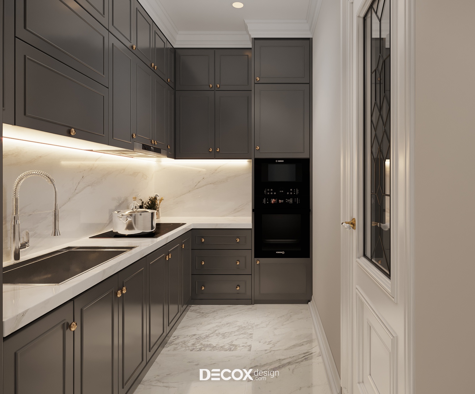 Không gian bếp cân bằng được 3 tiêu chí: Thoải mái, tiện dụng và thẩm mỹ. Áp dụng xây dựng bếp theo dạng chữ L giúp căn bếp thêm rộng rãi nhưng vẫn đảm bảo được tính gọn gàng. Hơn thế, việc chọn dùng hệ tủ bếp trên dưới đề cao tính công năng và tinh tế đặt các vật dụng nhà bếp “vừa khít” không gian cũng thể hiện rõ sự đầu tư và tính toán tỉ mỉ của KTS. Để nhà bếp không xa rời các không gian khác chi tiết phào chỉ đã được lặp lại ở đây. Ngoài ra việc chọn màu xám là màu chủ đạo cho gian bếp càng khiến không gian này tăng thêm cảm giác sạch sẽ và tinh tươm.