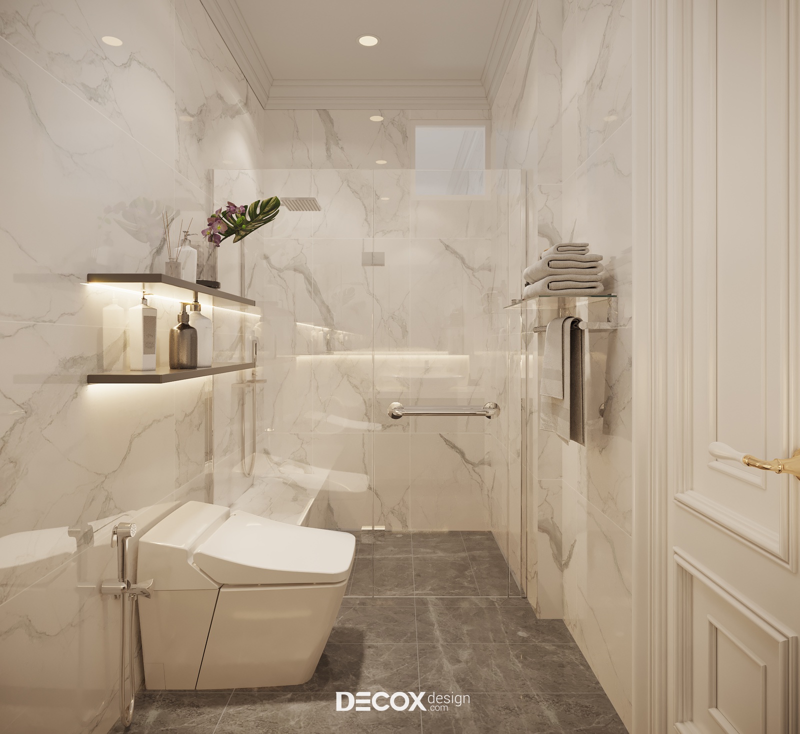 Vì là nhà phố nên WC của dự án này có diện tích khá khiêm tốn. Để khắc phục nhược điểm này KTS đã ứng dụng hiệu ứng thị giác để giúp không gian vệ sinh trong rộng rãi và thoáng hơn, yếu tố cần có khi thiết kế WC. Cụ thể, nội thất ở đây được ưu tiên dùng màu trắng để tạo cảm giác không gian như được nới rộng hơn so với diện tích thực. Ngoài ra KTS cũng chủ trương tối giản, tích hợp và đa năng hóa chức năng nội thất tại WC. Tuy nhiên mọi giải pháp đưa ra vẫn không làm mất đi tính tiện nghi của không gian, để dẫu là không gian phụ thì WC vẫn cân bằng với lối sống và cá tính mà dự án đang đầu tư.