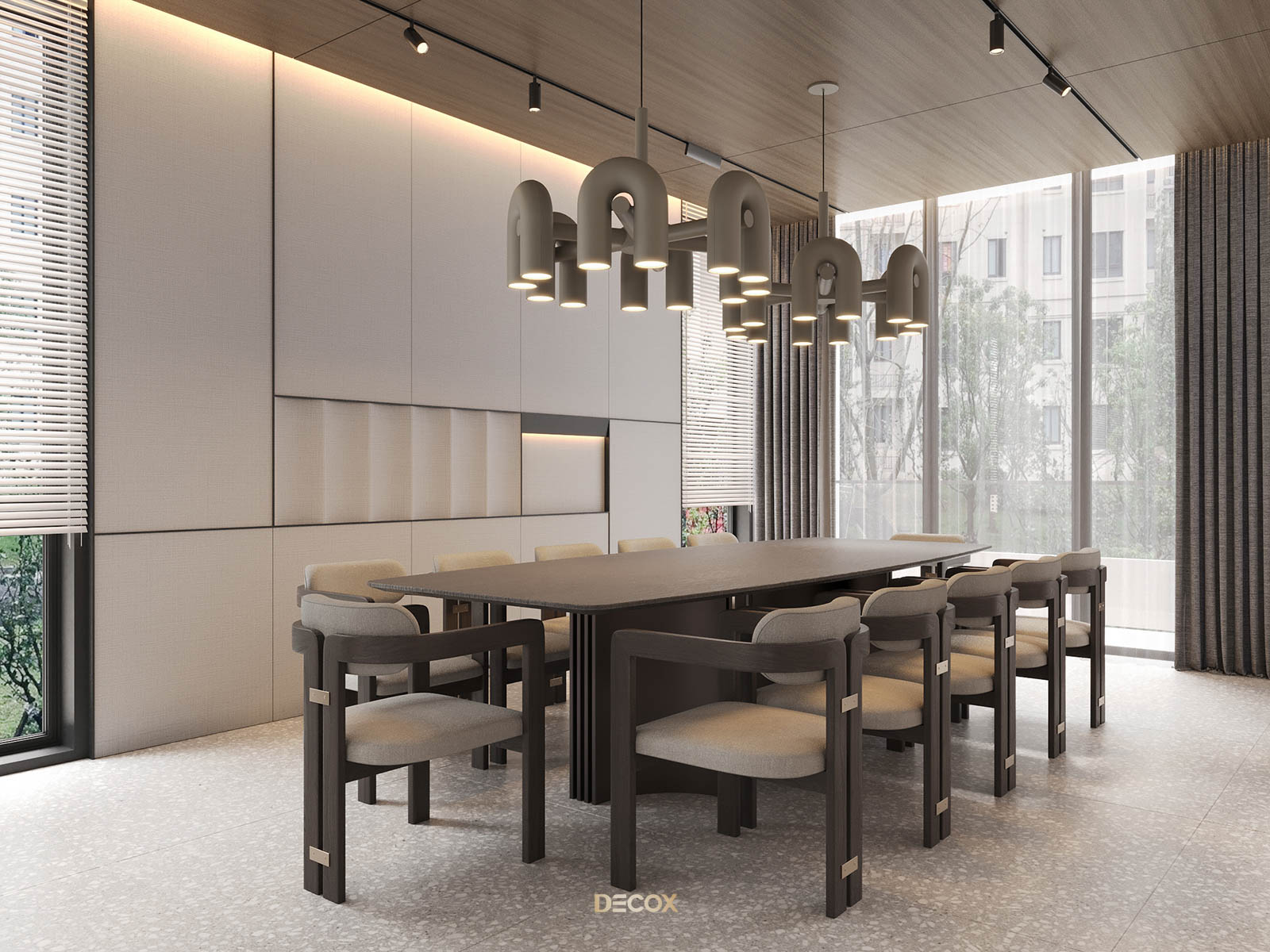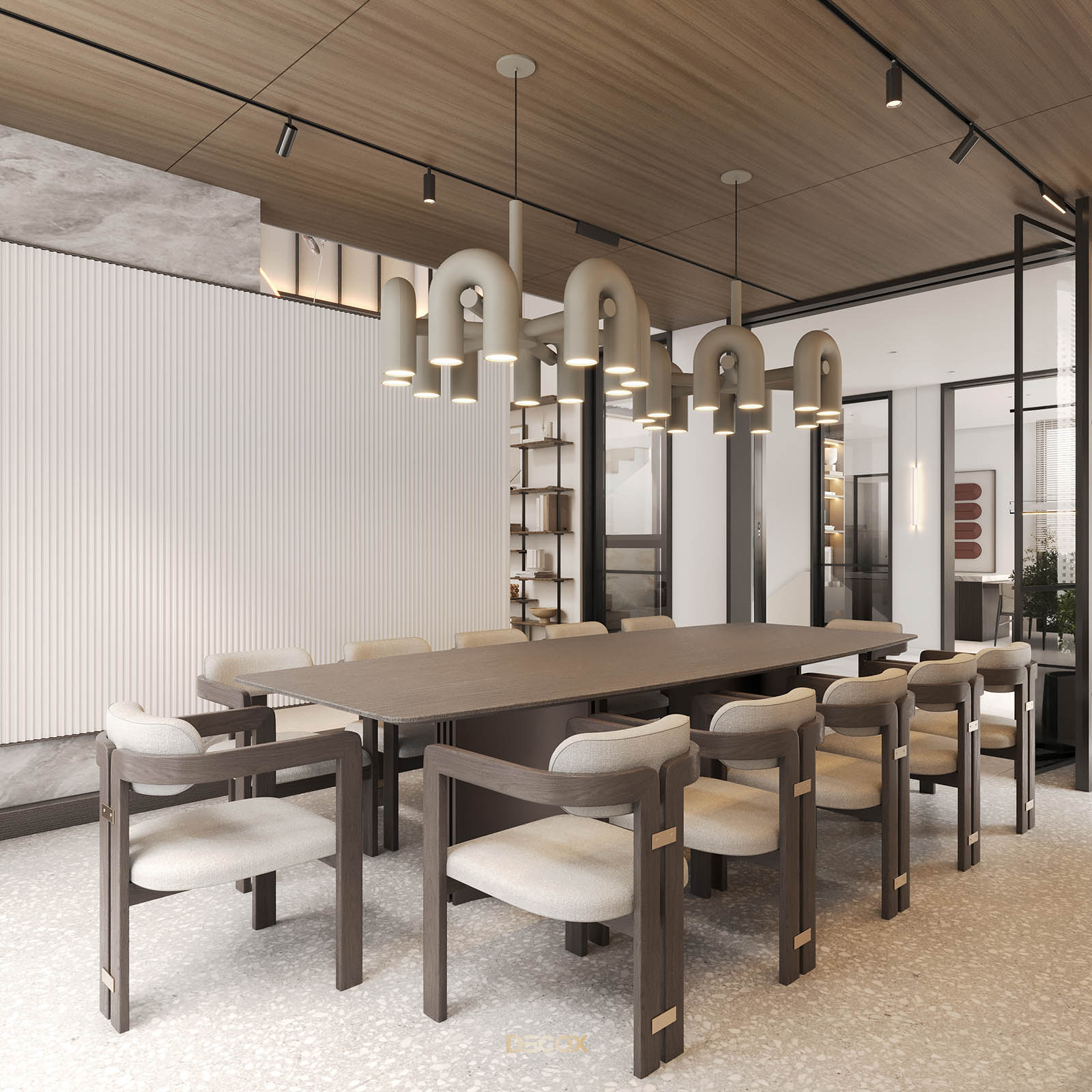 Không gian được thiết kế dựa trên tinh thần “less is more” - hiện đại và đủ đầy. Đó là bảng màu trung tính nhẹ nhàng, nhã nhặn chủ đạo kết hợp cùng tone màu gỗ ấm cúng. Số lượng, kiểu dáng nội thất cũng được tiết chế, tinh gọn để nhường chỗ cho ánh sáng, gió và cây xanh.