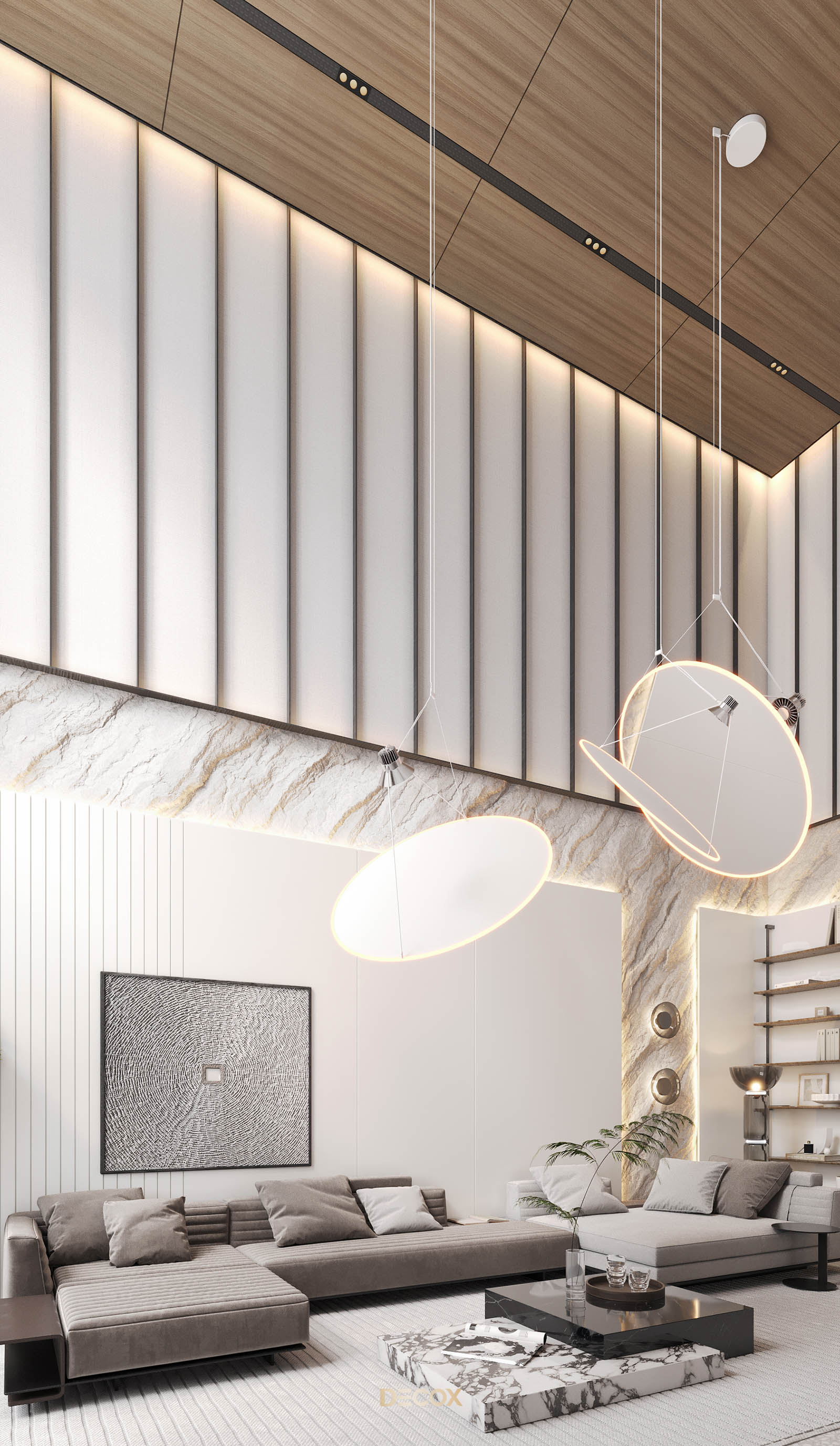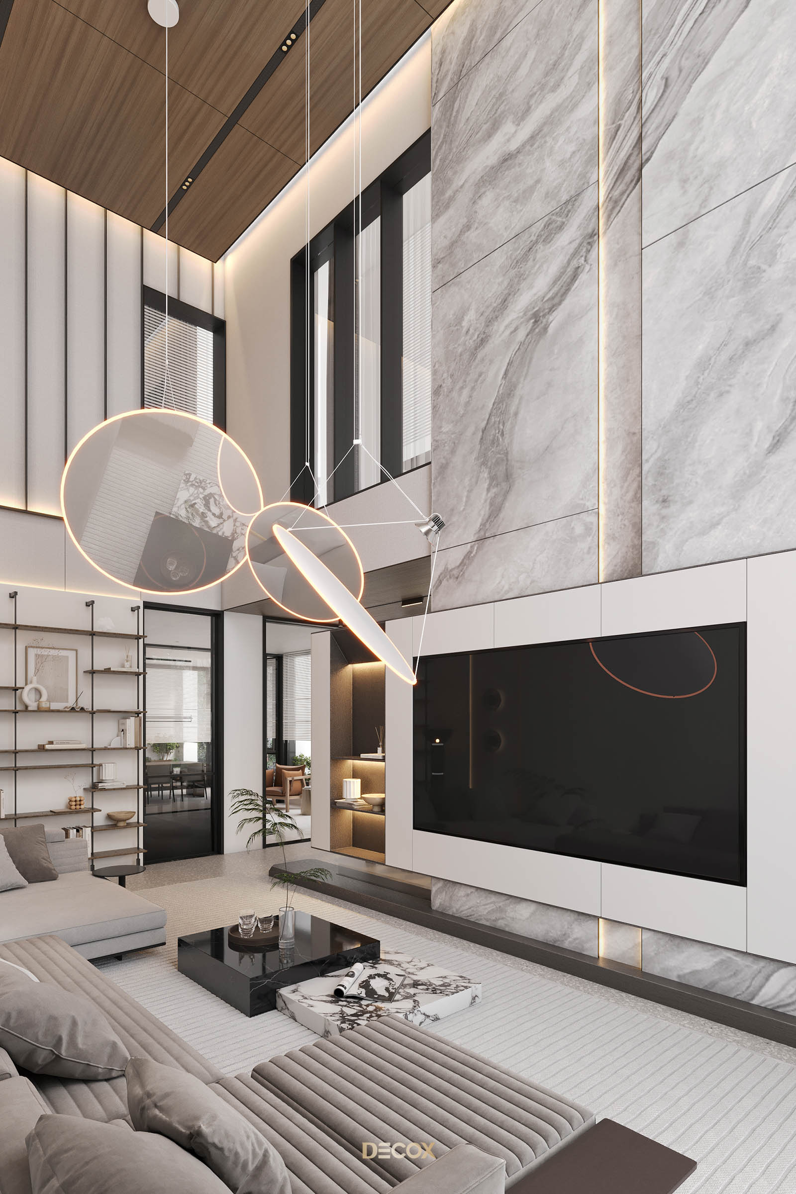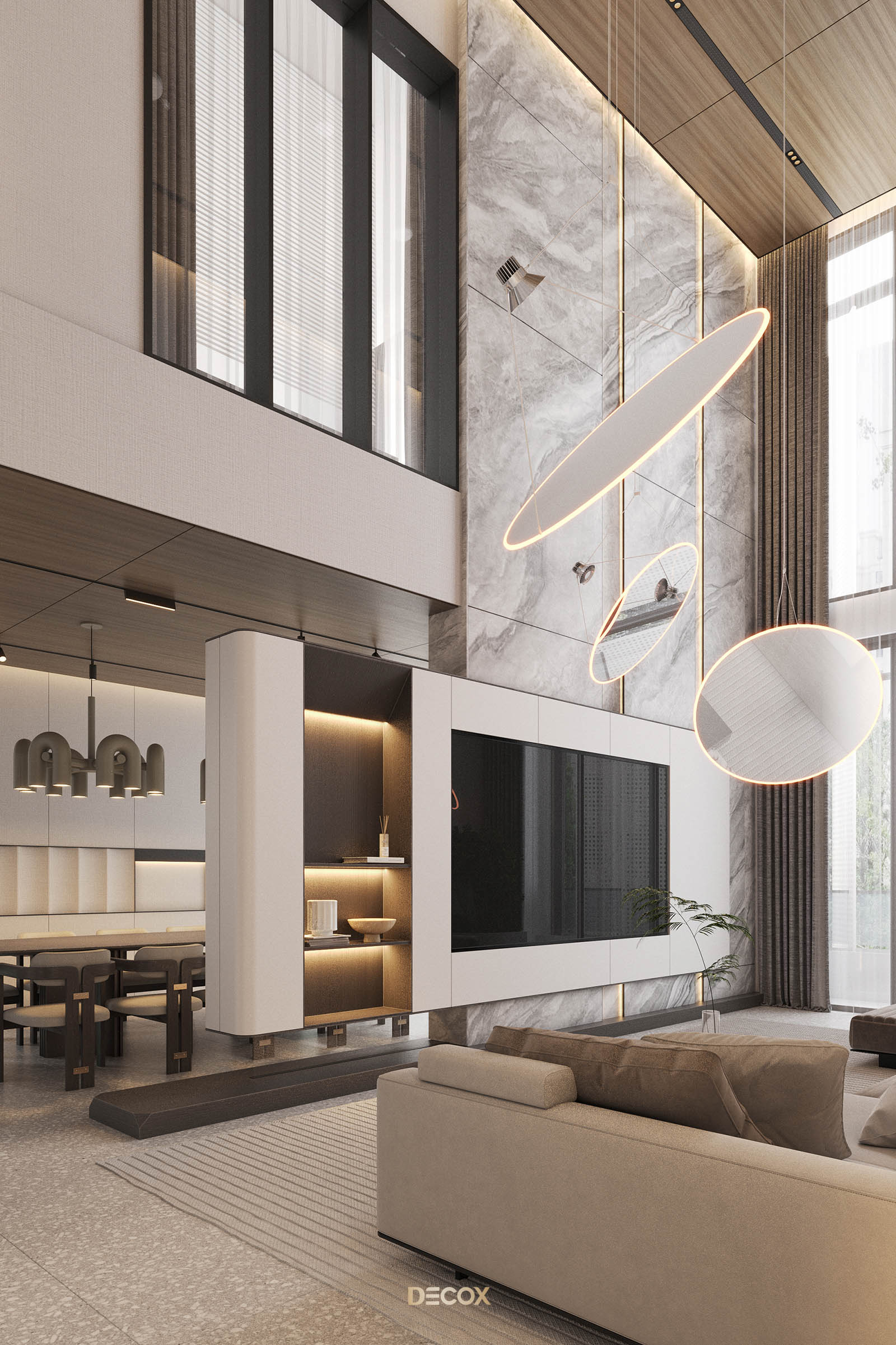 Là một căn nhà mặt phố nằm trên trục đường chính của Quận Bình Tân, thế nên để mở rộng không gian và nâng tầm view nhìn KTS Decox đã đưa ra quyết định thiết kế thông tầng ở khu vực khách bếp, phá vỡ đi cảm giác bí bách do trần nhà thấp mang lại. Đồng thời, việc hạn chế đi những vách ngăn cũng khiến không gian thêm rộng rãi và thoáng đãng hơn, phá vỡ cấu trúc ngột ngạt của những căn nhà trong đô thị.