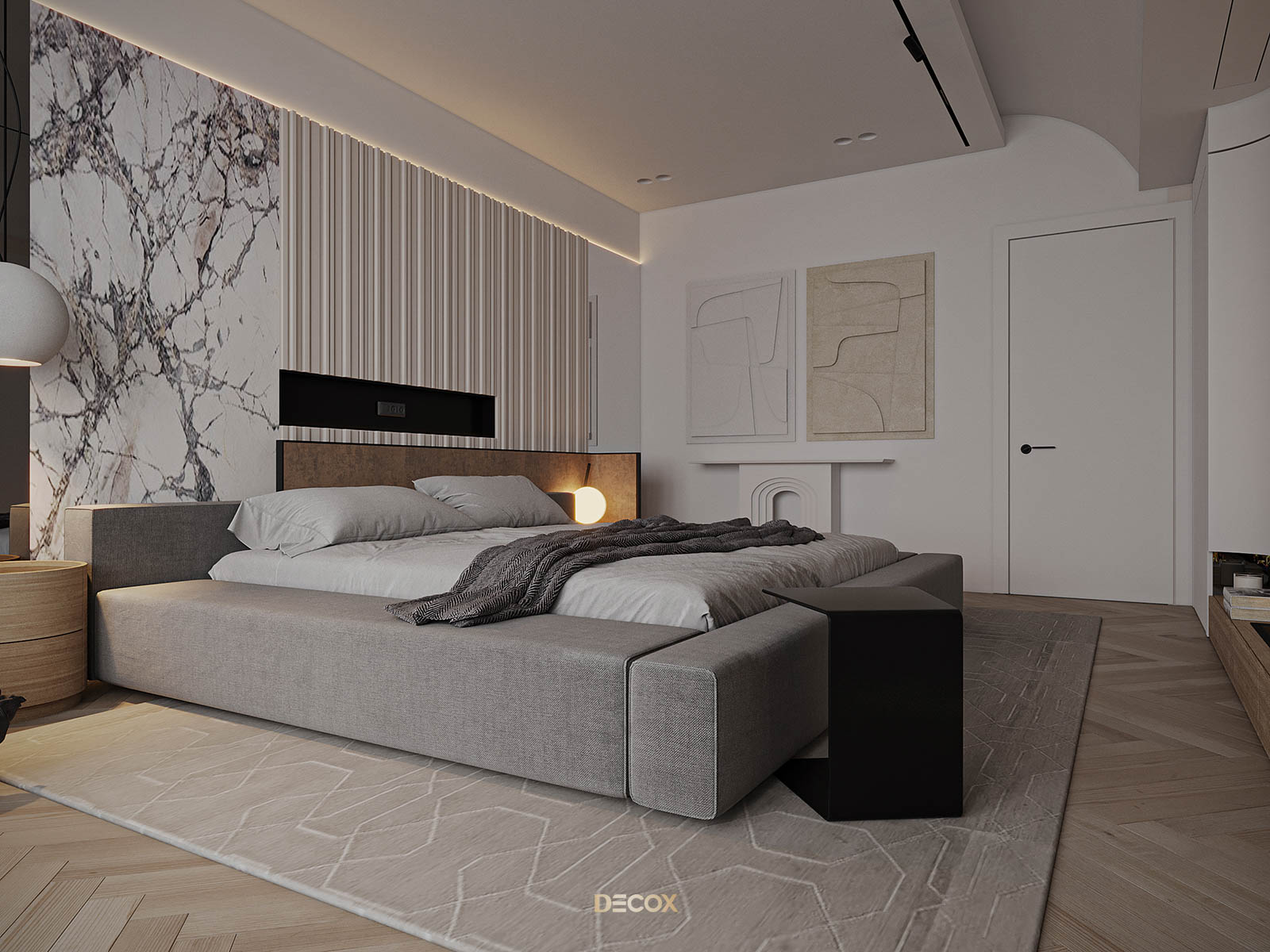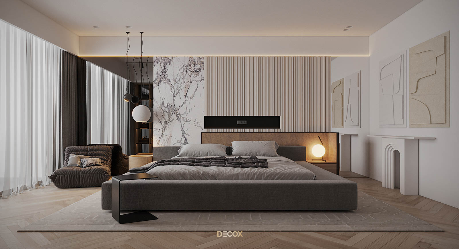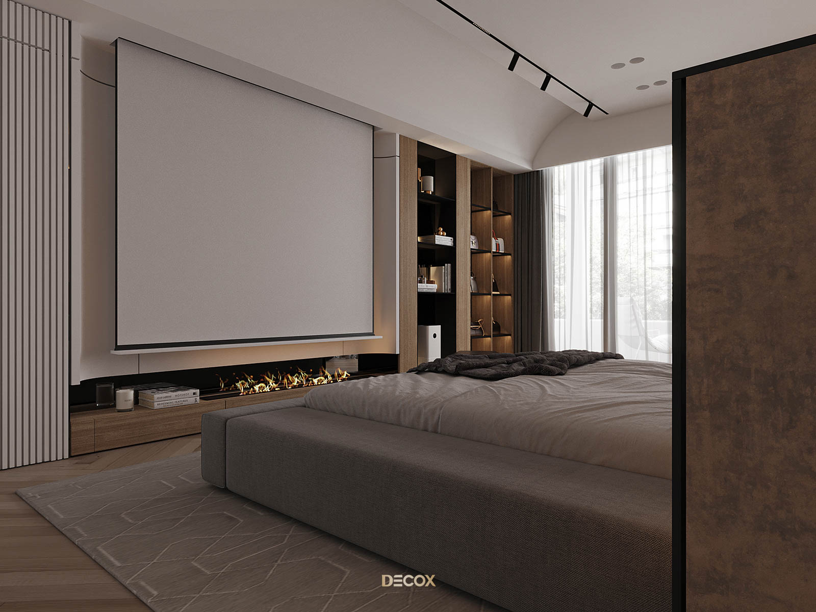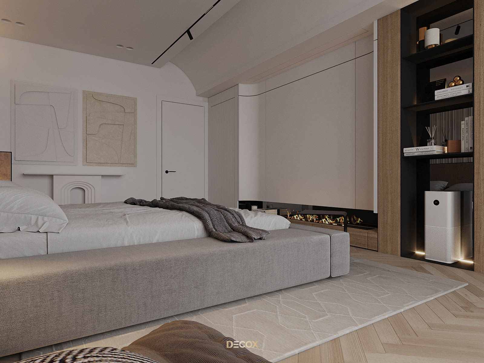 Về ngôn ngữ thiết kế, phòng ngủ master vẫn thể hiện đầy đủ tinh thần hiện đại, ấm cúng với bảng màu trung tính nhẹ nhàng, chủ yếu là màu trắng và màu của gỗ. Không gian phòng ngủ là sự tiếp nối của các khu vực chức năng từ nghỉ ngơi, thay đồ cho đến phòng tắm theo mô hình thiết kế mở. Tuy không có bất kỳ vách ngăn nào phân cách giữa các khu vực, thế nhưng, bằng những đường cong điệu đà, duyên dáng được sắp xếp có chủ đích ở khu vực trần, tường đã tạo sự chuyển tiếp nhẹ nhàng giữa các không gian.