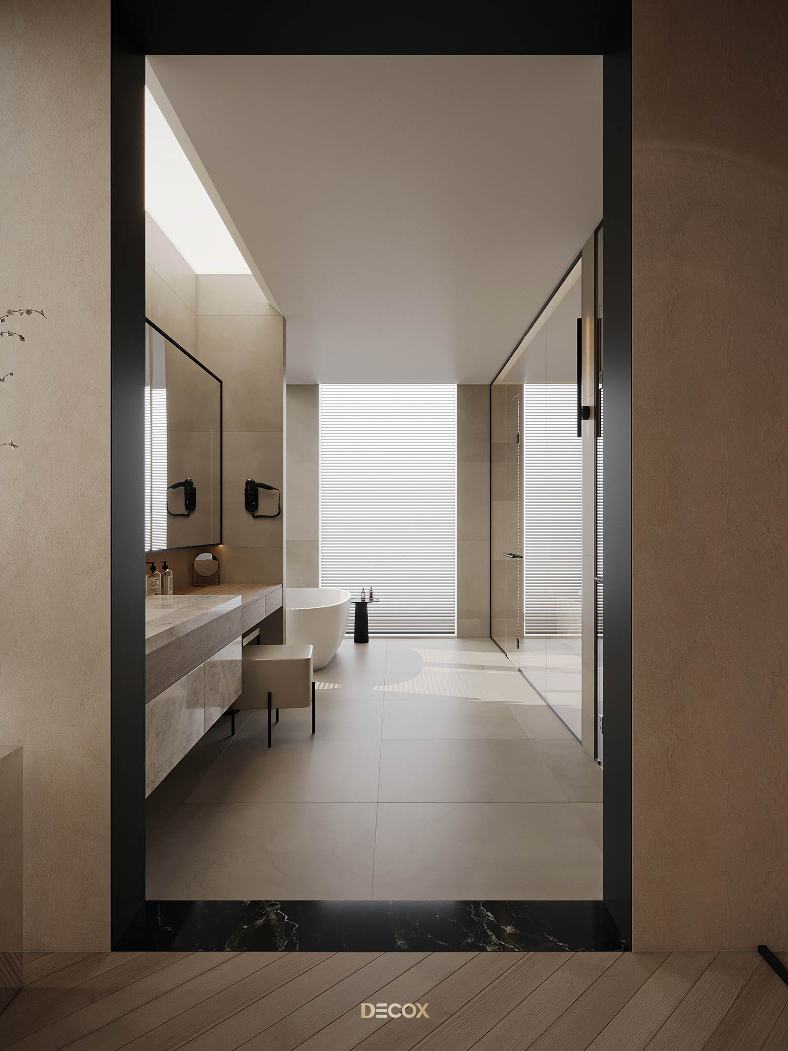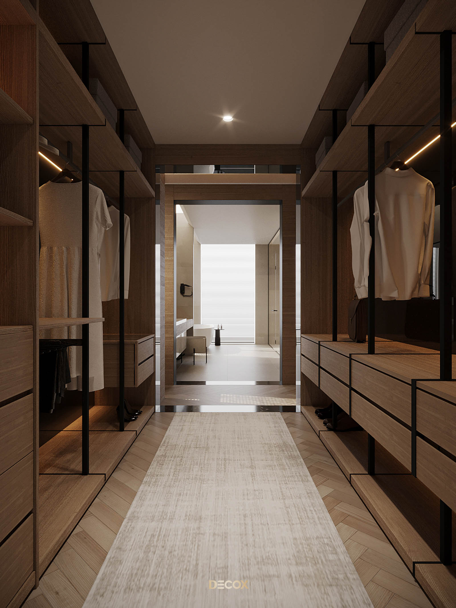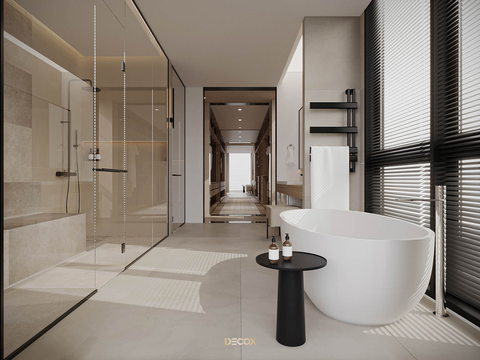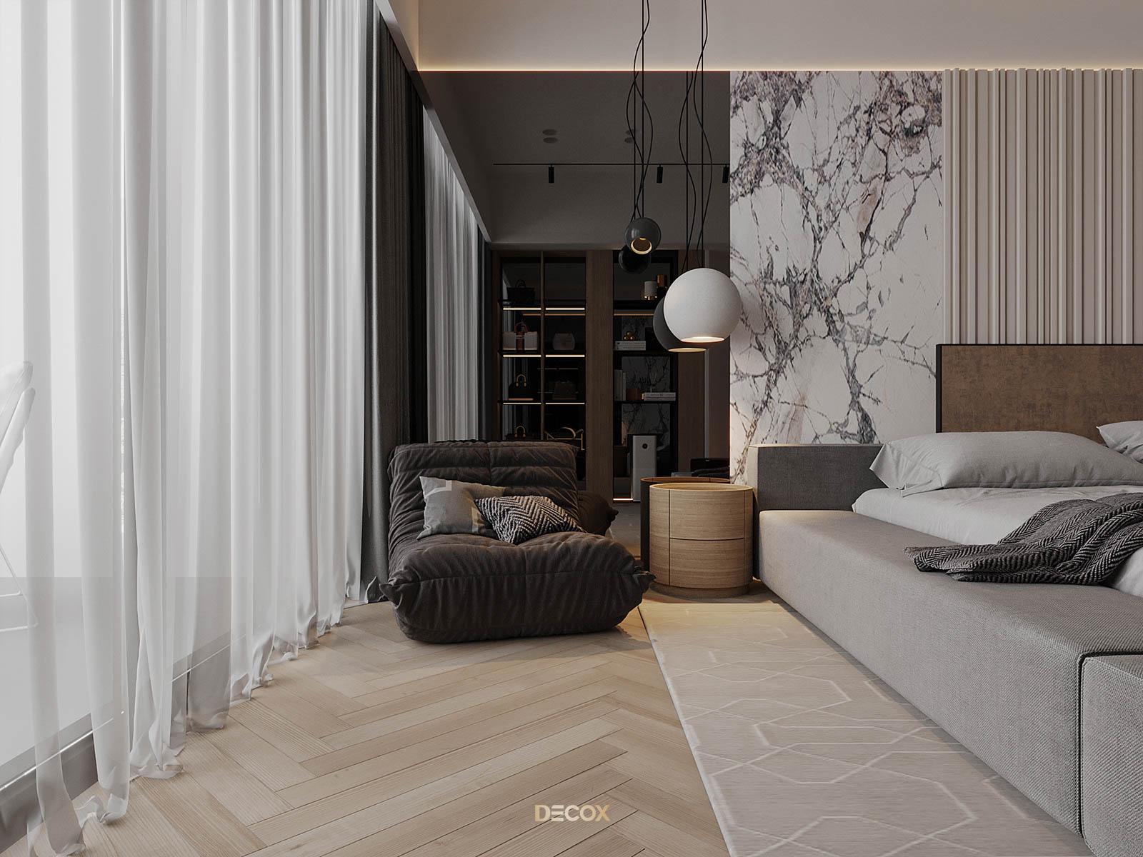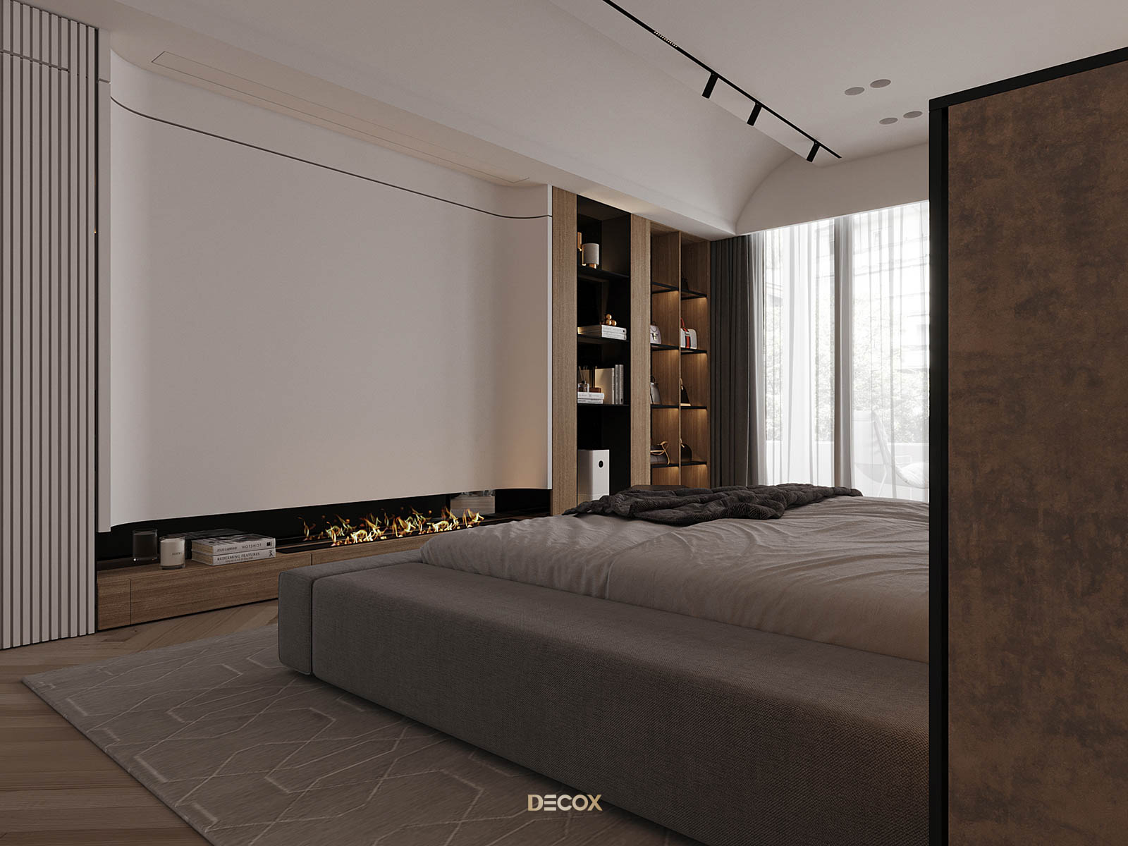 Về ngôn ngữ thiết kế, phòng ngủ master vẫn thể hiện đầy đủ tinh thần hiện đại, ấm cúng với bảng màu trung tính nhẹ nhàng, chủ yếu là màu trắng và màu của gỗ. Không gian phòng ngủ là sự tiếp nối của các khu vực chức năng từ nghỉ ngơi, thay đồ cho đến phòng tắm theo mô hình thiết kế mở. Tuy không có bất kỳ vách ngăn nào phân cách giữa các khu vực, thế nhưng, bằng những đường cong điệu đà, duyên dáng được sắp xếp có chủ đích ở khu vực trần, tường đã tạo sự chuyển tiếp nhẹ nhàng giữa các không gian.