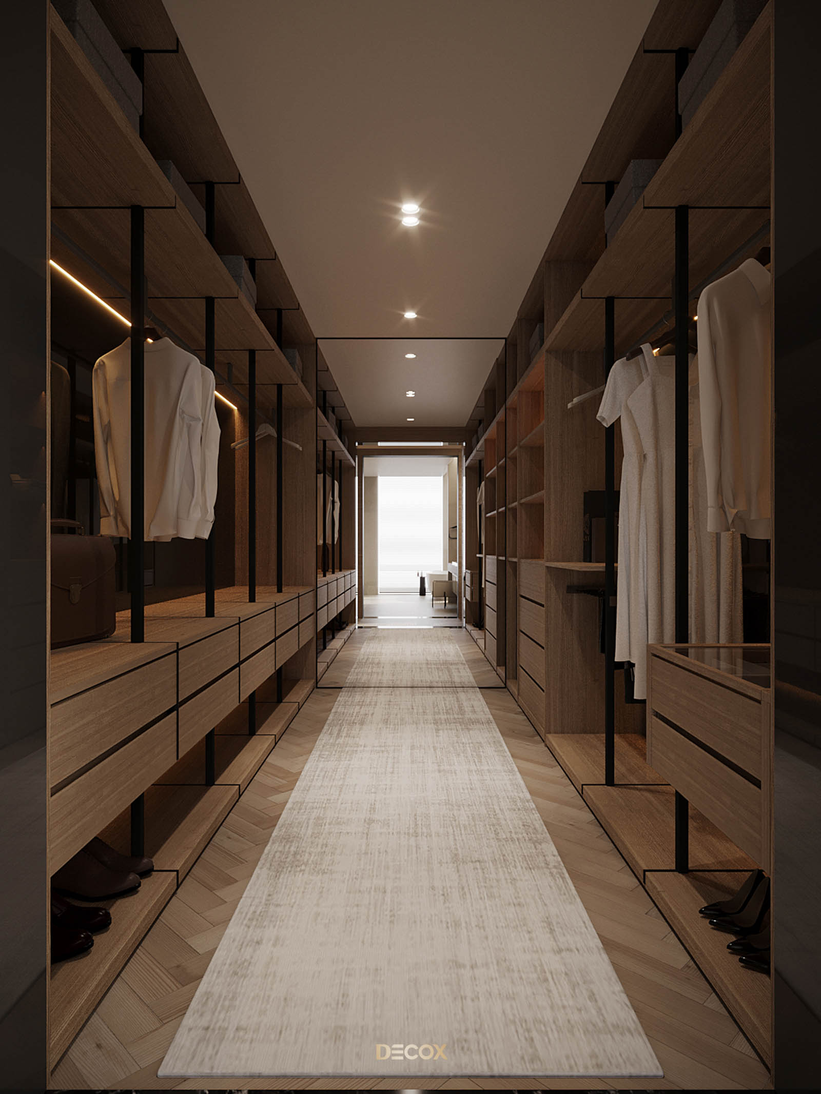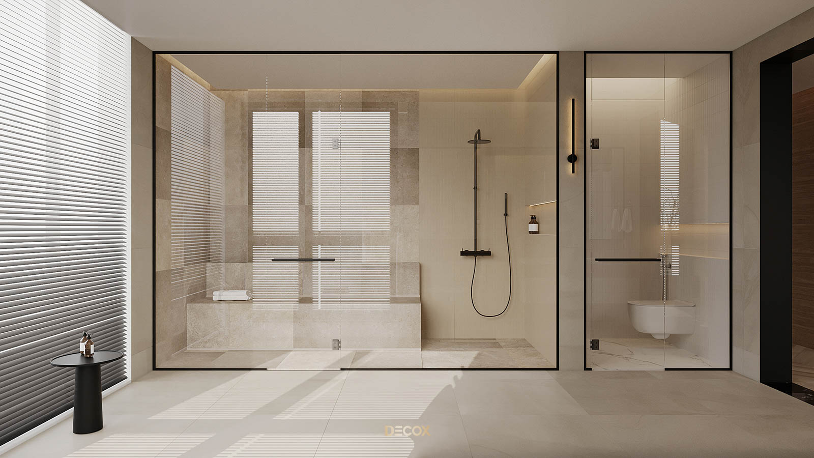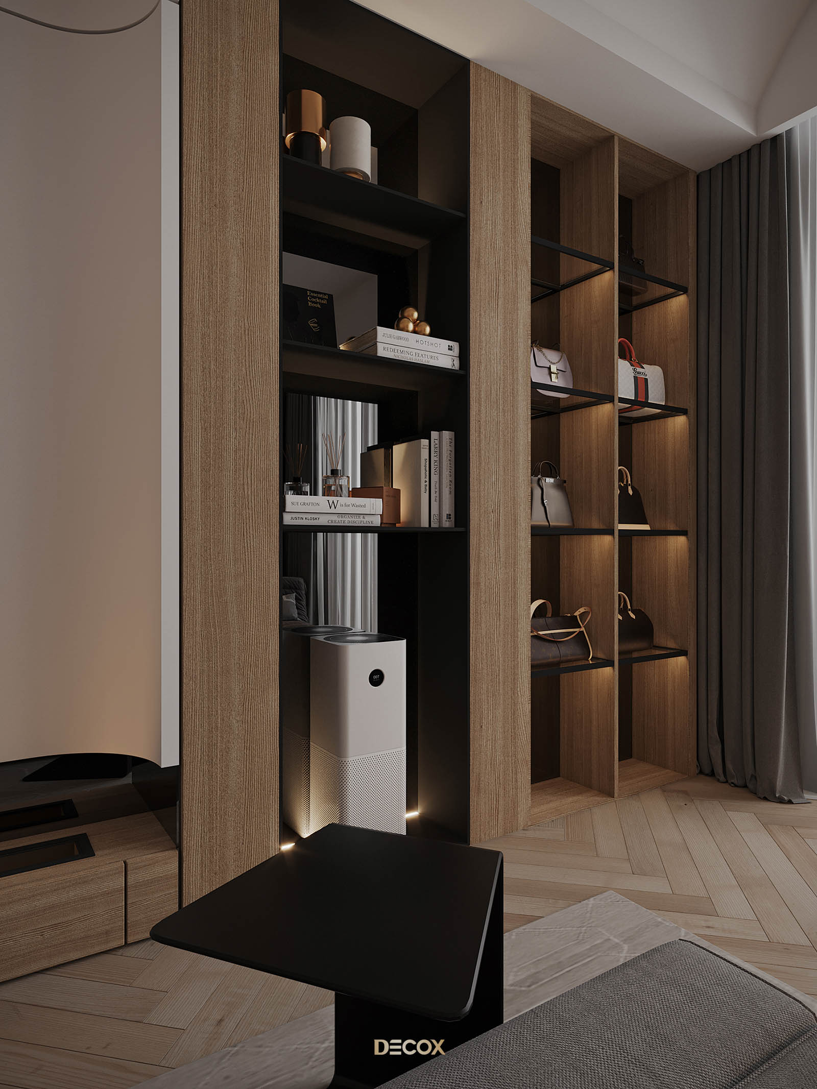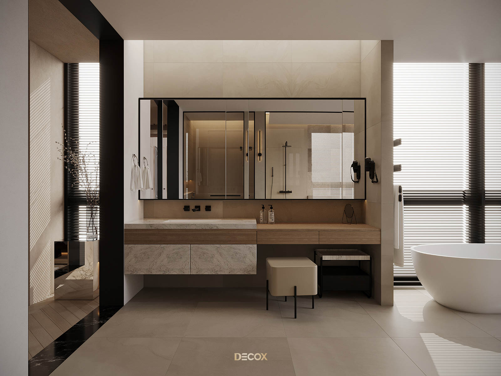 Về ngôn ngữ thiết kế, phòng ngủ master vẫn thể hiện đầy đủ tinh thần hiện đại, ấm cúng với bảng màu trung tính nhẹ nhàng, chủ yếu là màu trắng và màu của gỗ. Không gian phòng ngủ là sự tiếp nối của các khu vực chức năng từ nghỉ ngơi, thay đồ cho đến phòng tắm theo mô hình thiết kế mở. Tuy không có bất kỳ vách ngăn nào phân cách giữa các khu vực, thế nhưng, bằng những đường cong điệu đà, duyên dáng được sắp xếp có chủ đích ở khu vực trần, tường đã tạo sự chuyển tiếp nhẹ nhàng giữa các không gian.
