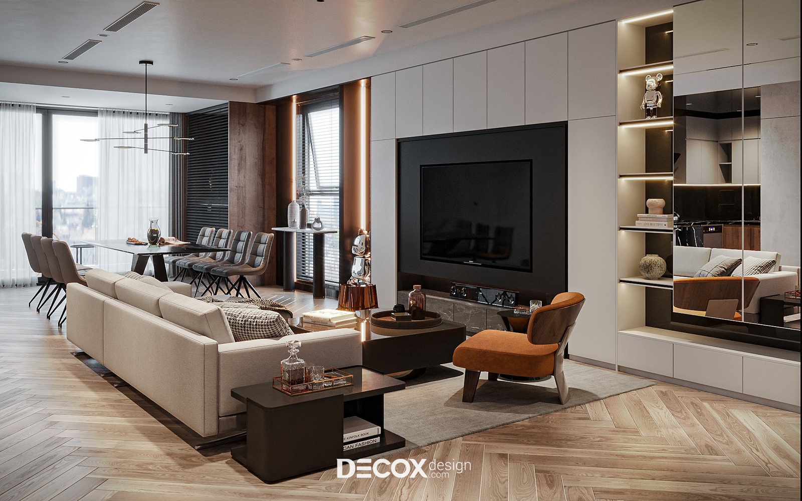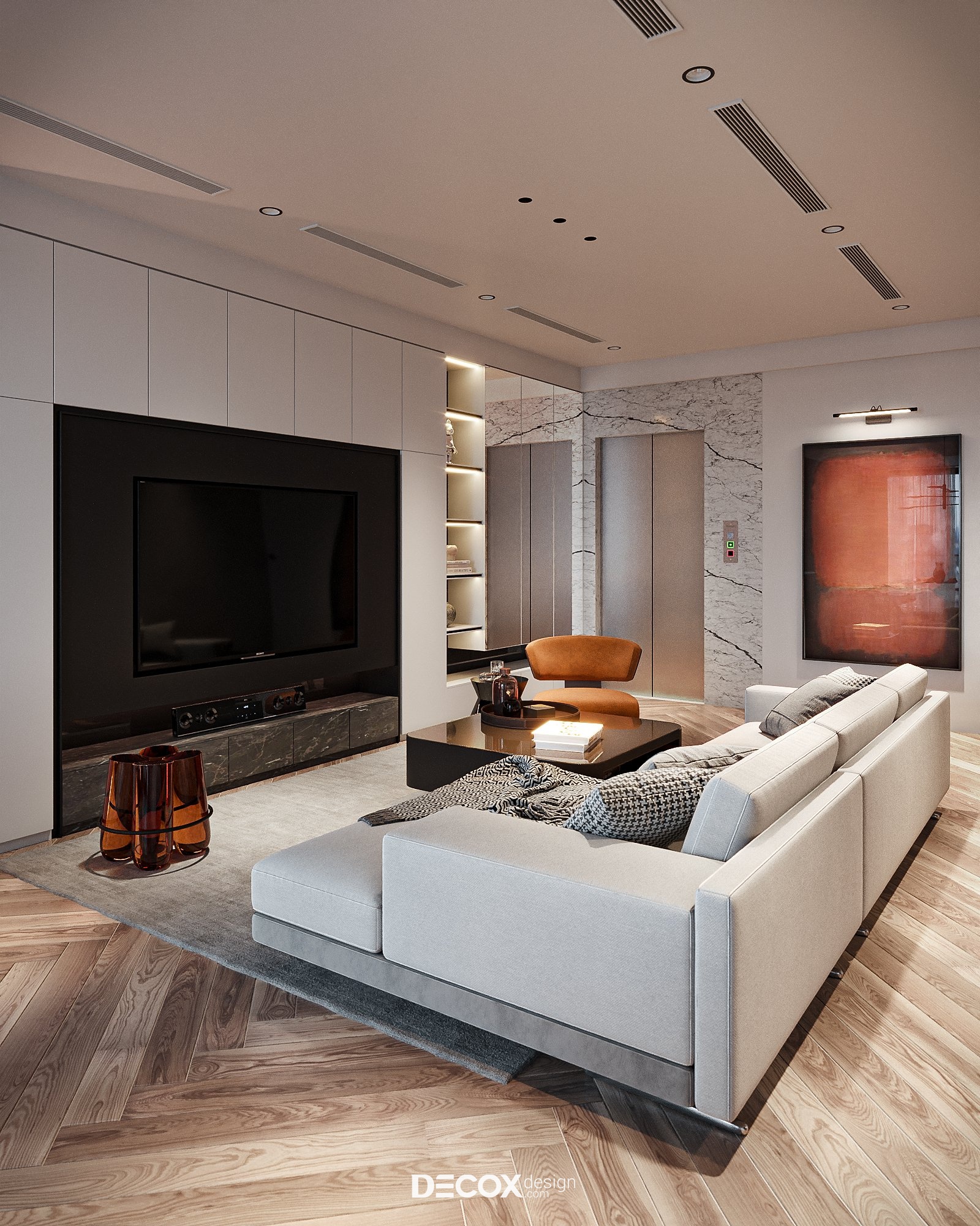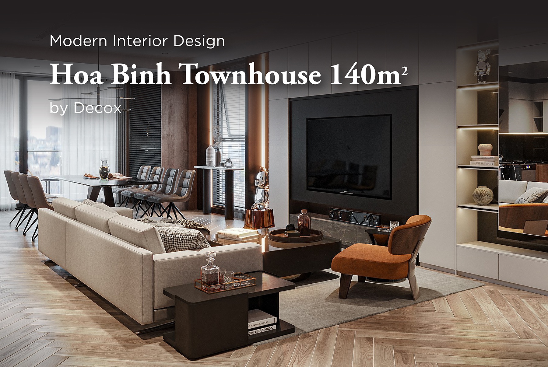 Về tổng thể, không gian nội thất mang lại cảm quan về sự sang trọng, tinh tế với phong cách hiện đại đóng vai trò chủ đạo kết hợp cùng chất liệu, nội thất cao cấp và cách phối trộn màu sắc, ánh sáng đầy khéo léo. Tuy sử dụng đan xen những tone màu trung tính chủ đạo tưởng chừng như đơn giản, tẻ nhạt thế nhưng với cách bổ sung khéo léo những gam màu nóng bỏng trên nội thất, đồ trang trí đã khiến căn nhà như “lột xác”. Cách thiết kế nội thất này không chỉ đem đến hiệu quả kích thích thị giác mà còn tạo điểm nhấn giúp không gian thêm phần thu hút, quyến rũ.