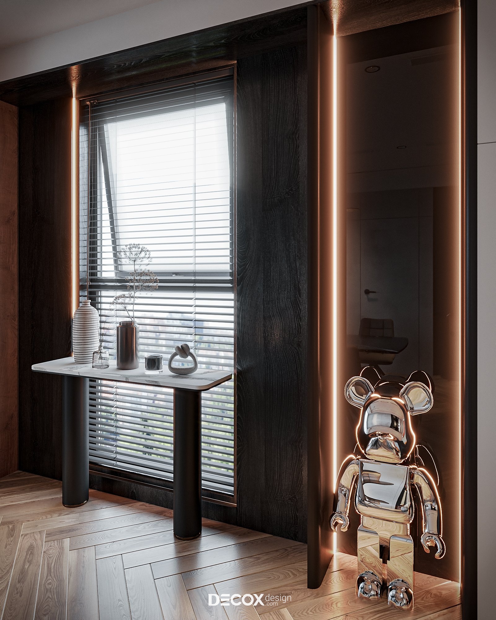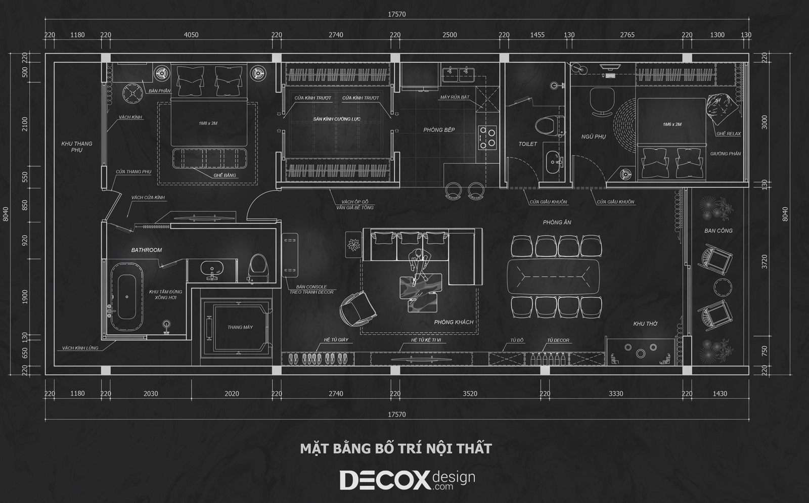 Với yêu cầu cải tạo một tầng trong nhà để biến nơi đây thành một không gian “chung cư” thực thụ phục vụ cho việc sinh hoạt, nghỉ ngơi của gia đình, Decox Design đã chủ trương phân chia mặt bằng thành các khu vực chức năng gồm: phòng khách, bếp, phòng ăn, phòng ngủ master và phòng ngủ phụ.