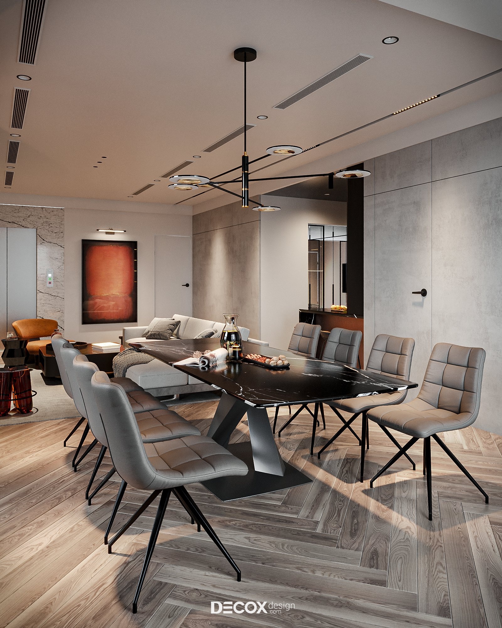 Bên cạnh phòng khách chính là khu vực phòng ăn. Ở đây, KTS đã sử dụng bộ bàn ăn lớn sử dụng được cho 8 - 10 thành viên. Trong đó, trung tâm khu vực này phải kể đến bộ bàn ăn mặt đá marble tia chớp đen kết hợp cùng ghế ăn bọc da êm ái và đèn thả trần kiểu dáng độc đáo, cá tính gợi tổng thể cao cấp, phù hợp với phong cách chung mà concept đang hướng đến.