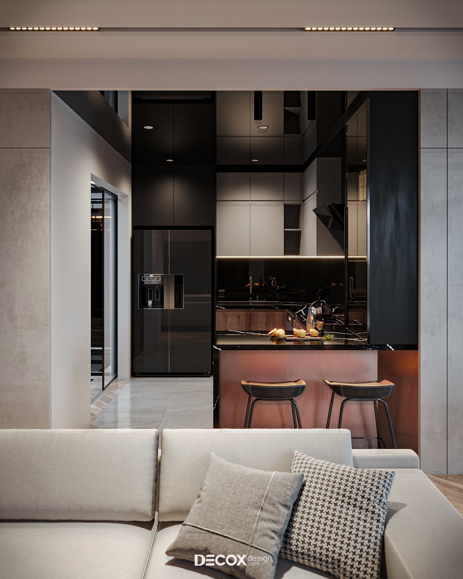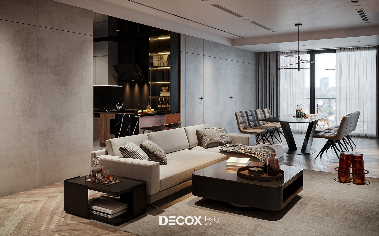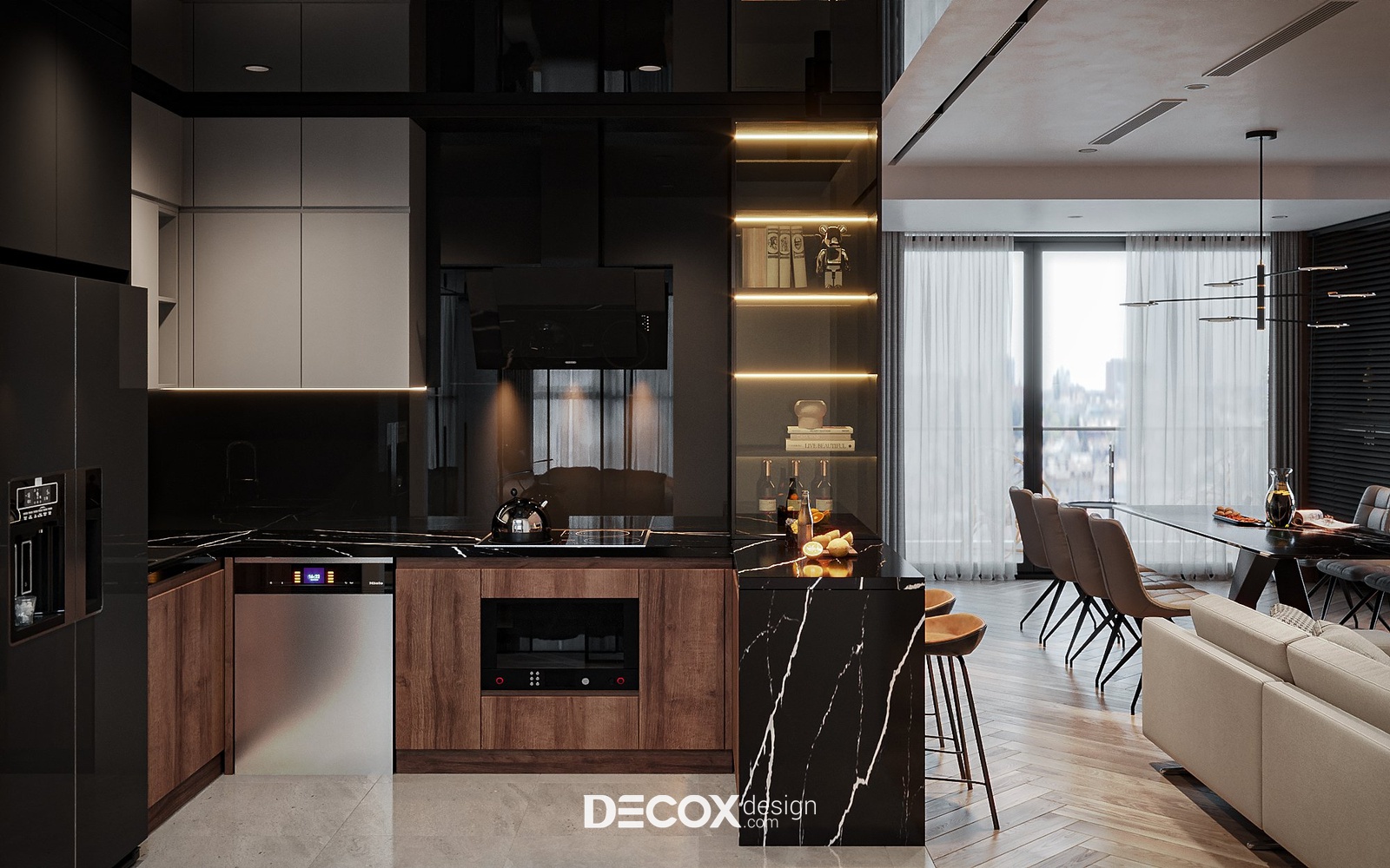 Khách - bếp và phòng ăn đều được thiết kế theo dạng mở nhằm tạo sự rộng, thoáng cho không gian và đảm bảo tính tiện lợi trong việc di chuyển, sinh hoạt. Khu bếp được thiết kế theo hình chữ U, trong đó, một cạnh bếp được linh hoạt sử dụng như quầy bar mini, điều này giúp tăng công năng sử dụng đồng thời phân định ngầm không gian bếp với các khu vực khác và đảm bảo tính riêng tư cần thiết cho người đứng bếp. Màu sắc và chất liệu sử dụng ở không gian này vẫn bám sát theo tinh thần hiện đại, cao cấp của nhà với sự kết hợp giữa ba tone màu đen - xám - gỗ vừa sang trọng lại vừa gần gũi, thân thuộc.