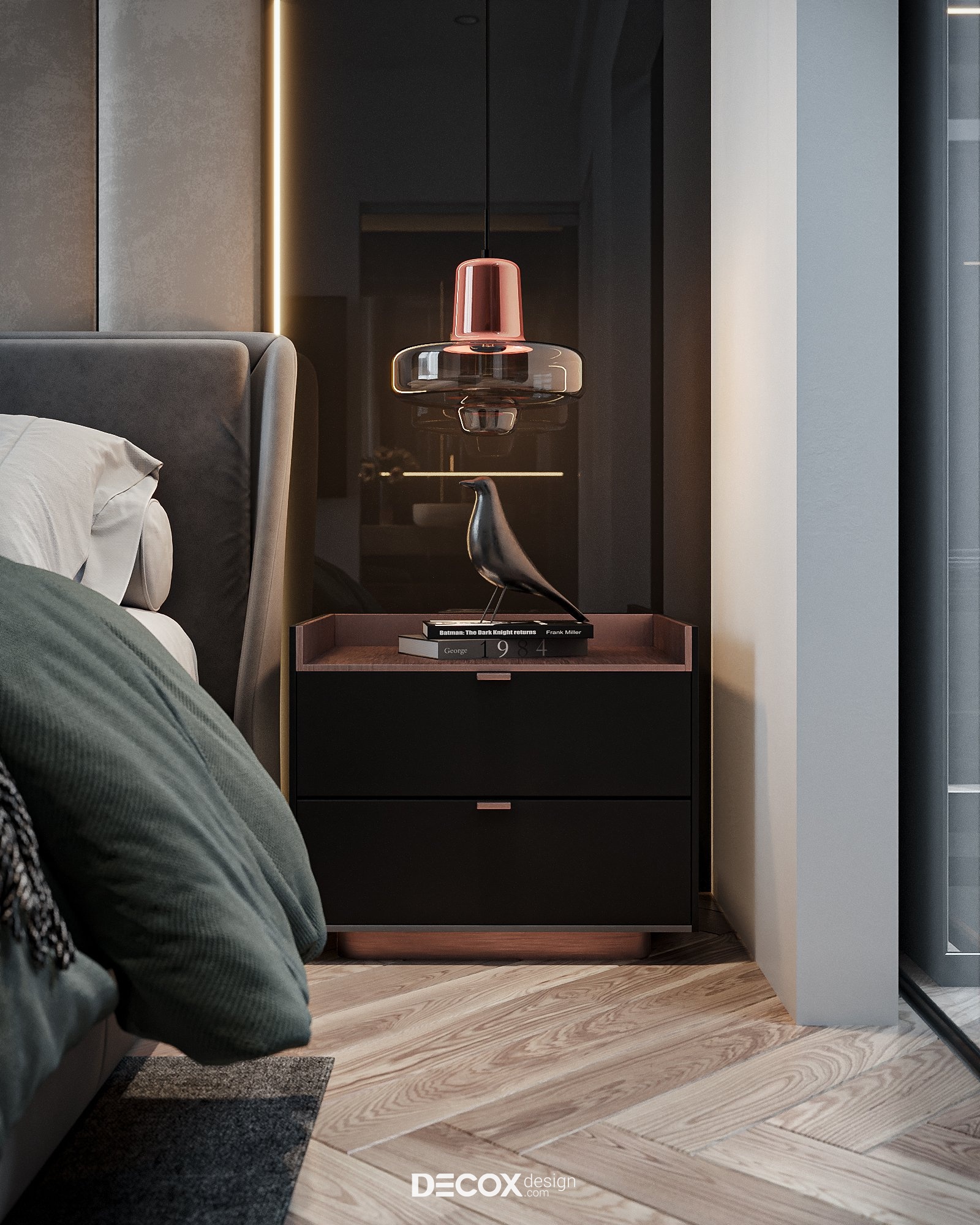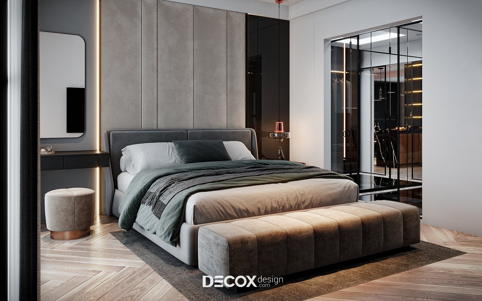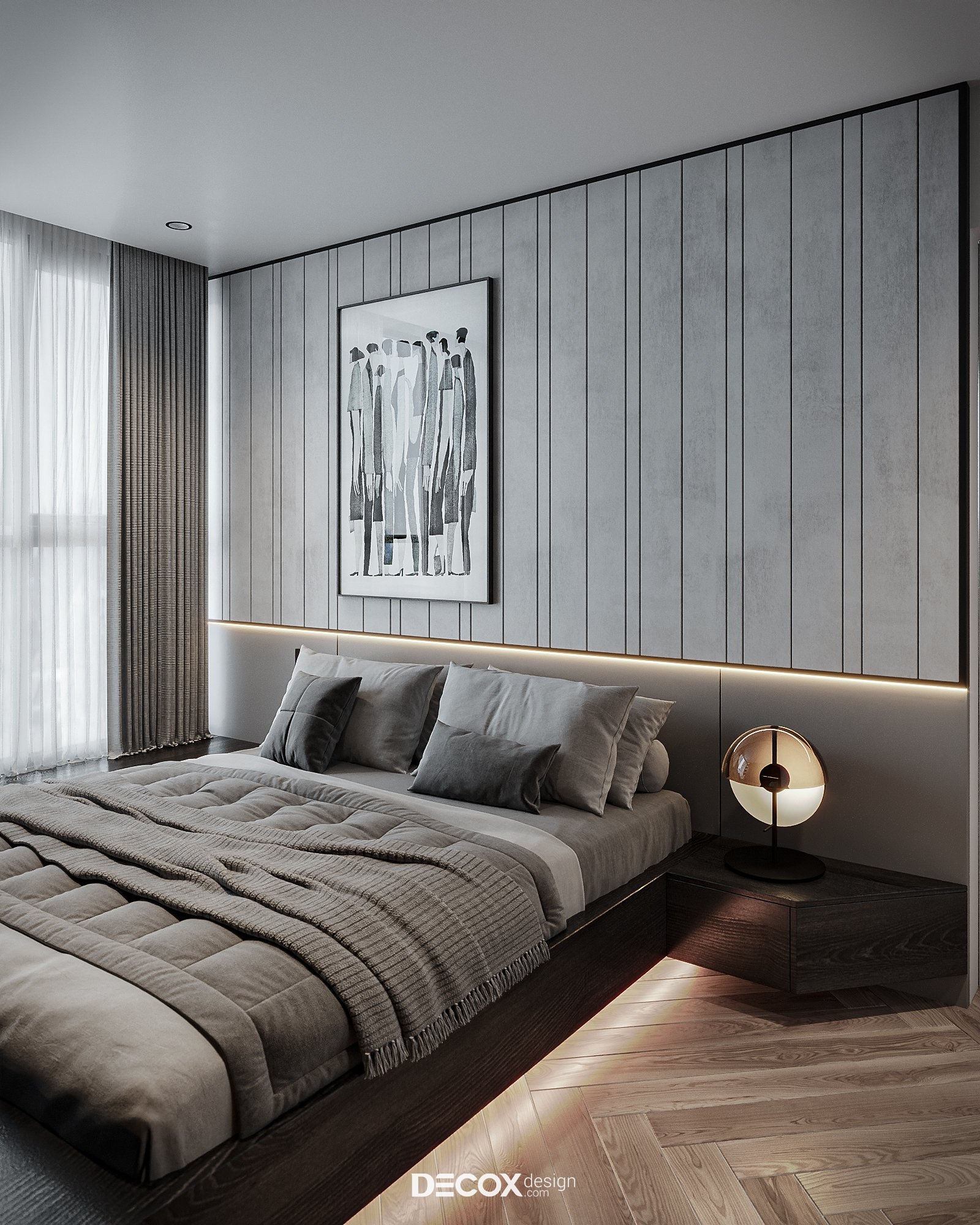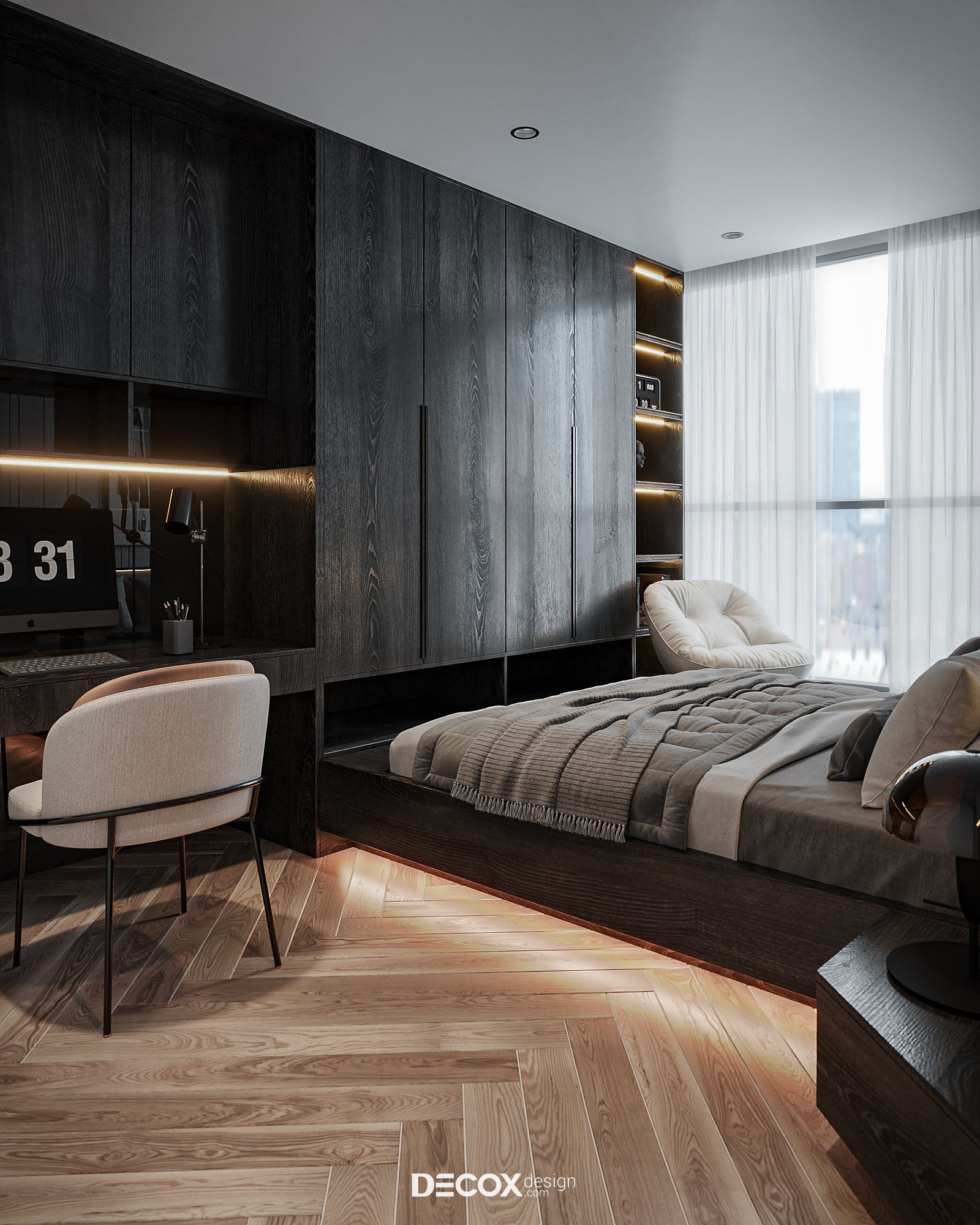 Không gian phòng ngủ cá tính với sự phối ngẫu của các tone màu trầm. Điểm đặc biệt trong concept này chính là nội thất được thiết kế theo dạng “combo” với kích thước được “đo ni đóng cọc” thăng hạng vẻ đẹp không gian sống. Ngoài màu sắc, yếu tố ánh sáng cũng được chú trọng nhằm tạo bầu không gian lãng mạn, ấm cúng và nuông chiều những giấc ngủ ngon. Dễ thấy nhất chính là đèn hắt được bố trí ở vách ốp đầu giường và dưới chân giường tạo điểm nhấn cho khu vực trung tâm phòng. Ngoài ra, đèn hắt còn được bố trí dọc theo các hệ kệ tủ làm “bừng sáng” những công năng quan trọng trong phòng.