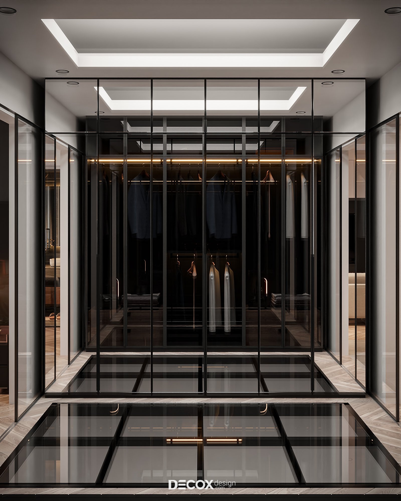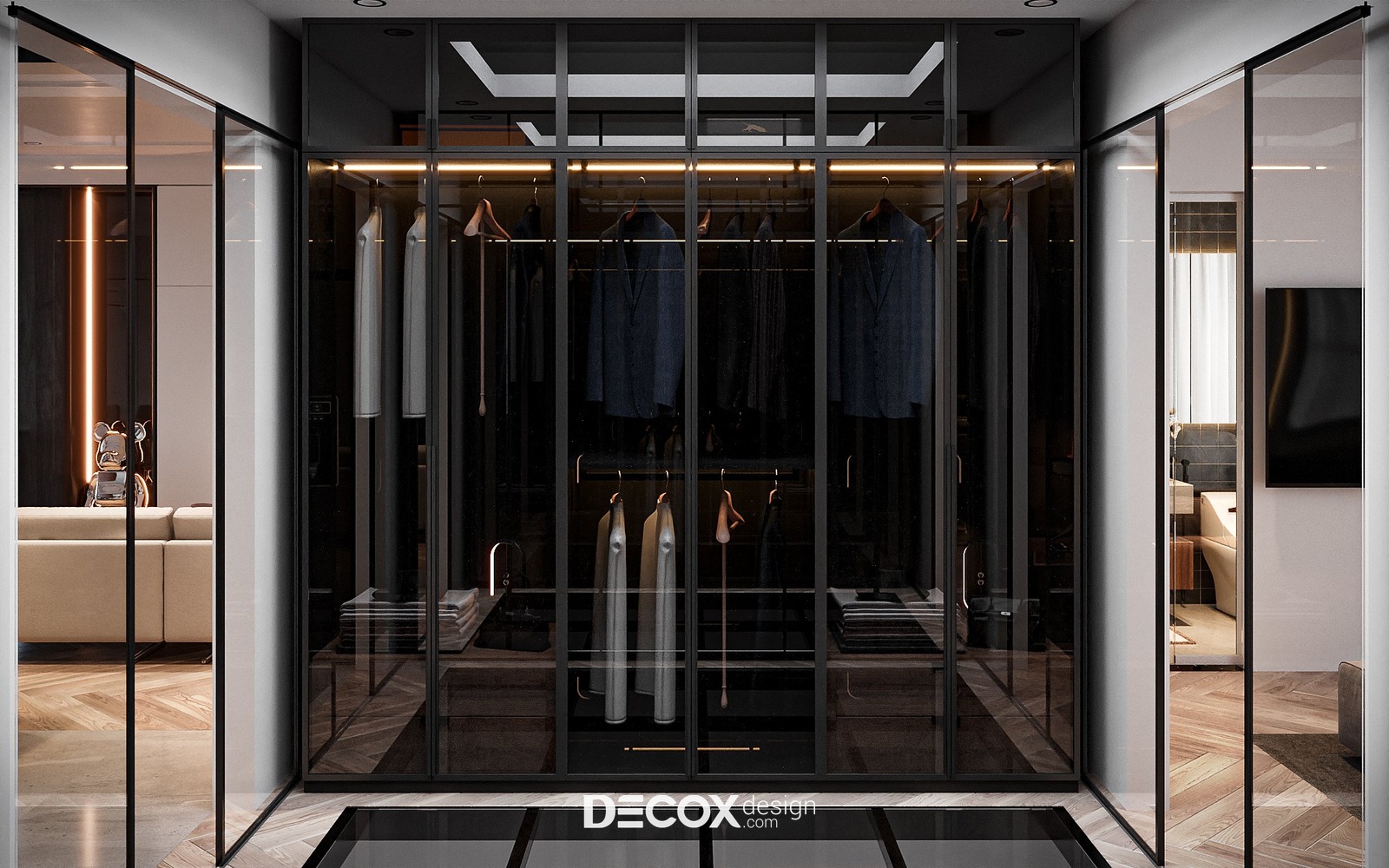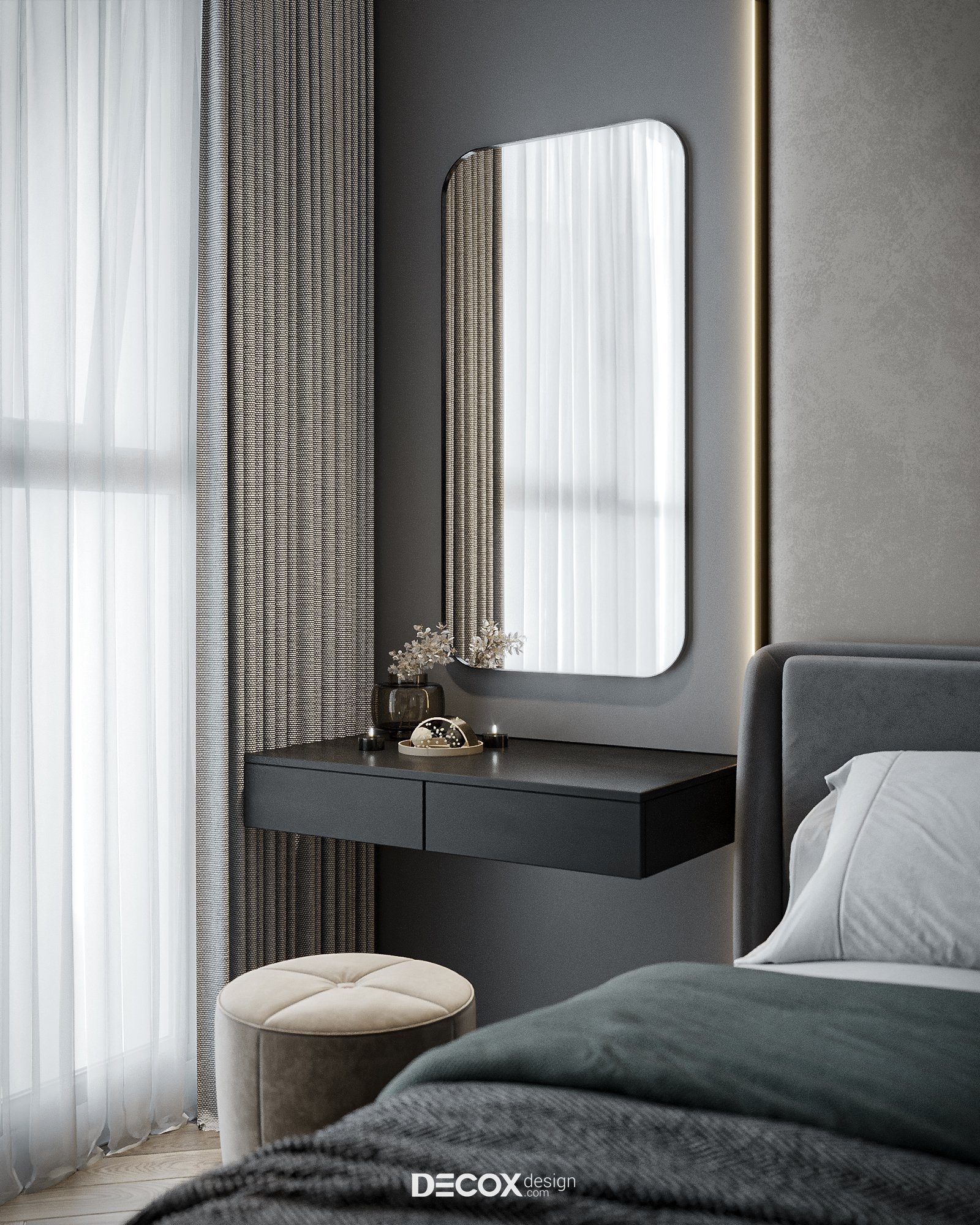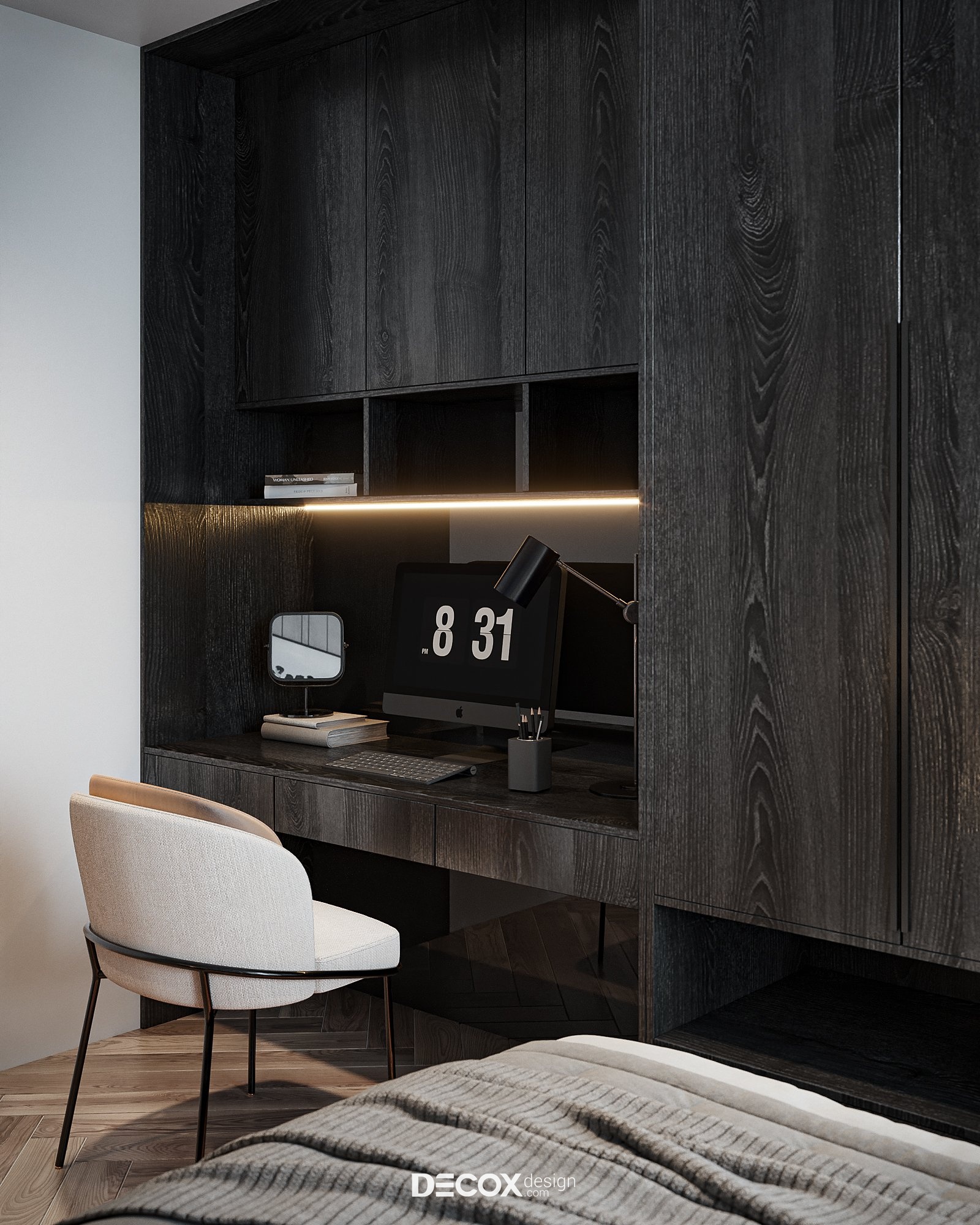 Không gian phòng ngủ cá tính với sự phối ngẫu của các tone màu trầm. Điểm đặc biệt trong concept này chính là nội thất được thiết kế theo dạng “combo” với kích thước được “đo ni đóng cọc” thăng hạng vẻ đẹp không gian sống. Ngoài màu sắc, yếu tố ánh sáng cũng được chú trọng nhằm tạo bầu không gian lãng mạn, ấm cúng và nuông chiều những giấc ngủ ngon. Dễ thấy nhất chính là đèn hắt được bố trí ở vách ốp đầu giường và dưới chân giường tạo điểm nhấn cho khu vực trung tâm phòng. Ngoài ra, đèn hắt còn được bố trí dọc theo các hệ kệ tủ làm “bừng sáng” những công năng quan trọng trong phòng.