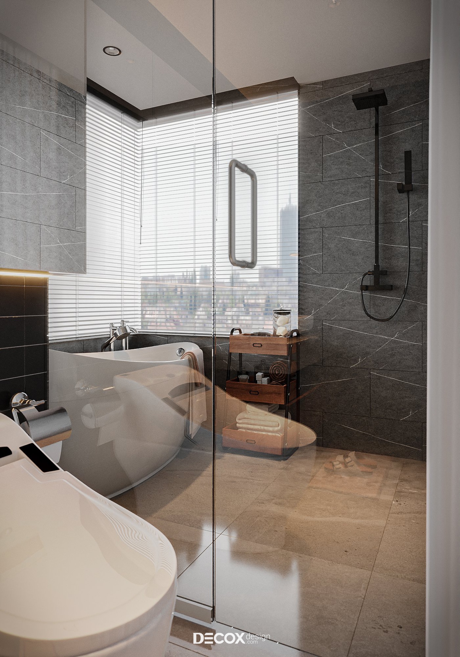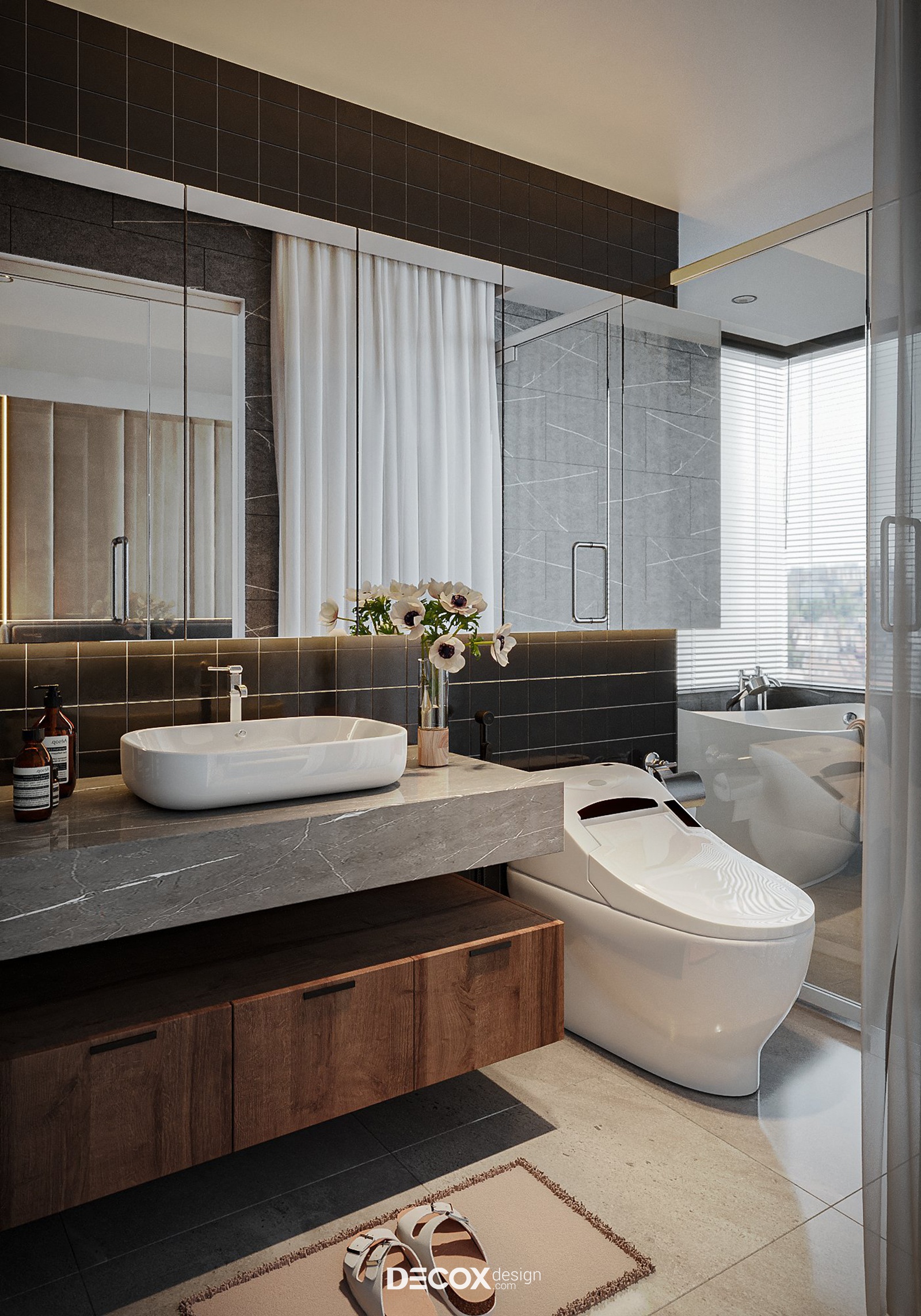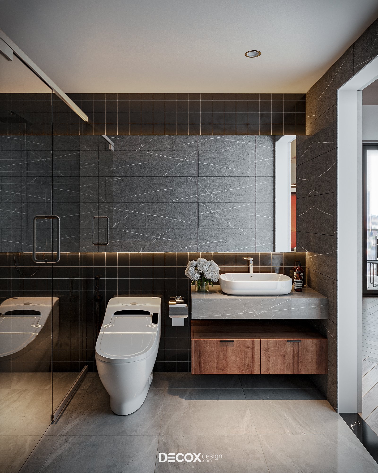 Bằng cách ốp đá xuyên suốt khắp các mặt tường kết hợp cùng nội thất cao cấp đã góp phần tô điểm sang trọng cho không gian WC. Thay vì sử dụng gương treo tường khu vực bồn rửa tay, KTS đã linh hoạt bố trí hệ tủ ốp gương bên ngoài vừa có chức năng tương tự vừa tăng thêm không gian lưu trữ và tạo hiệu ứng mở rộng không gian.