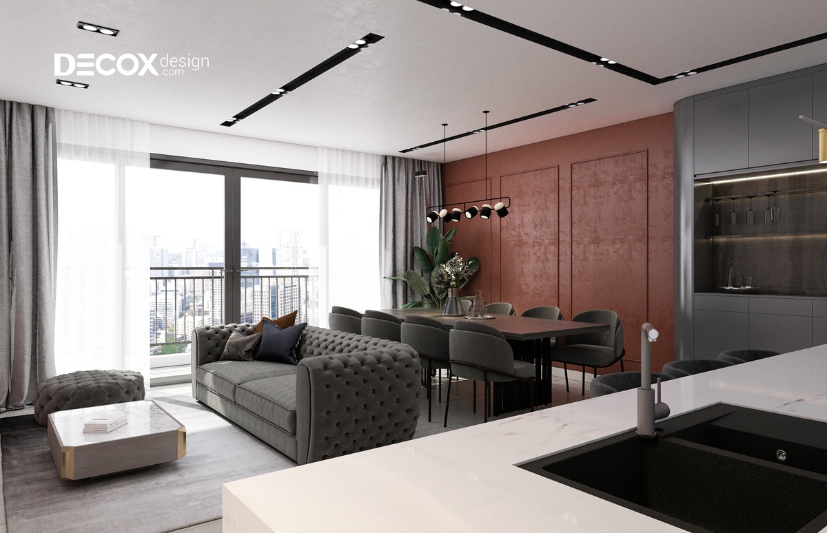 Căn hộ được thiết kế theo phong cách bán cổ điển đồng thời cũng pha thêm một ít tinh thần của hiện đại, nó tạo nên sự tươi mới, độc đáo nhưng vẫn giữ được tính sang trọng, tinh tế trong tường không gian.