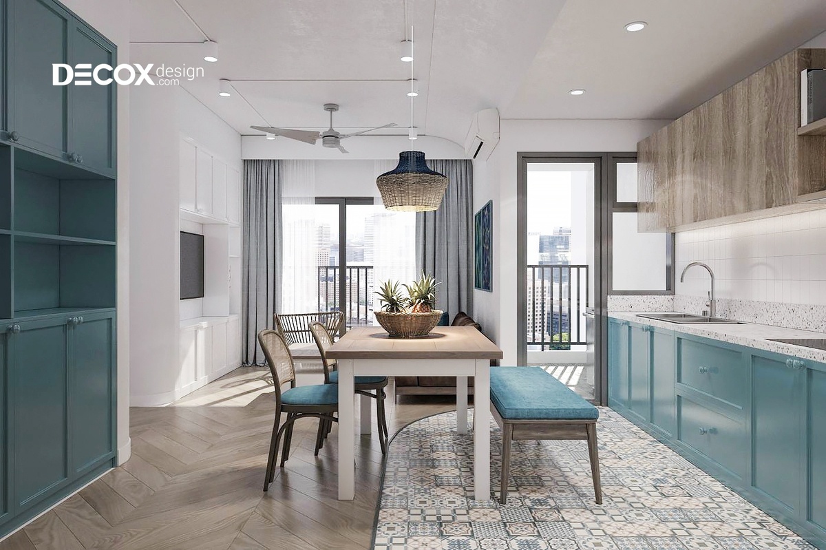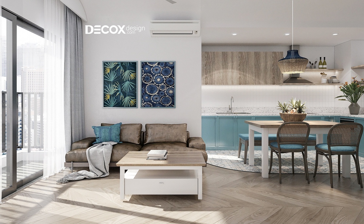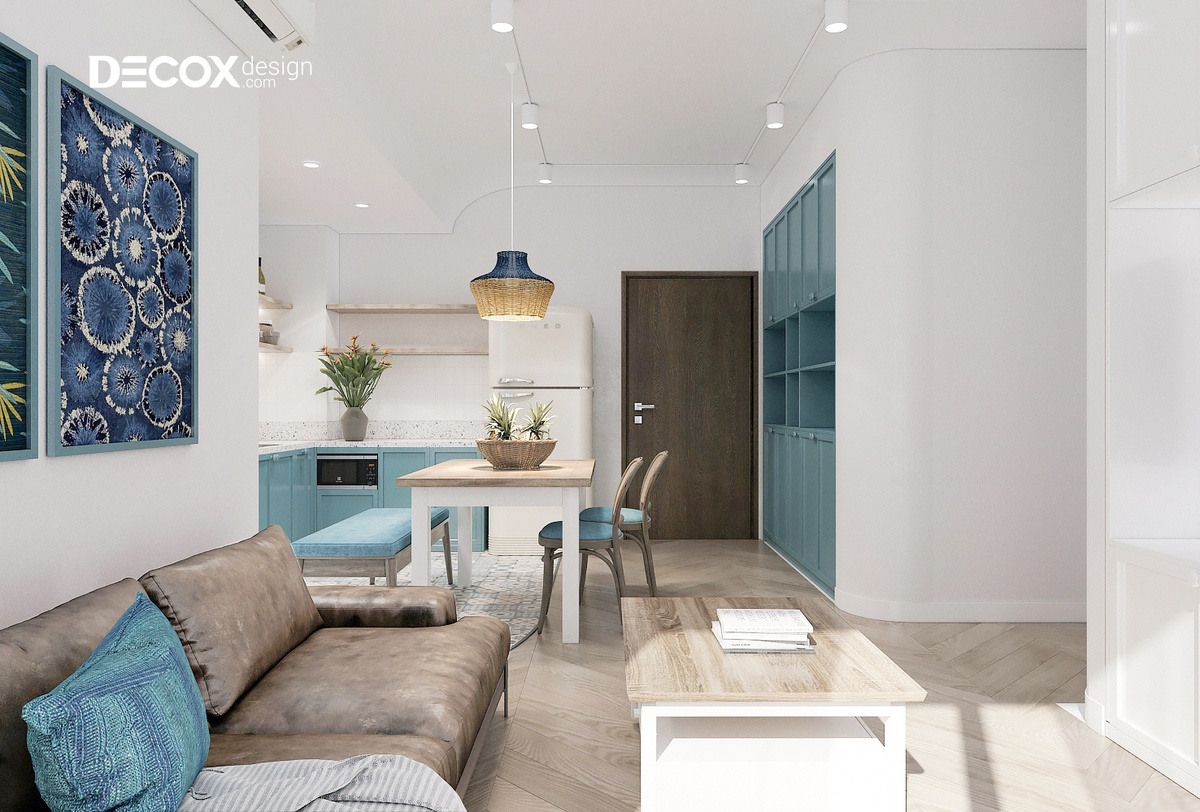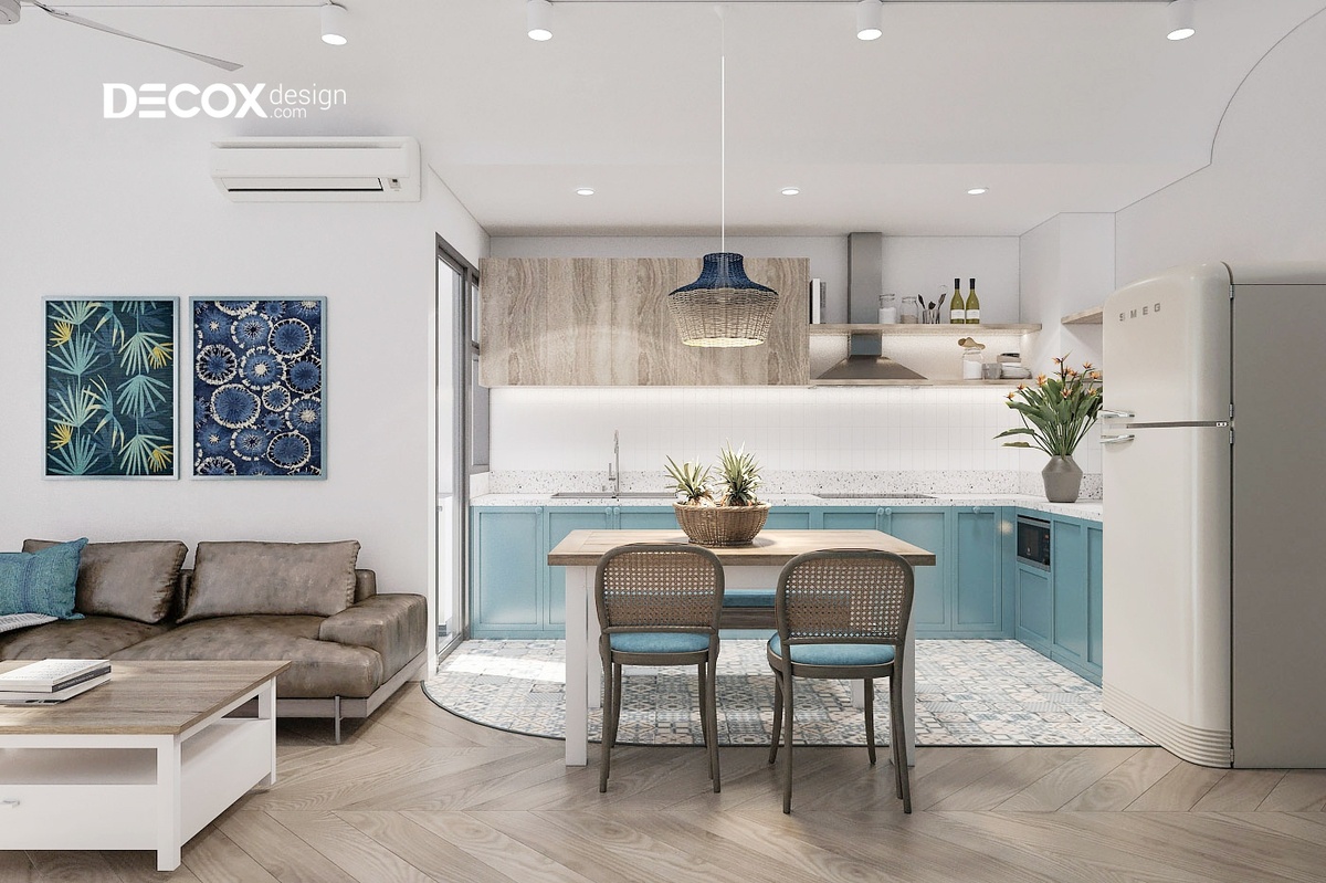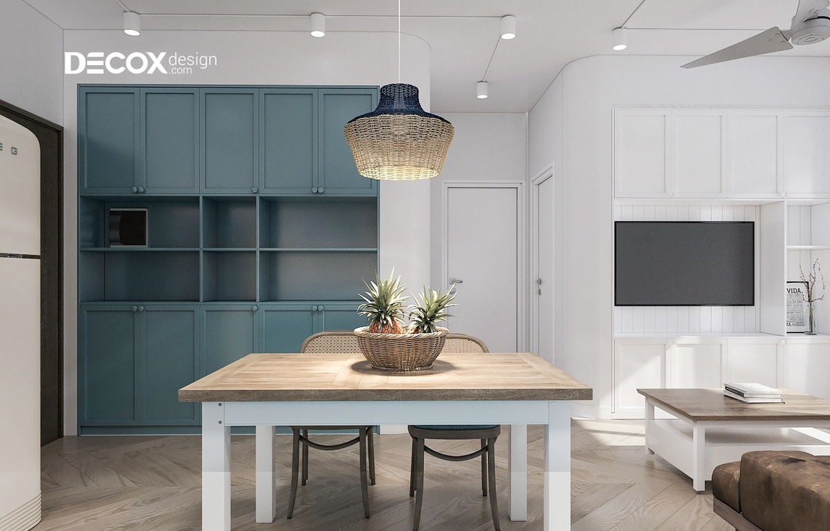 Căn hộ được thiết kế theo phong cách Địa Trung Hải với chất liệu mộc mạc của gỗ, mây tre đan đồng thời kết hợp cùng 2 màu chủ đạo là xanh và trắng mang đến sự gần gũi, yên bình như hương vị tự do, tươi mát của vùng biển.