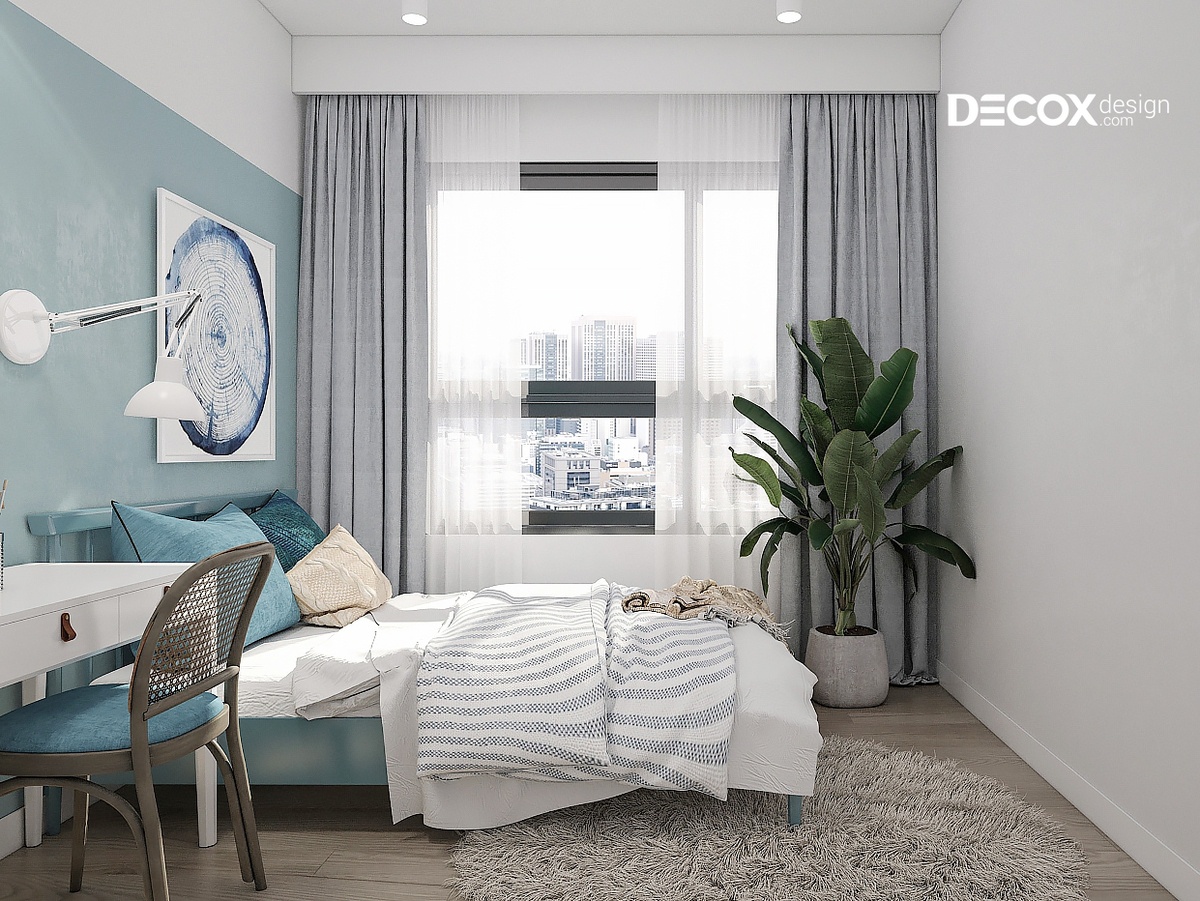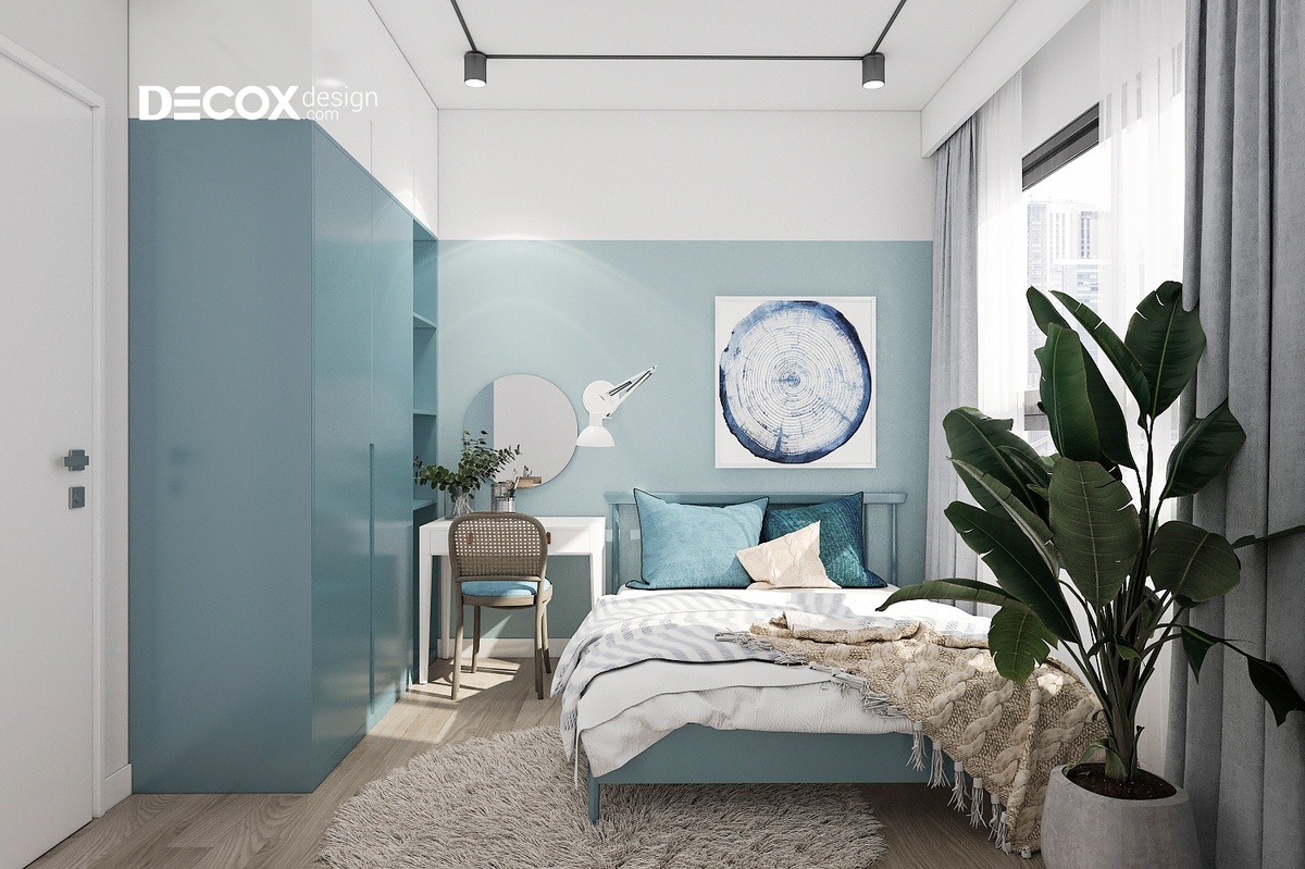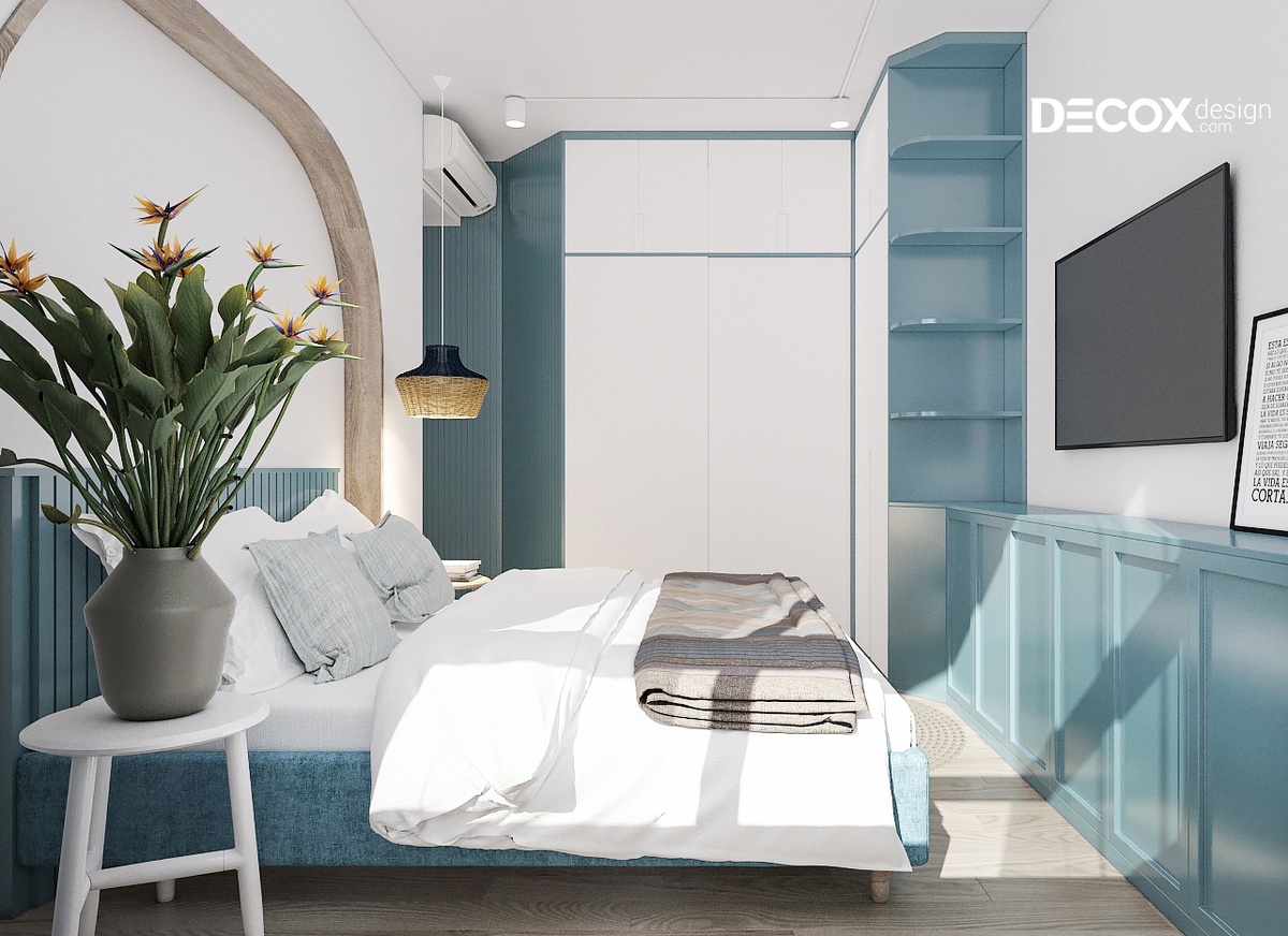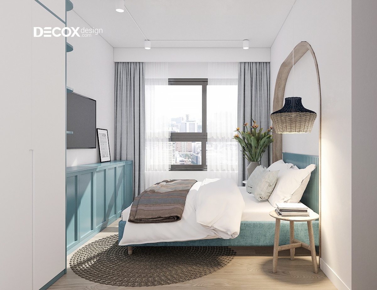 Căn hộ được thiết kế theo phong cách Địa Trung Hải với chất liệu mộc mạc của gỗ, mây tre đan đồng thời kết hợp cùng 2 màu chủ đạo là xanh và trắng mang đến sự gần gũi, yên bình như hương vị tự do, tươi mát của vùng biển.