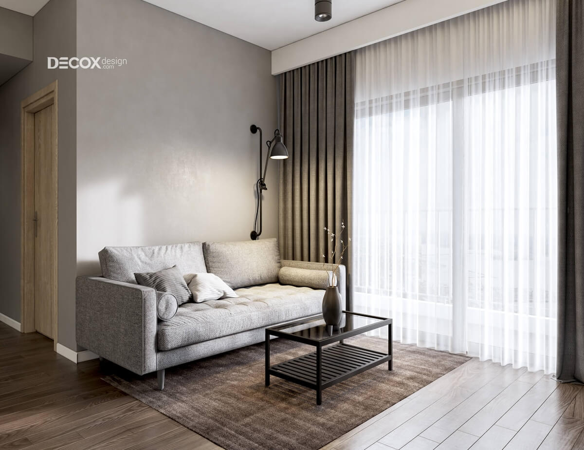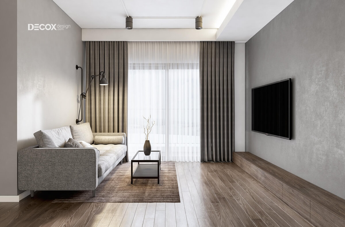 Sự hòa quyện giữa sắc màu ấm áp của sàn gỗ, màu xám sang trọng của tường và màu trắng thanh khiết của trần nhà đã gợi lên một không gian thiết kế nội thất phòng khách quý phái, thời thượng. Để căn phòng không bị đơn điệu tường và trần nhà được Decox Design thiết kế các mẫu đèn lạ mắt vừa để trang trí vừa cung cấp ánh sáng khi cần thiết.