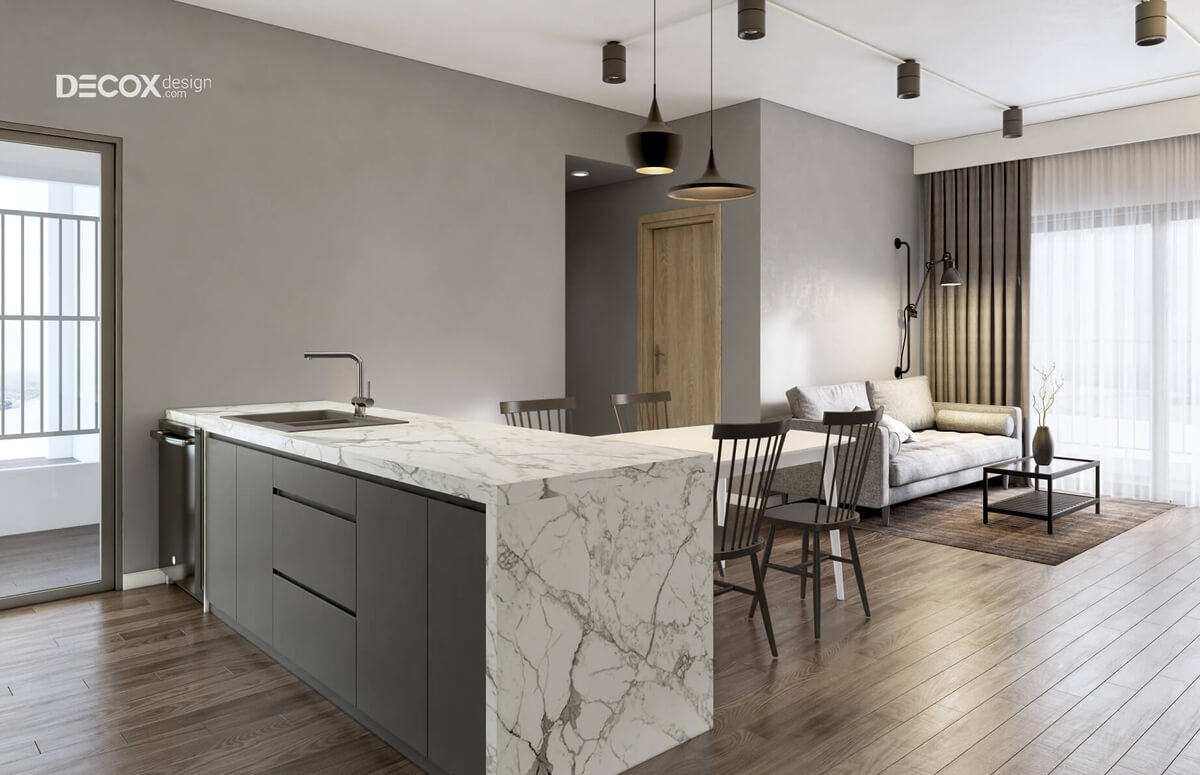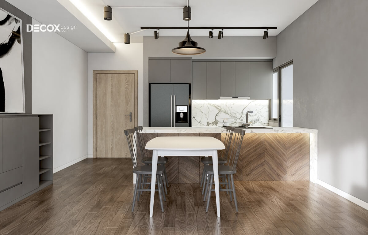 Thiết kế nội thất phòng bếp với quầy bếp và nơi rửa chén dĩa được thiết kế thêm các hộc tủ giúp thuận tiện trong lưu trữ. Màu xám của hệ kệ tủ kết hợp hài hòa với màu trắng của trần nhà. Ngoài ra, việc tích hợp thêm đèn chiếu sáng có tông màu đen mạnh mẽ đã tạo nên một điểm nhấn thú vị trong thiết kế nội thất.